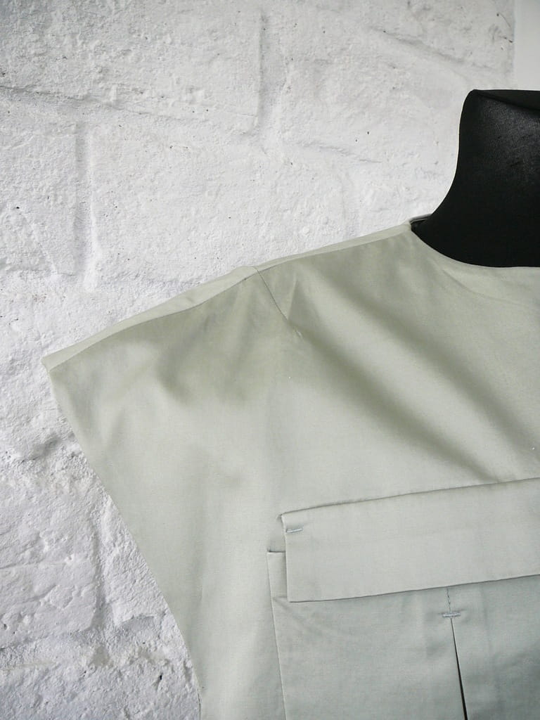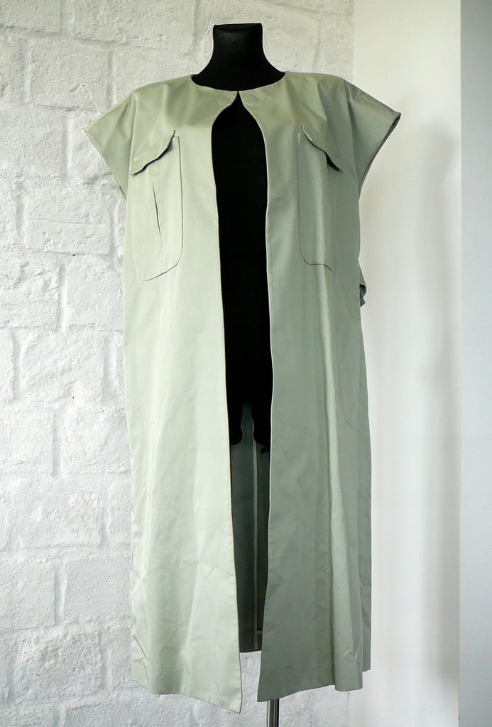 Awangardowa, długa, zapinana na magnes, bladozielona damska kamizelka płaszcz z kieszeniami, bez rękawów - r. uniwersalny - Mango