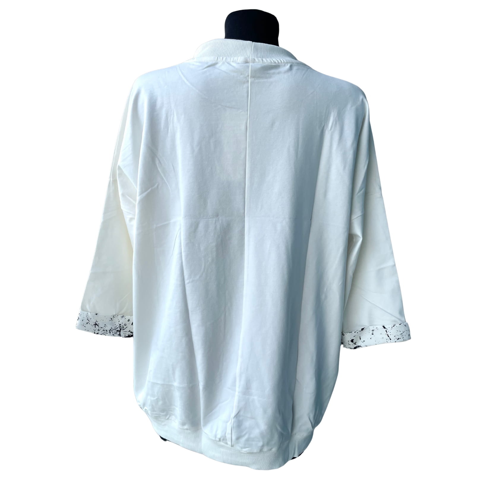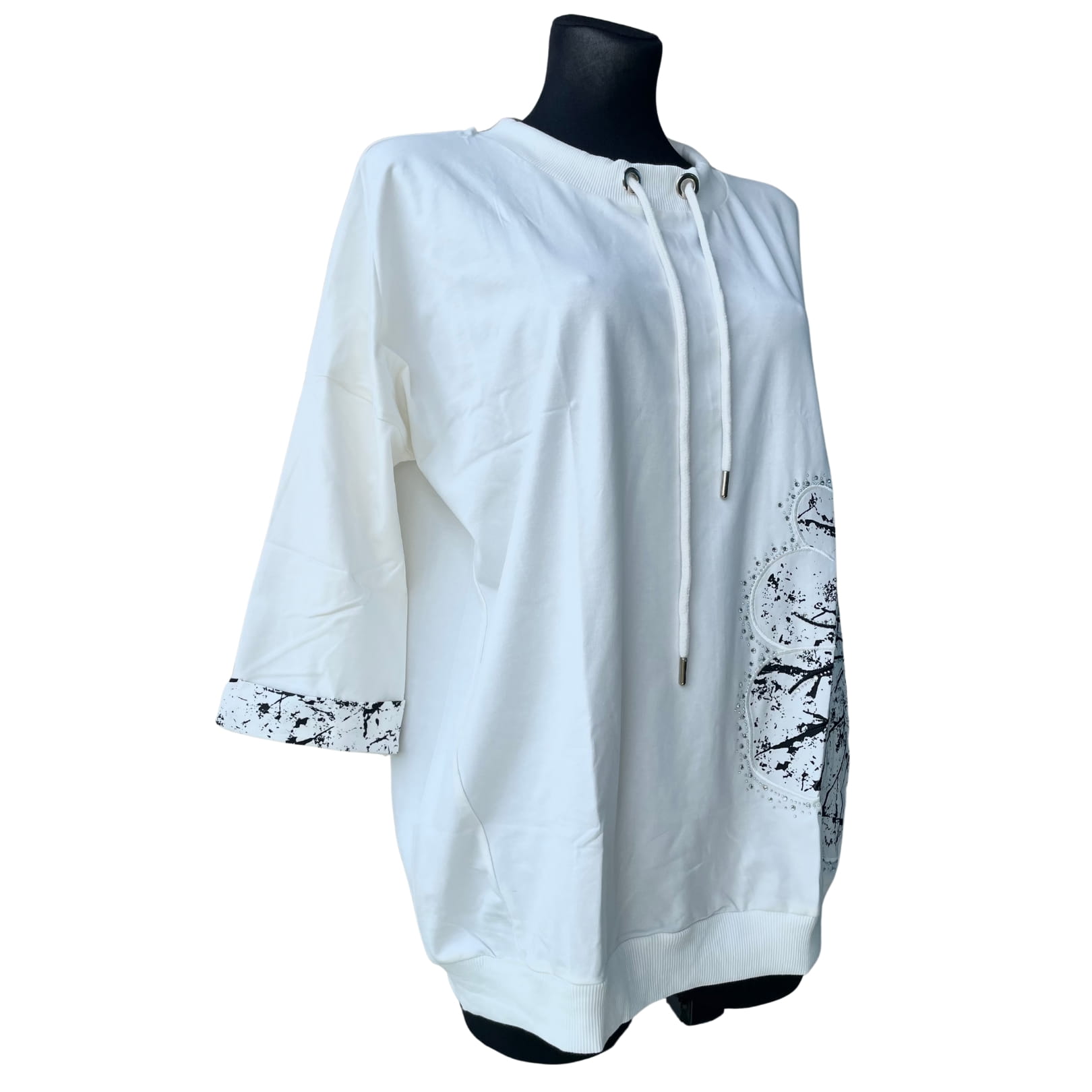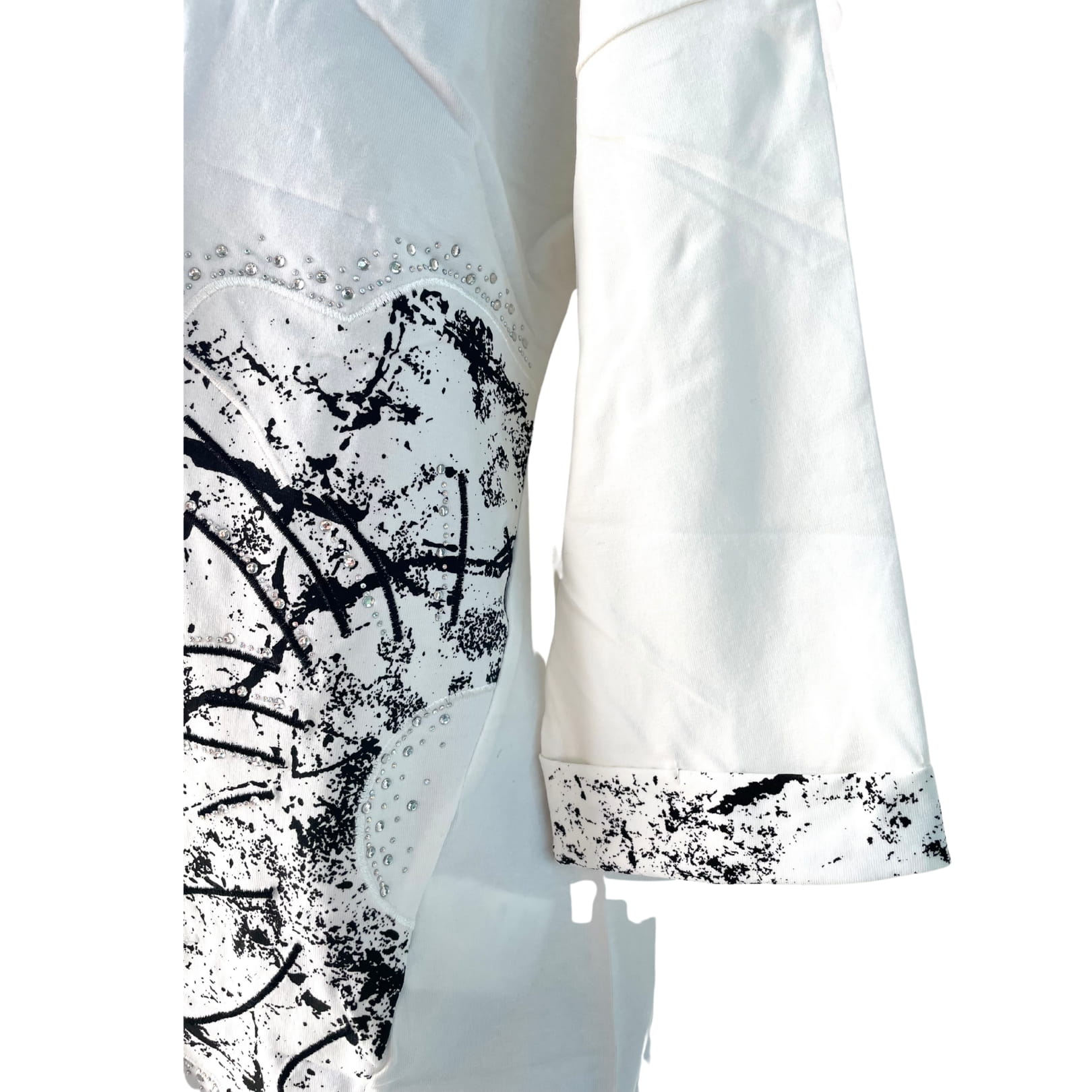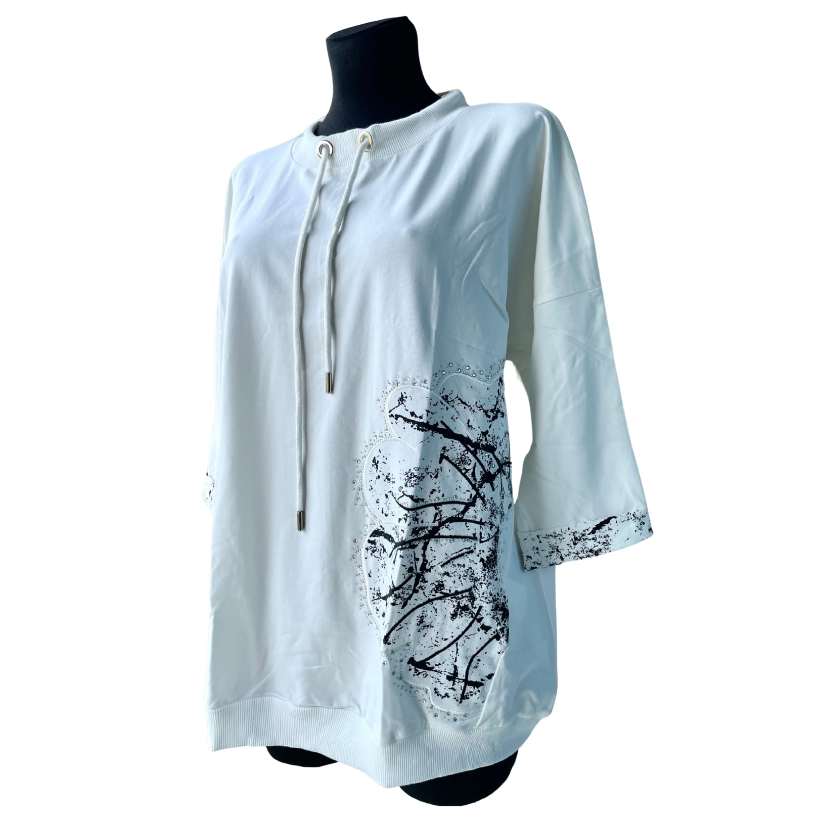 Cienka bluza/ "grubsza" bluzka w kolorze "złamanej bieli" z ozdobnym biało-czarnym kwiatem i srebrnymi cyrkoniami
