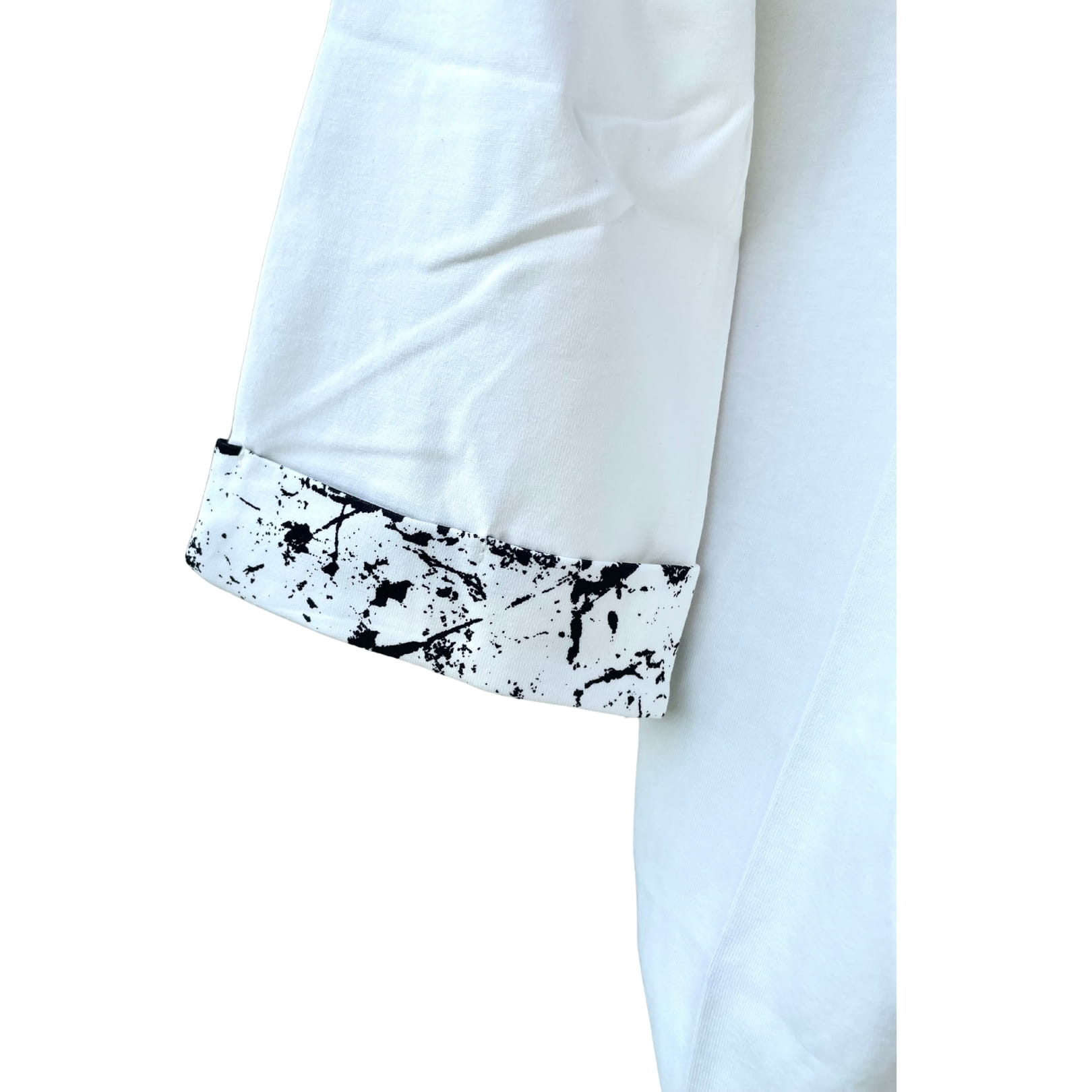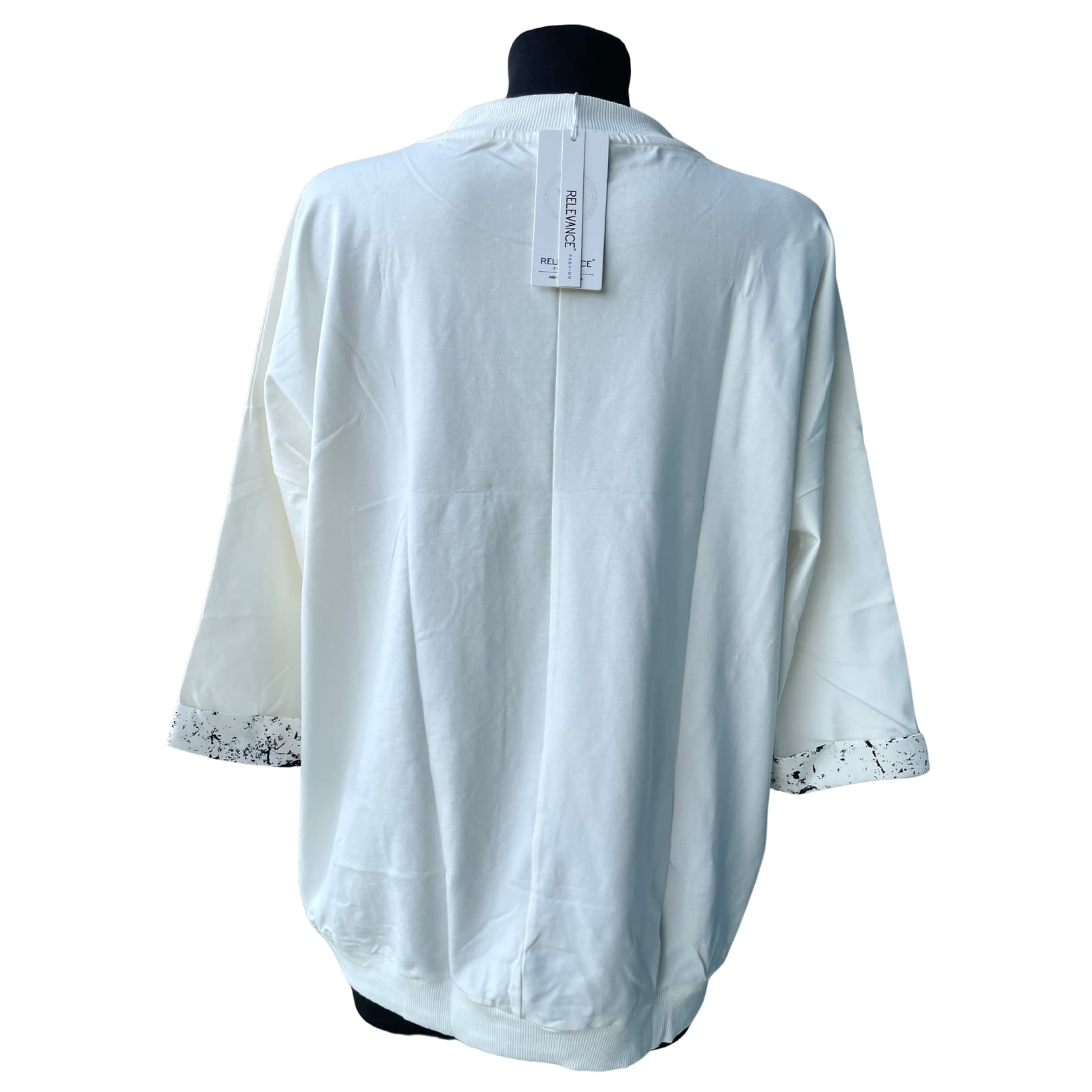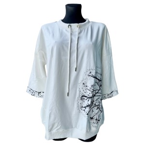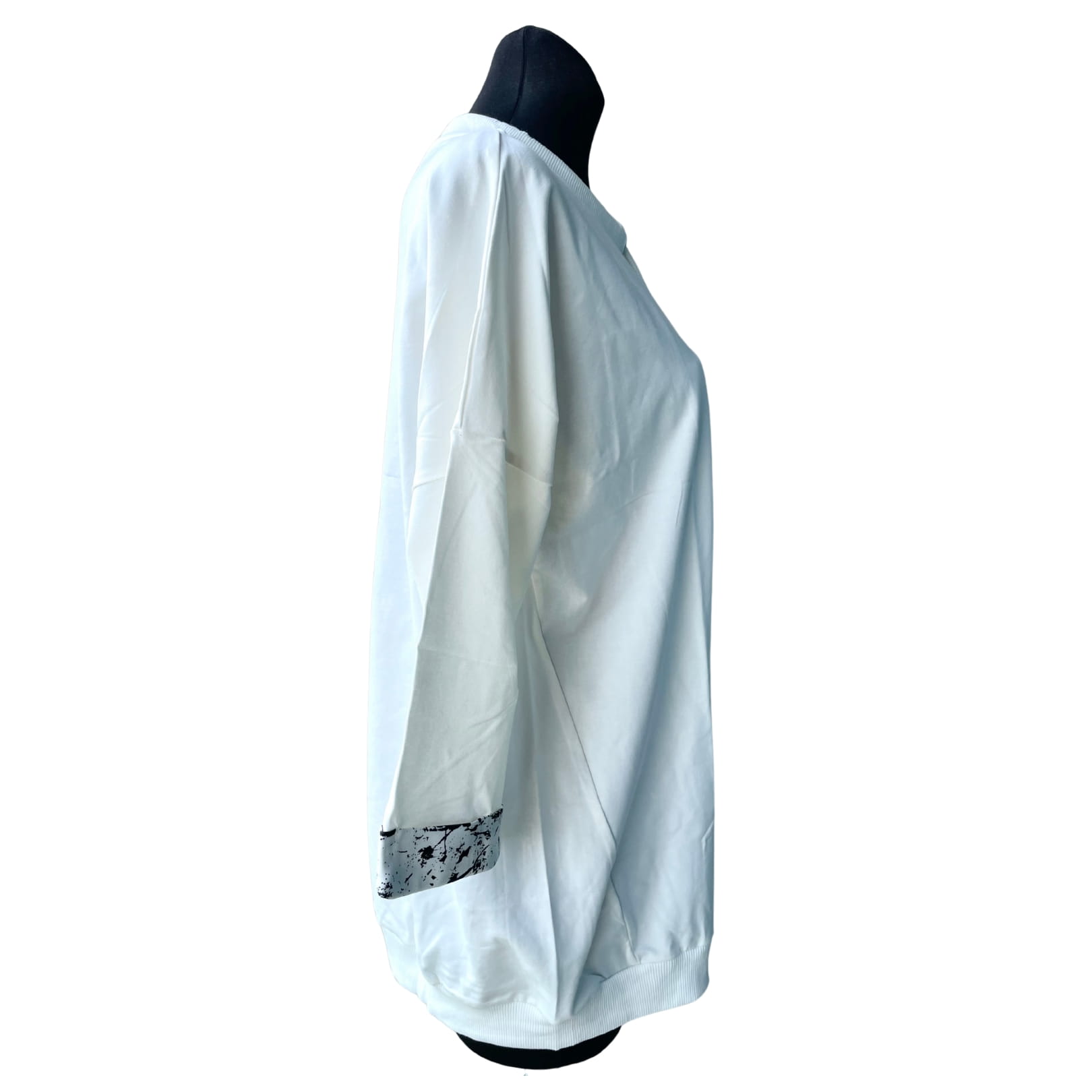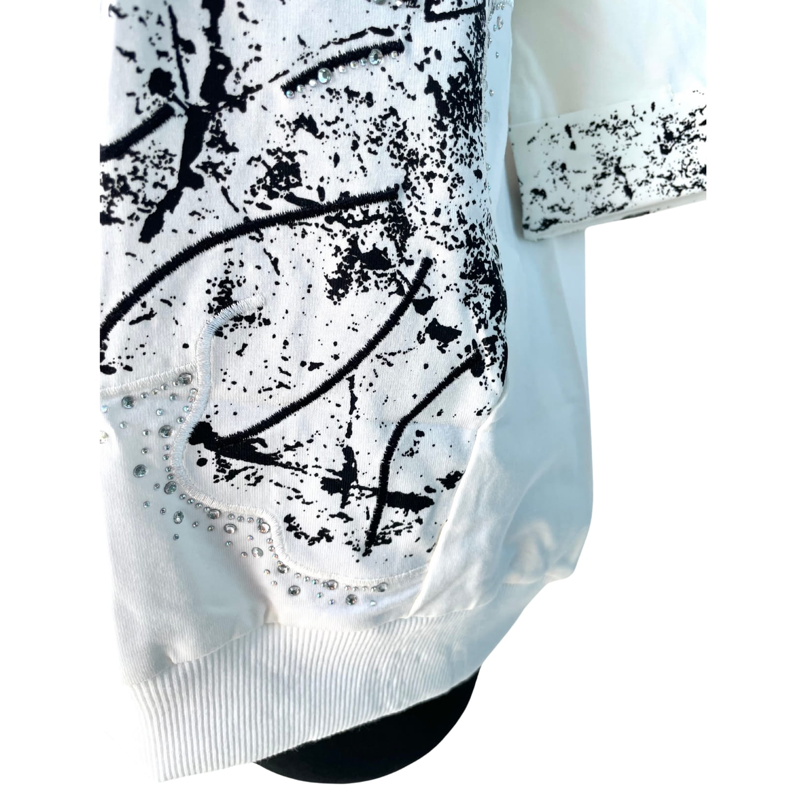 Cienka bluza/ "grubsza" bluzka w kolorze "złamanej bieli" z ozdobnym biało-czarnym kwiatem i srebrnymi cyrkoniami