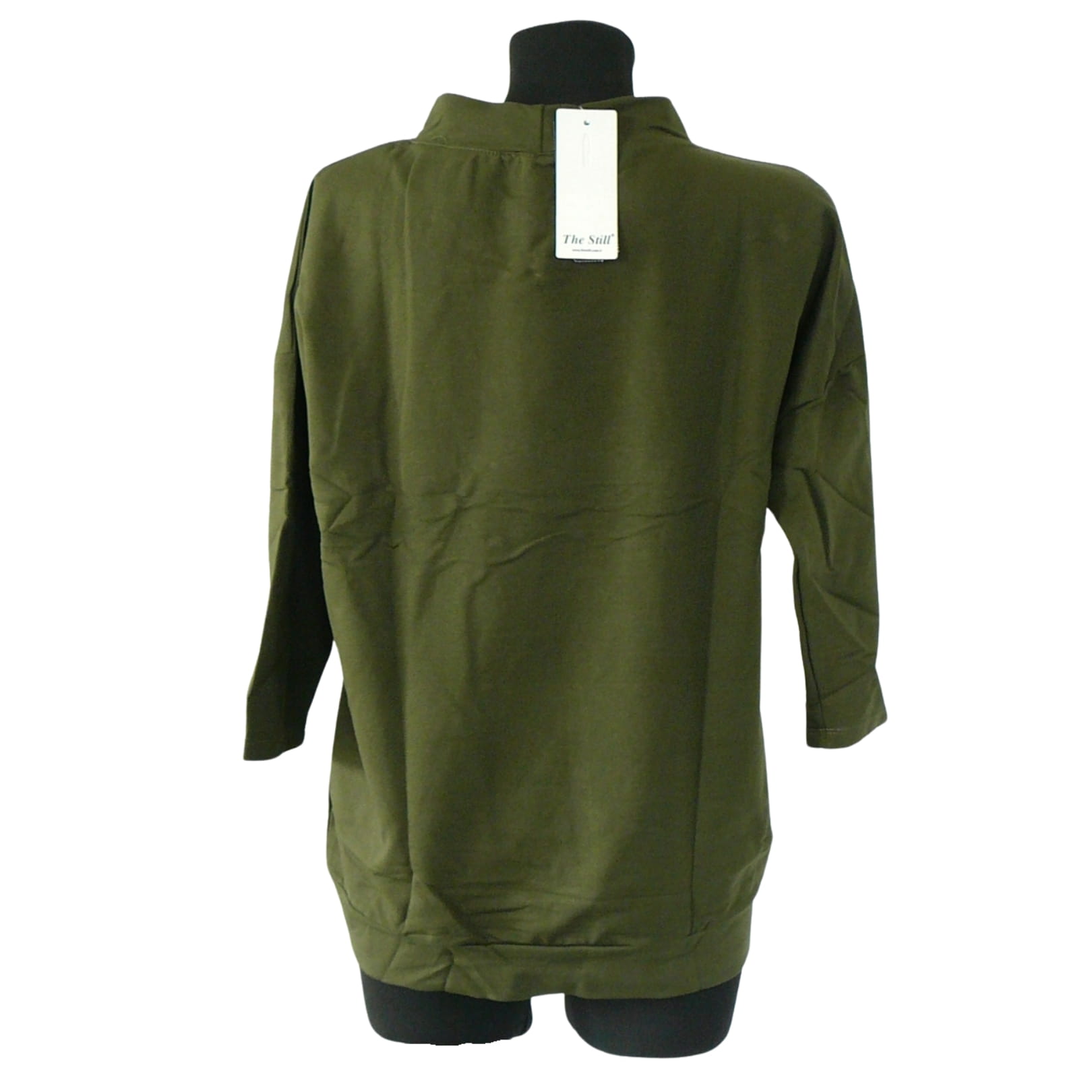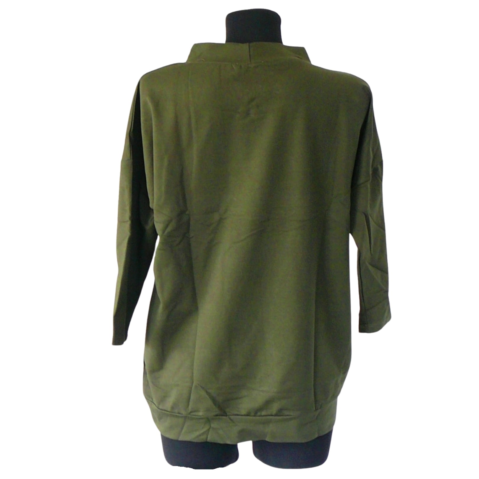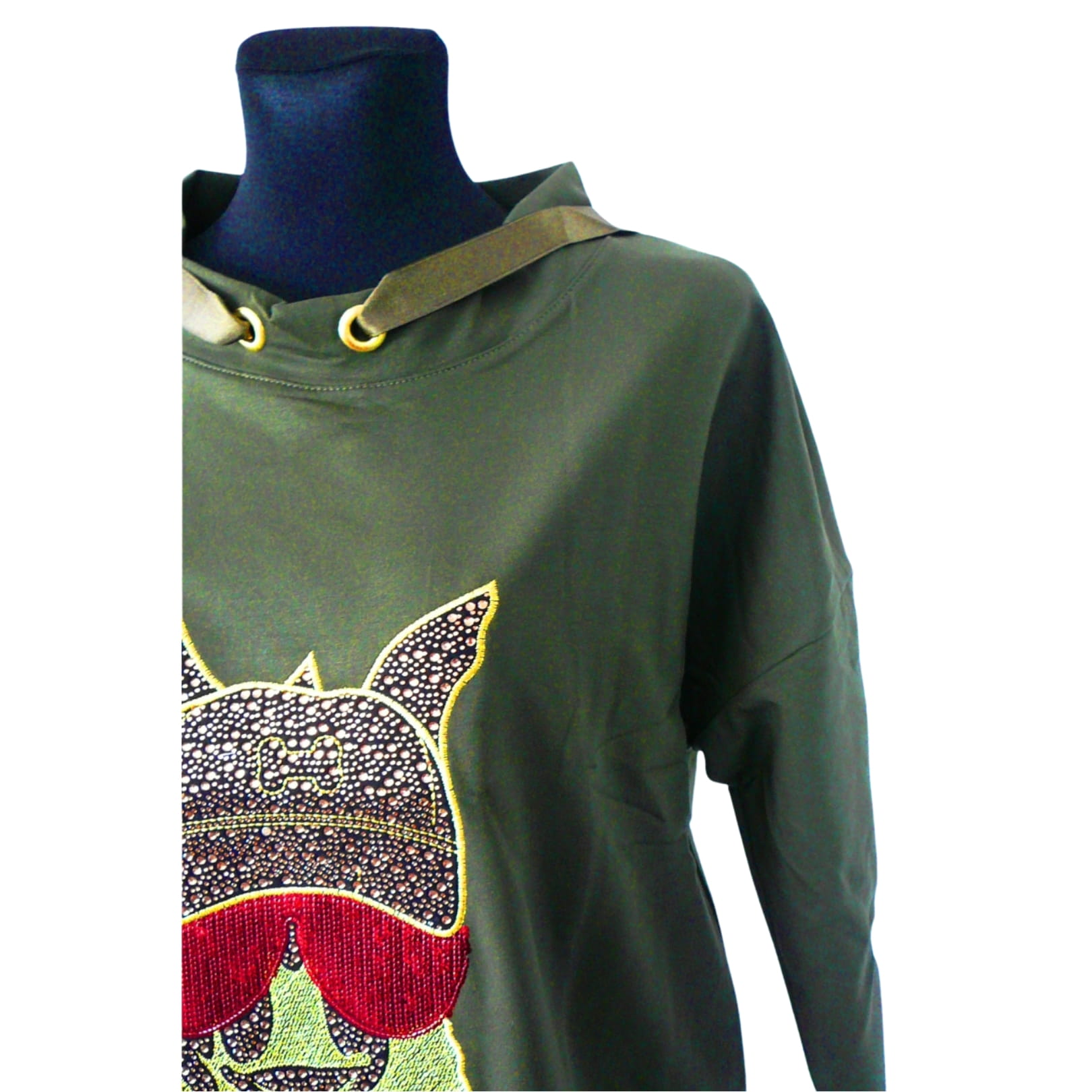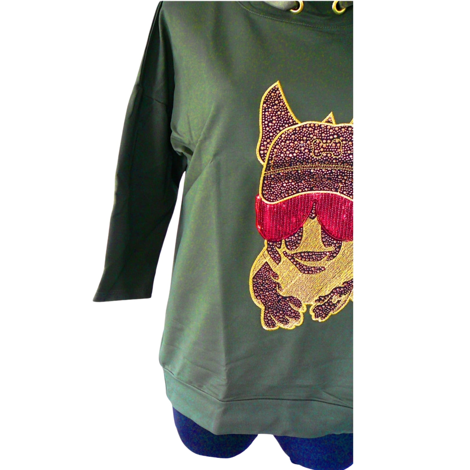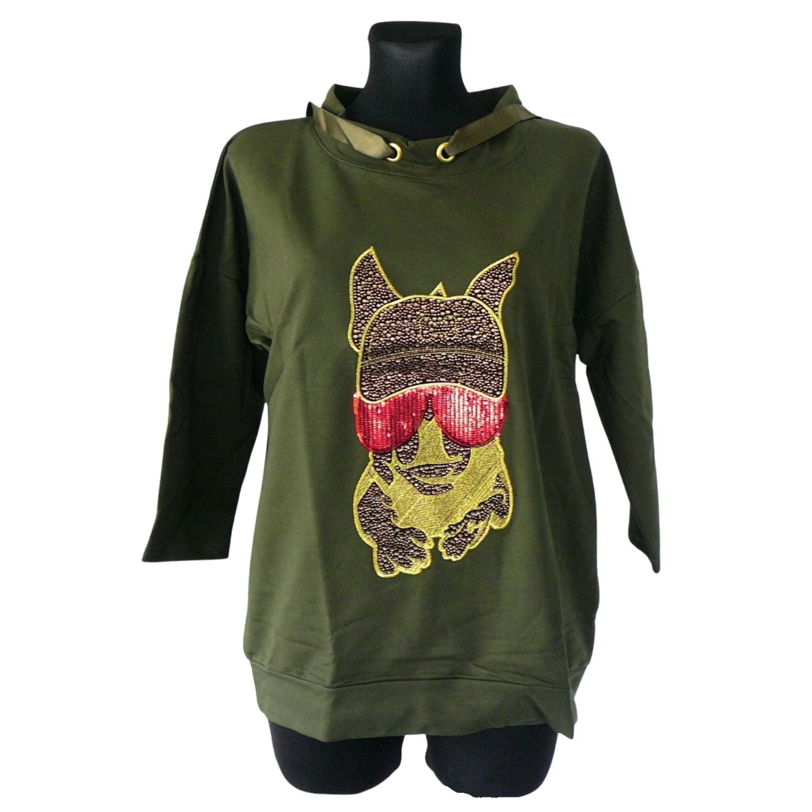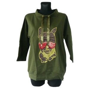 Awangardowa oryginalna damska bluza w kolorze khaki/ zgniłej zieleni, z rękawem 7/8 i cyrkoniową aplikacją z psem - r. uniwersalny