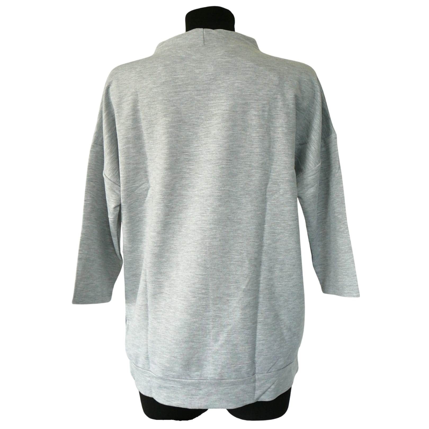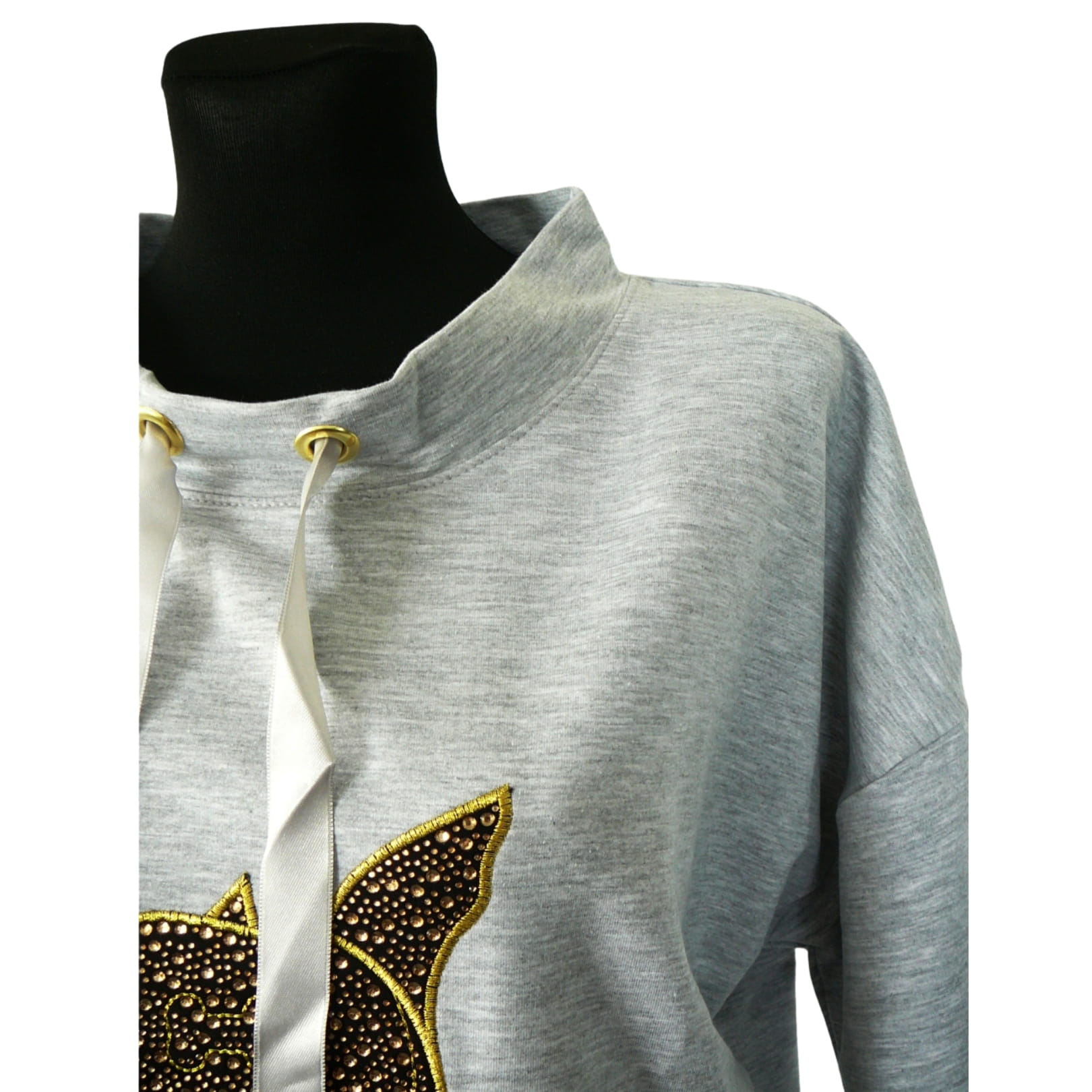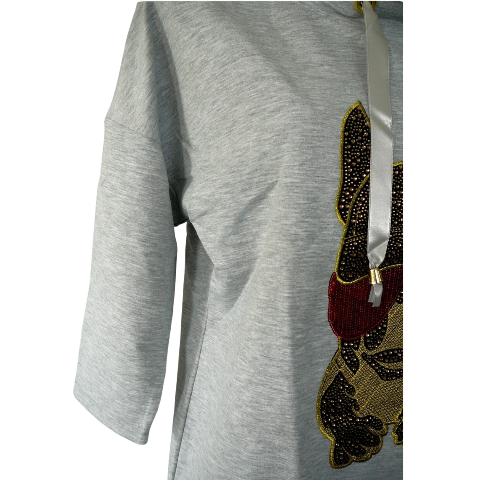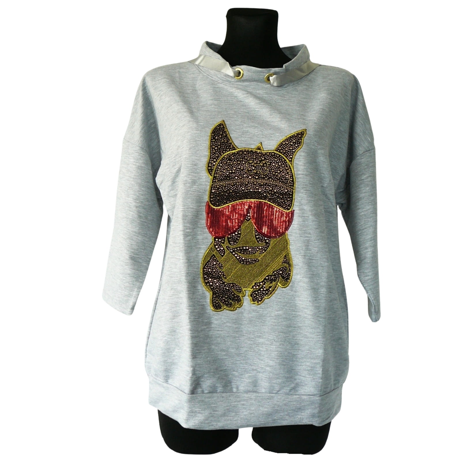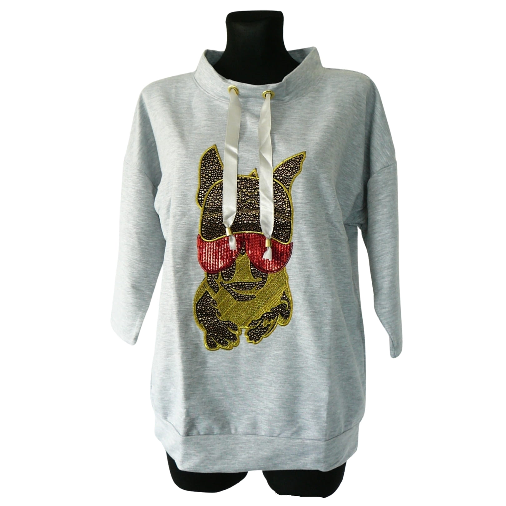 Awangardowa oryginalna jasnoszara damska bluza z rękawem 7/8 i cyrkoniową aplikacją z psem - r. uniwersalny