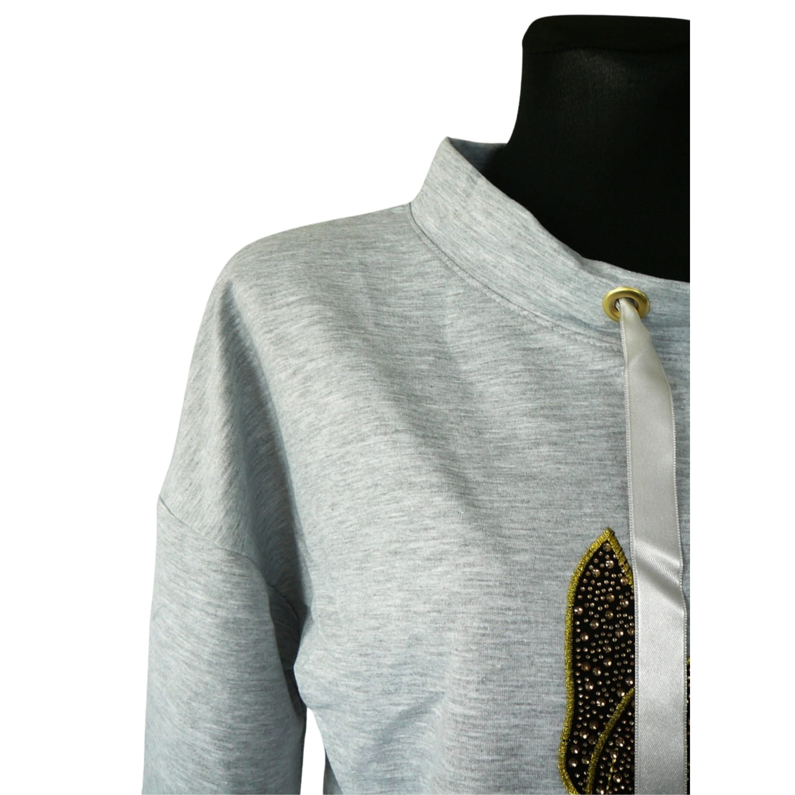 - przy szyi ozdobna taśma o szerokości ok. 2 cm, umożliwiająca ściągnięcie bluzy przy szyi