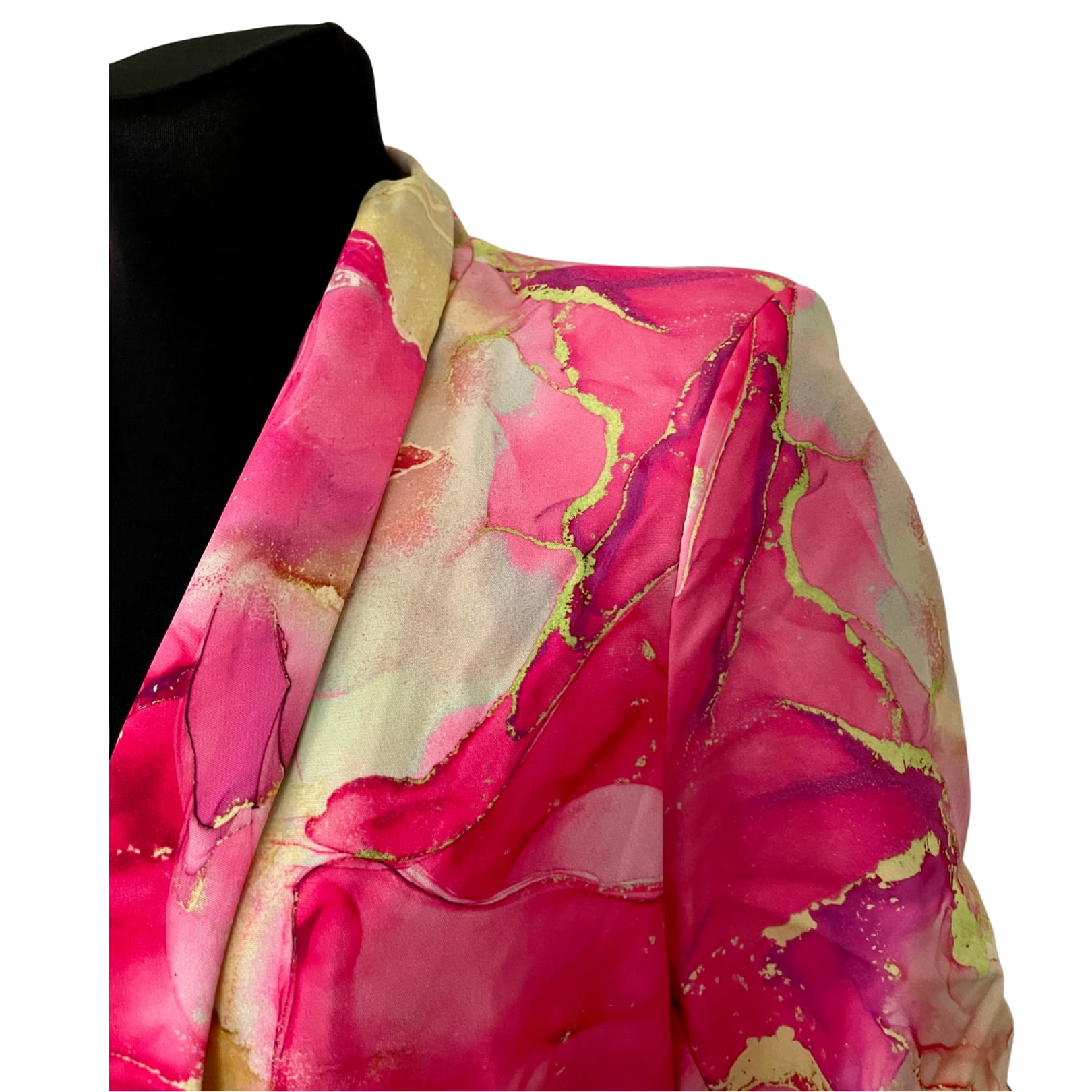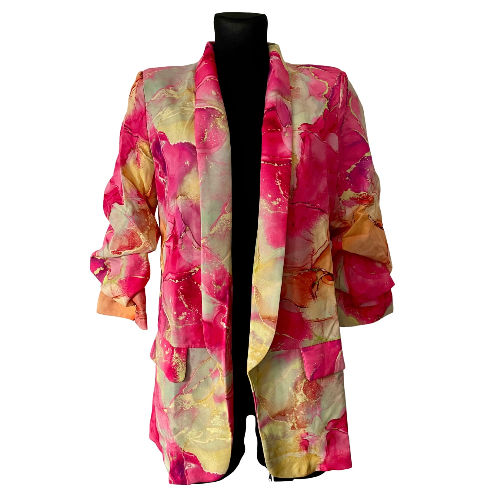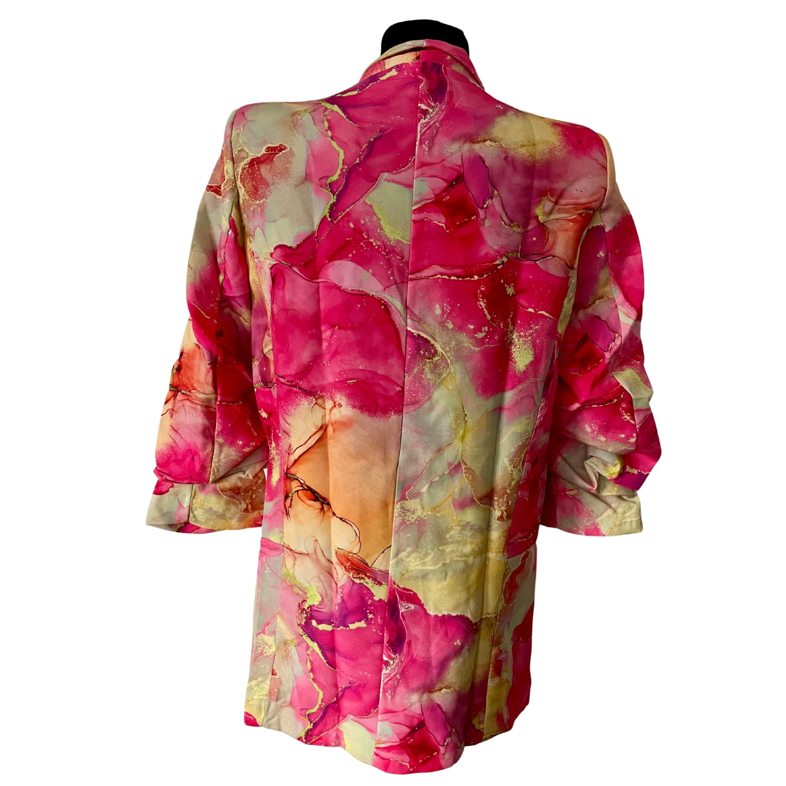 Awangardowa włoska damska marynarka różowo-żółta, z marszczonymi rękawami 7/8 - r. uniwersalny