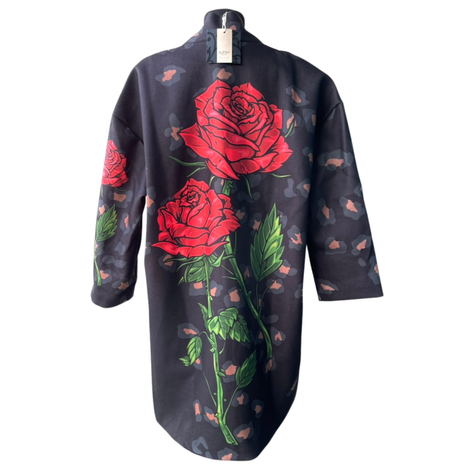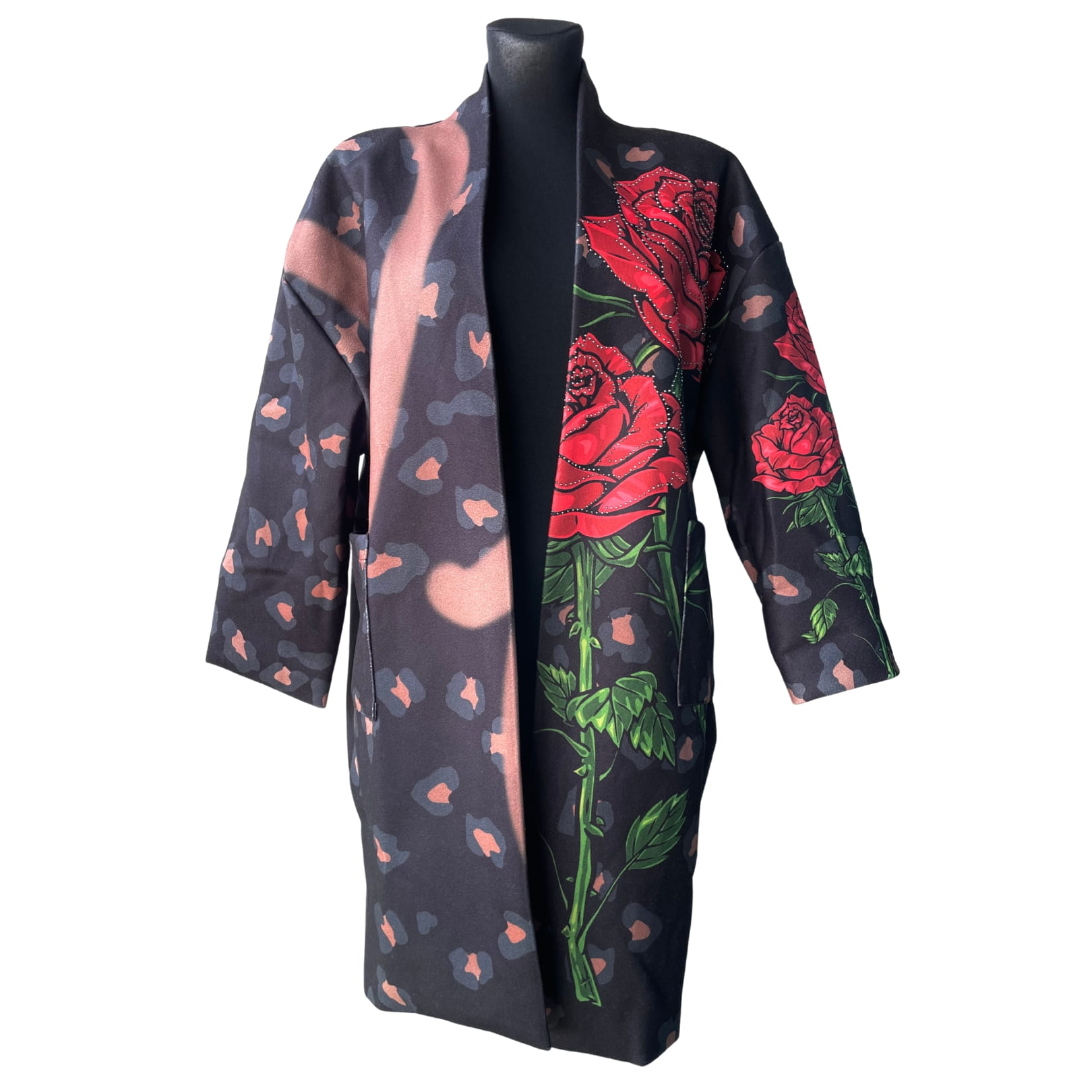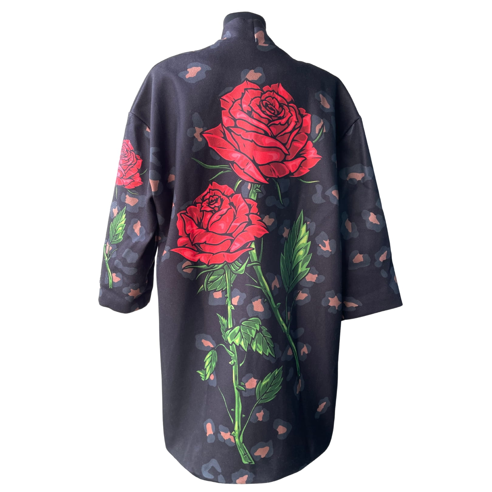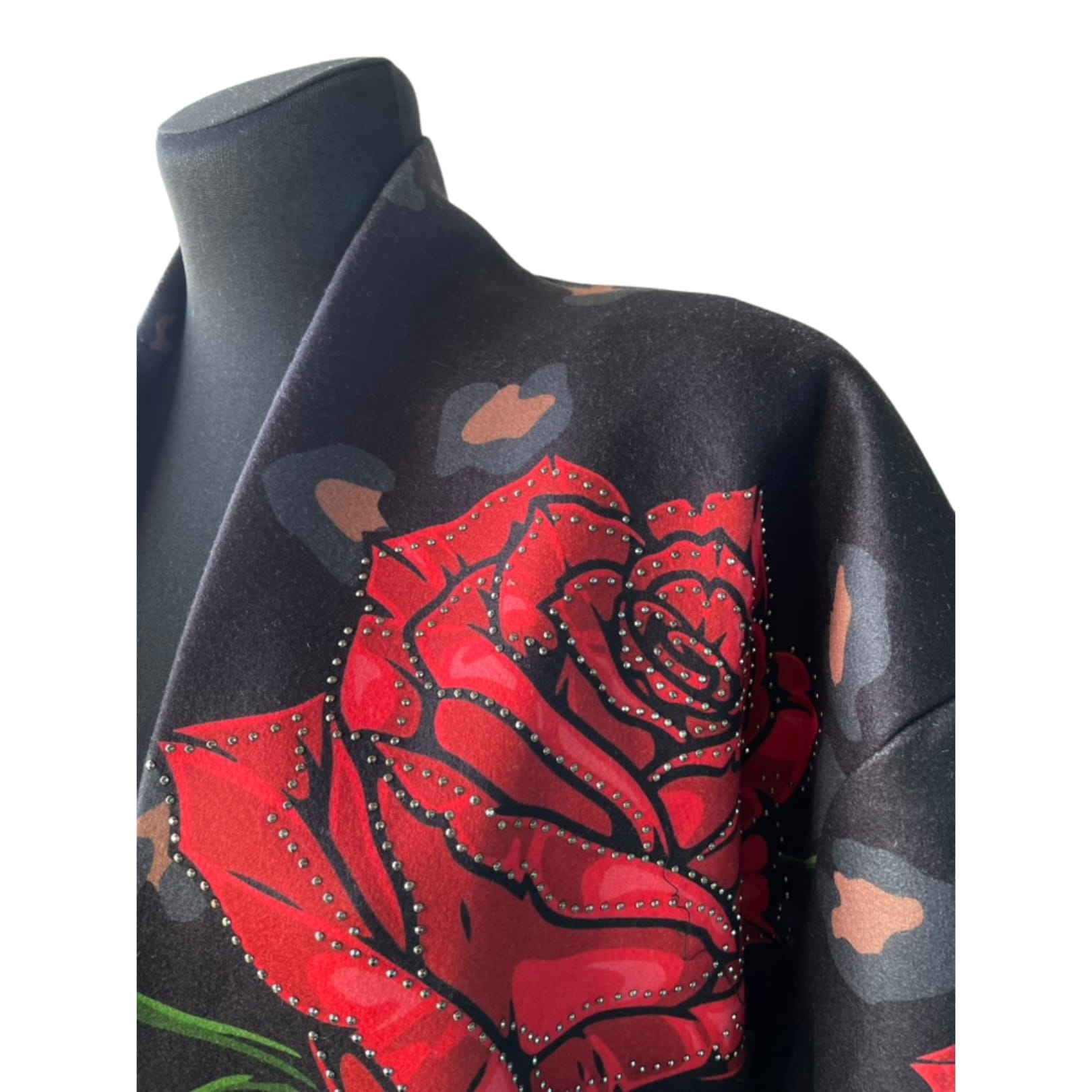 Awangardowy damski włoski czarny płaszcz w panterkę z aplikacją w róże, z podszewką, kieszeniami i rękawem 7/8 - r. uniwersalny
