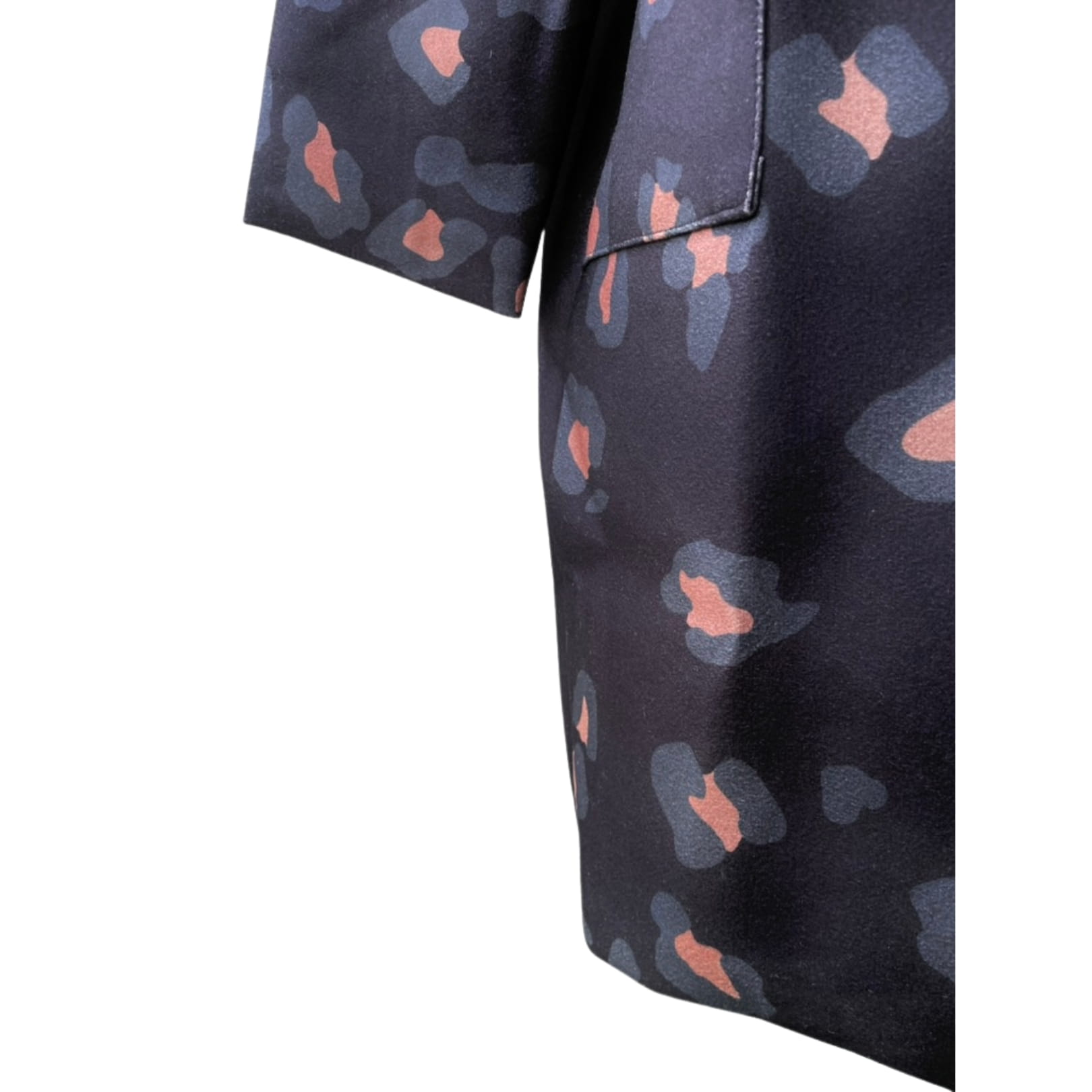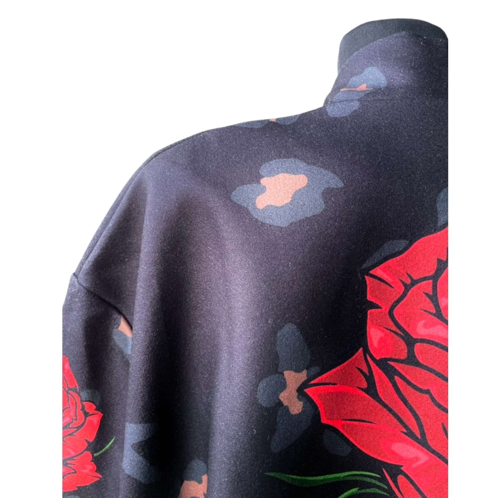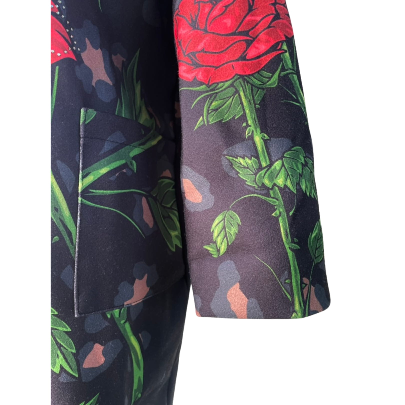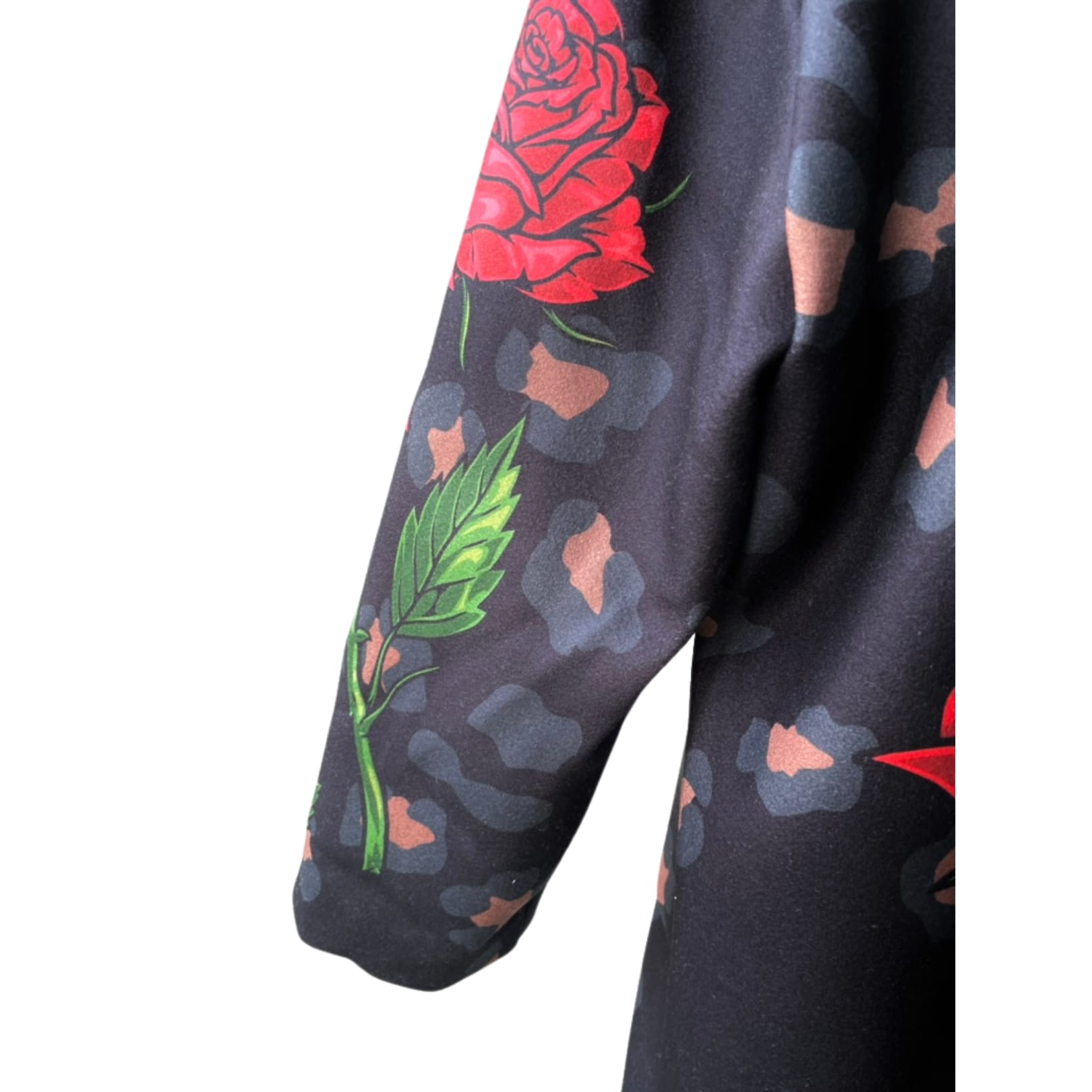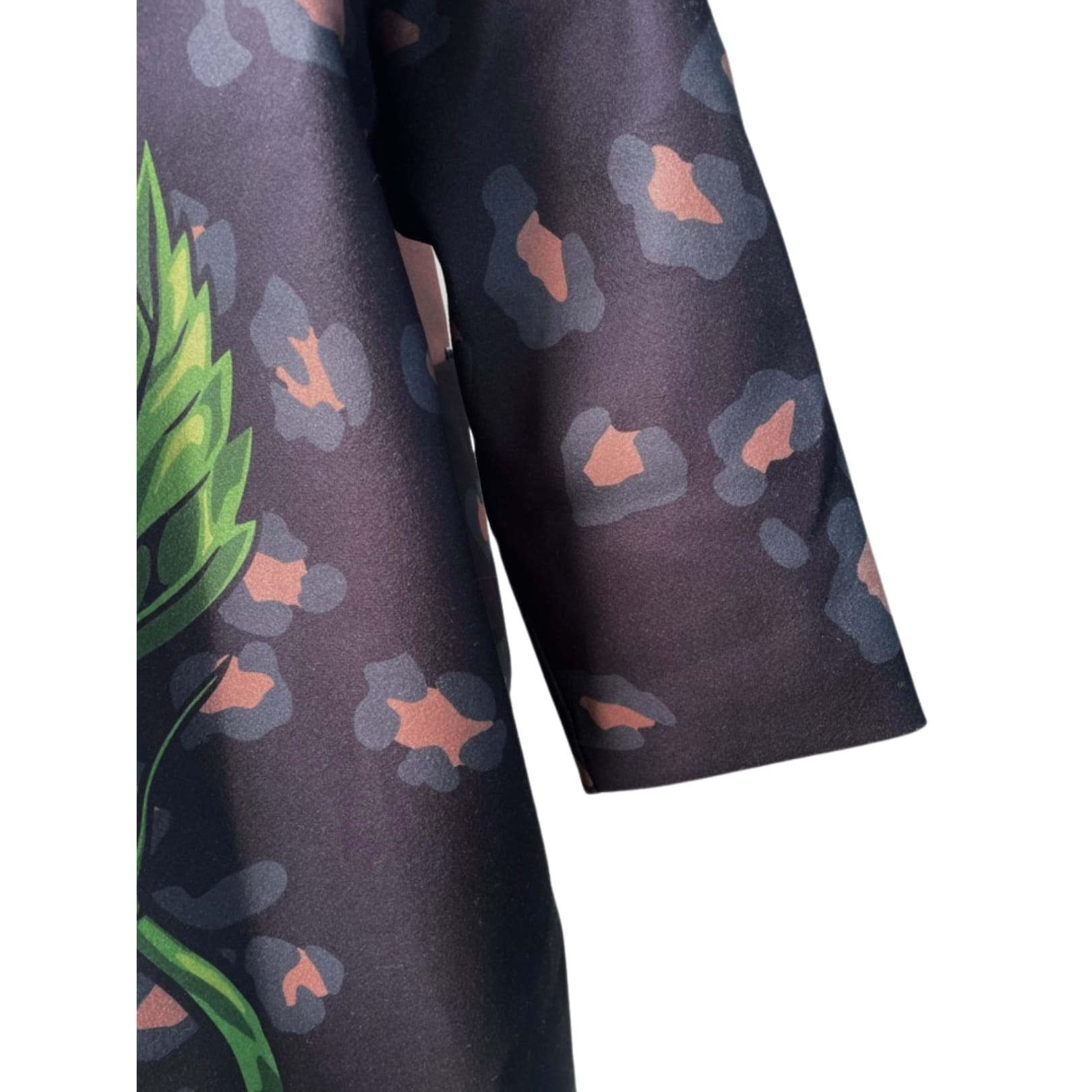 Awangardowy damski włoski czarny płaszcz w panterkę z aplikacją w róże, z podszewką, kieszeniami i rękawem 7/8 - r. uniwersalny