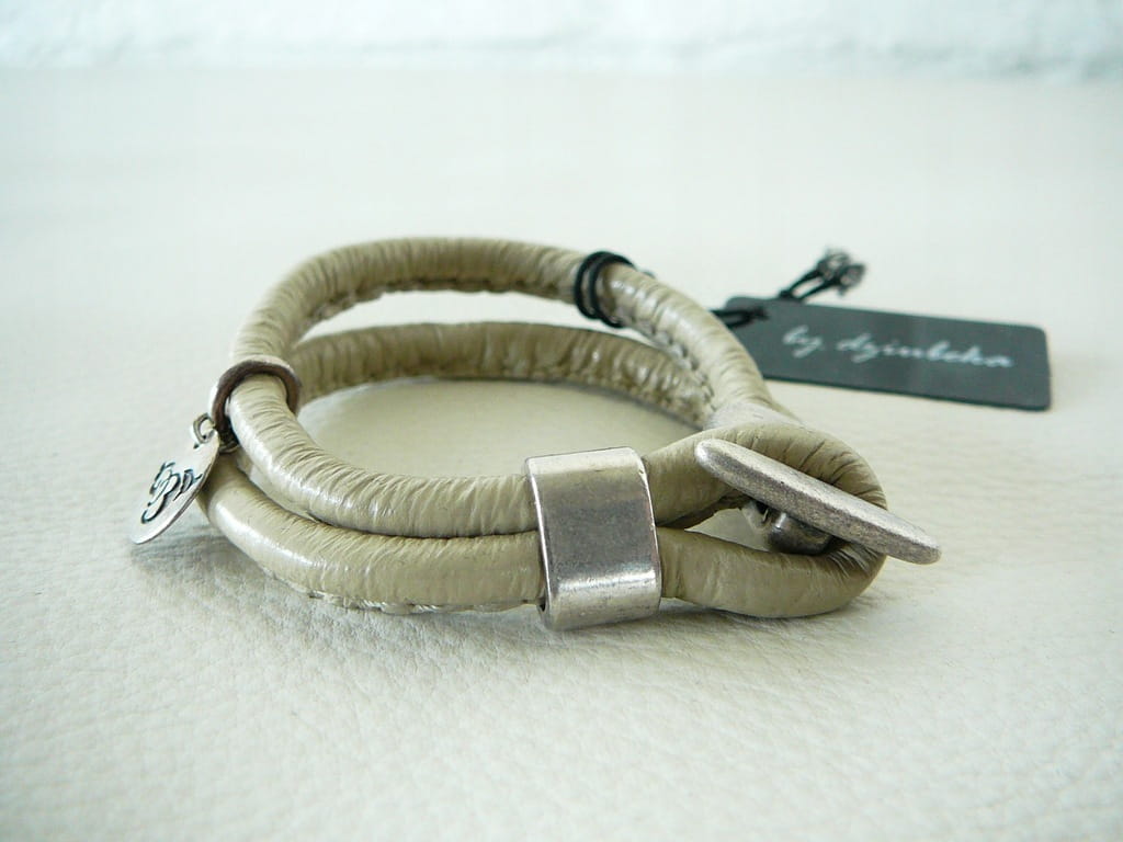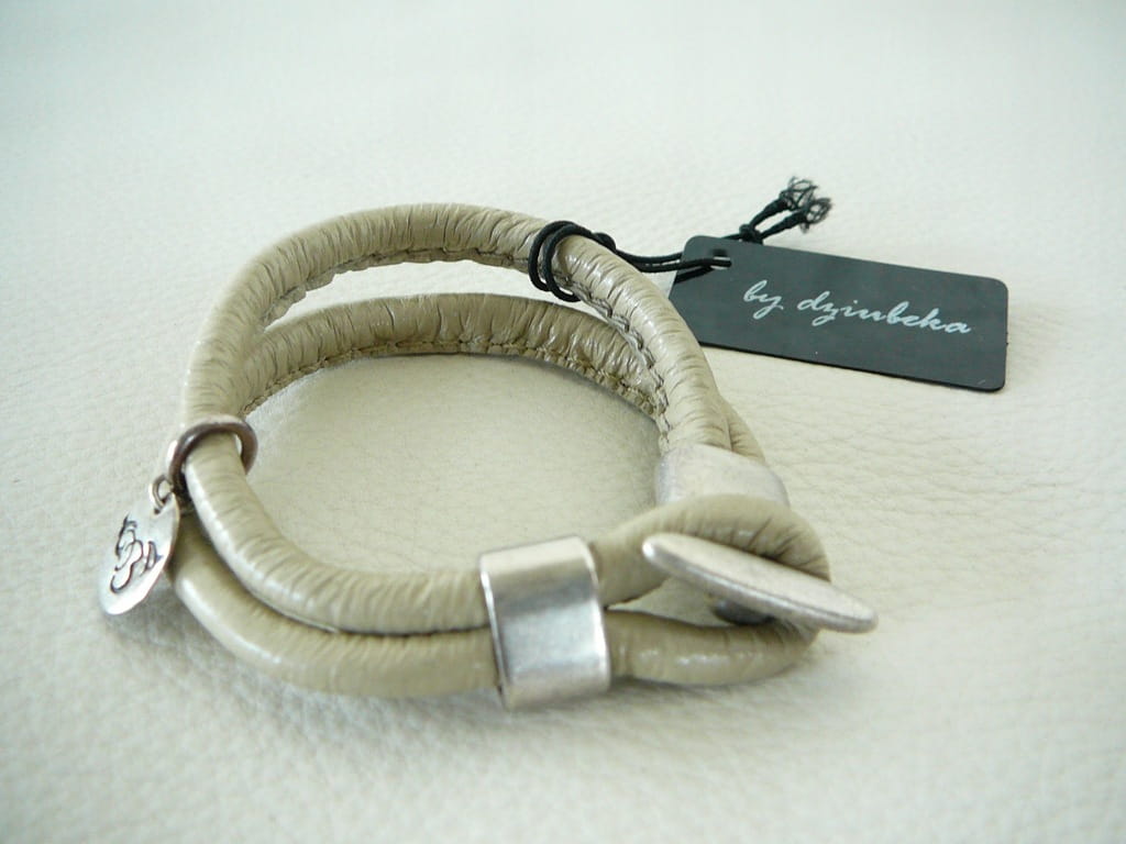 Beżowa, oryginalna skórzana damska bransoletka ze srebrnym zapięciem, z miękkiej naturalnej skóry - by Dziubeka