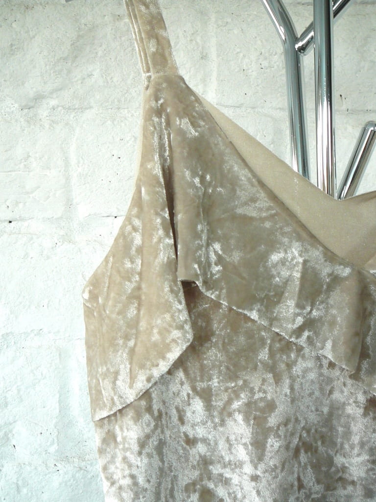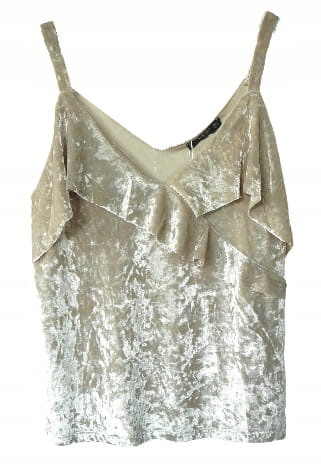 Beżowy kremowy elegancki welurowy letni damski top na ramiączkach, z falbaną przy dekolcie - rozmiar 38 M - Mango