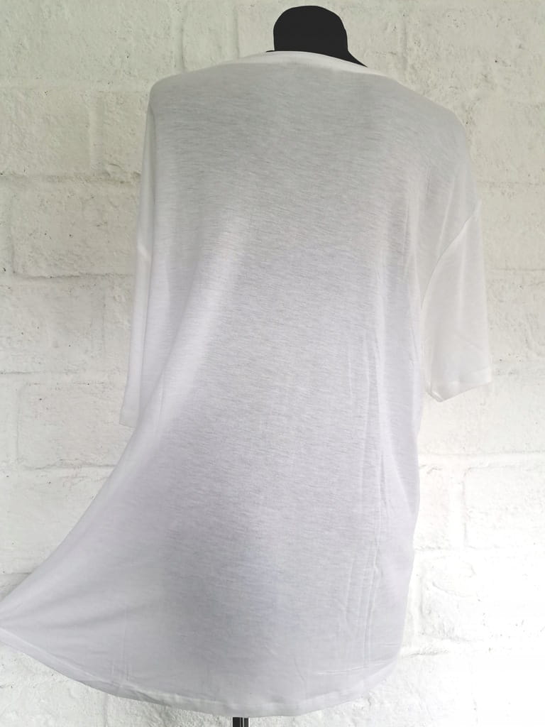 *** UWAGA! Bluzka posiada drobny defekt: z tyłu na samym dole od wewnętrznej strony posiada drobne fabryczne zabrudzenia od farby drukarskiej. Zabrudzenie jest niemal niewidoczne na zewnątrz, można je zauważyć jedynie od środka. Załączyliśmy rzeczywiste zdjęcia ukazujące opisany defekt (ostatnia fotografia przedstawia dół bluzki wywinięty na lewą stronę). W związku z powyższym, cena bluzki została obniżona. ***