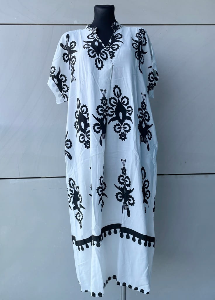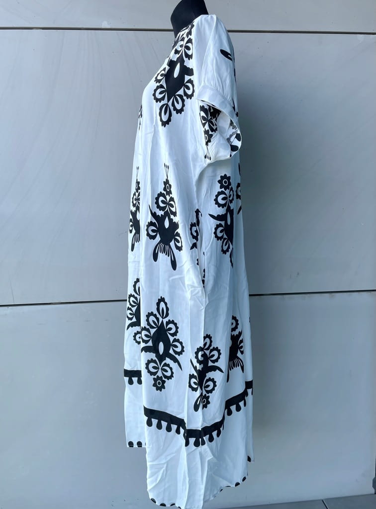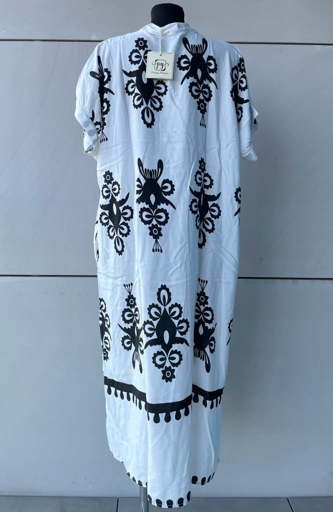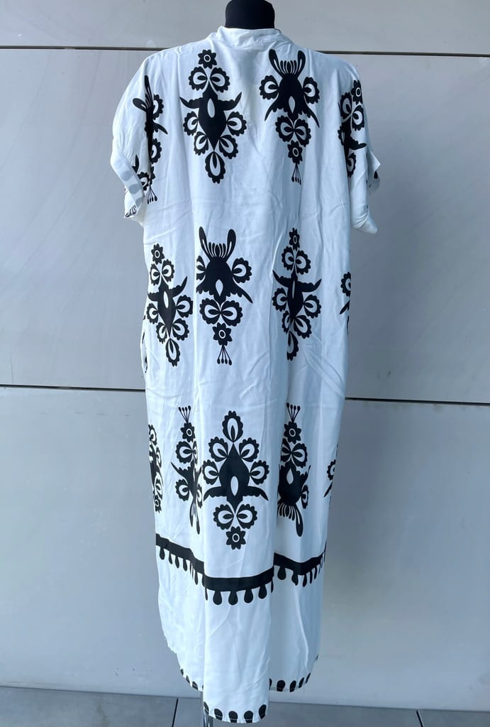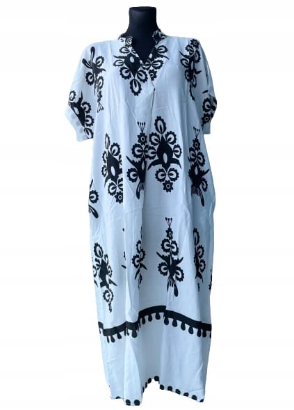 Biało-czarna długa włoska letnia koszulowa sukienka we wzory, z kieszeniami i krótkim rękawem - r. uniwersalny