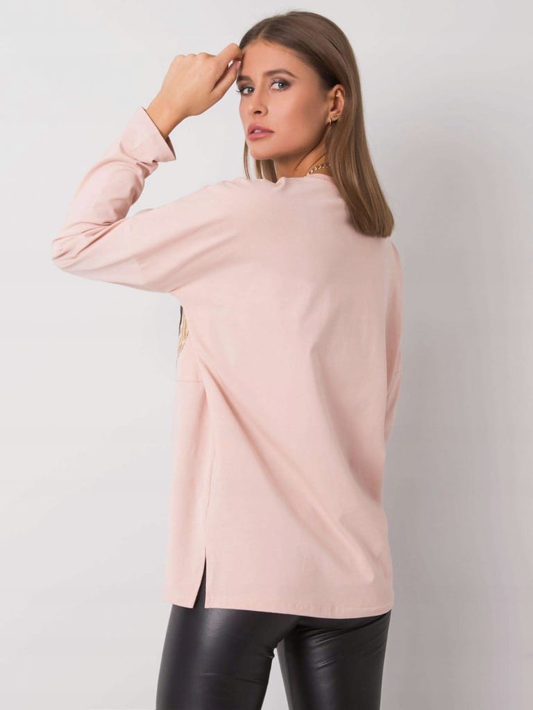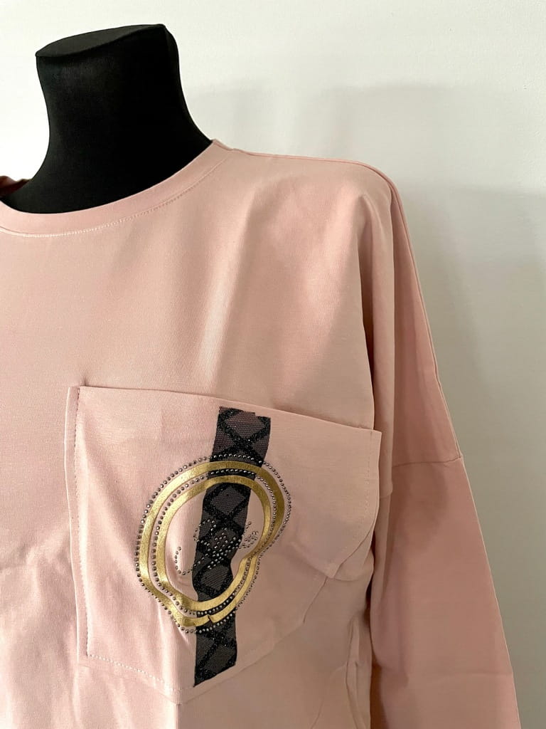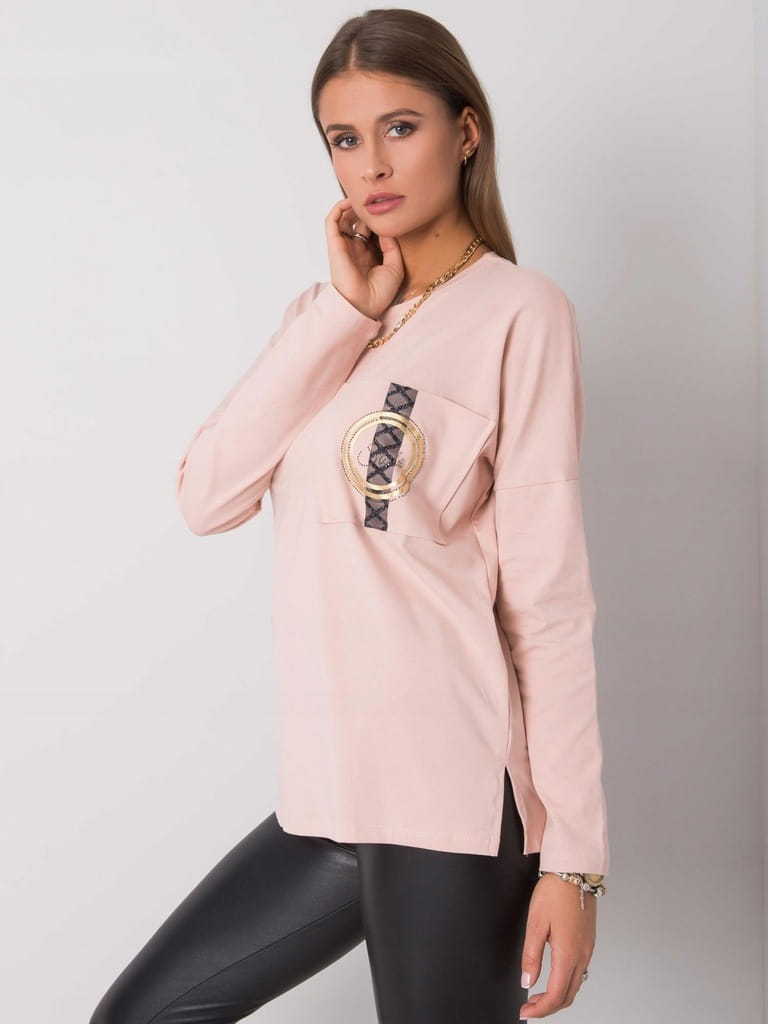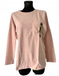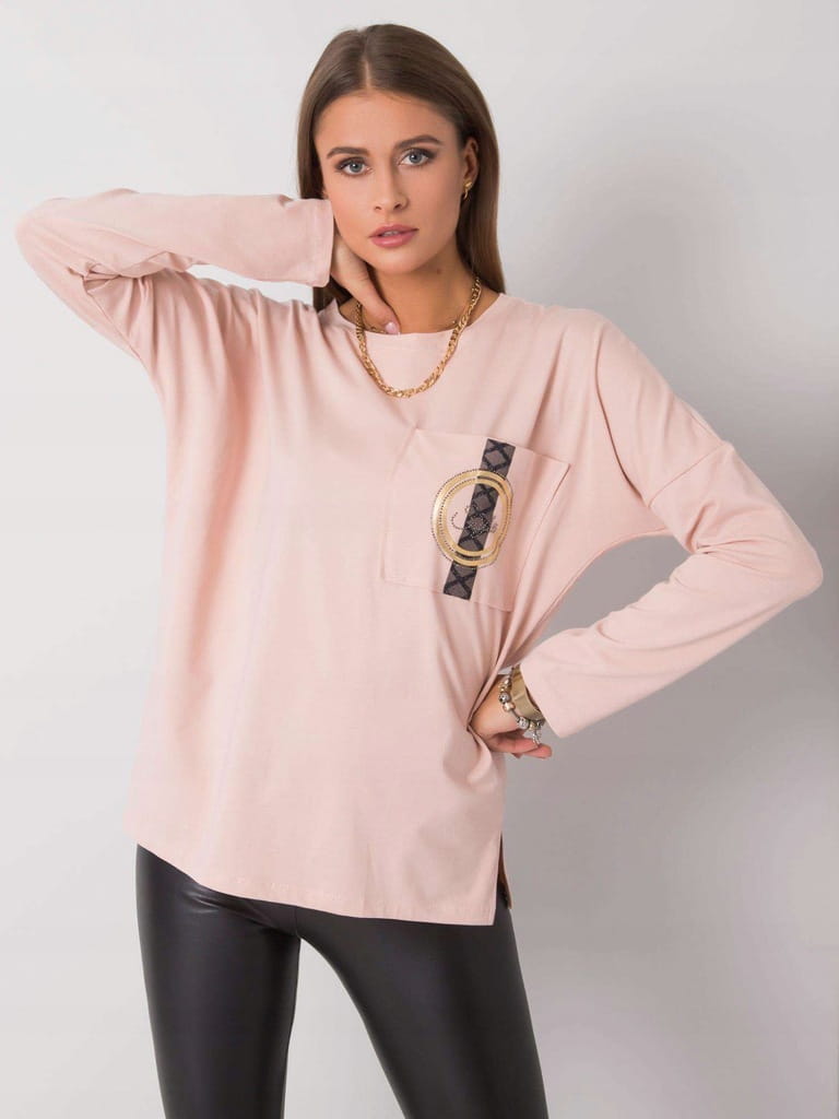 Bladoróżowa łososiowa damska bluzka z kieszenią, ozdobną złoto-czarną aplikacją i długim rękawem - r. uniwersalny