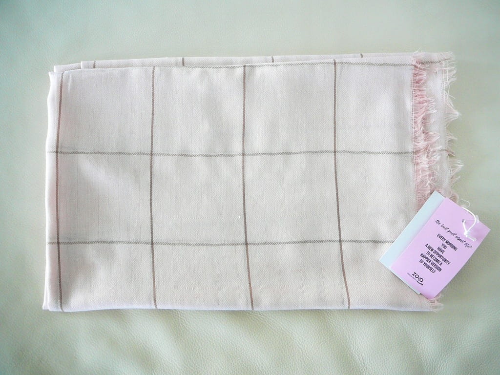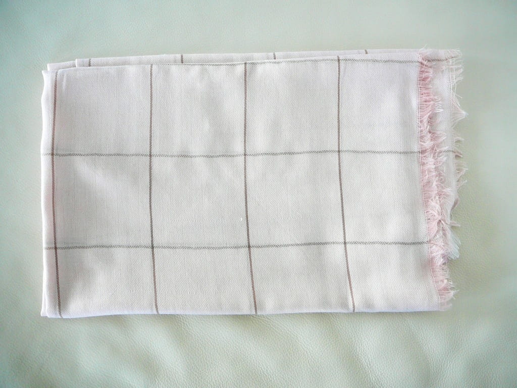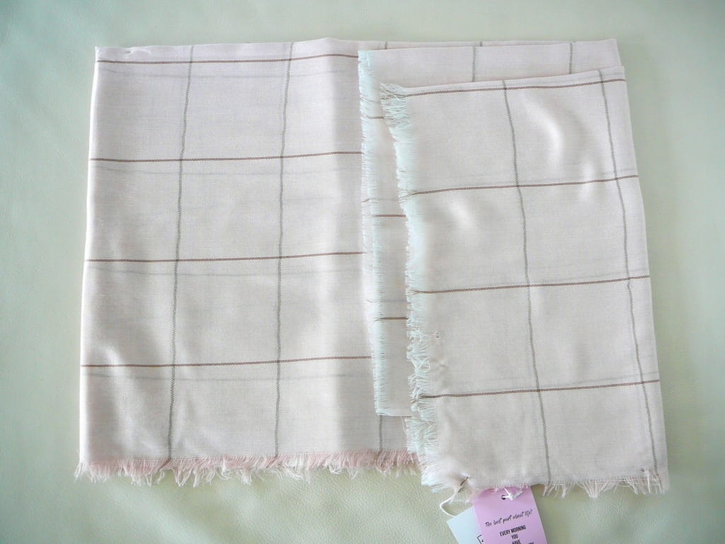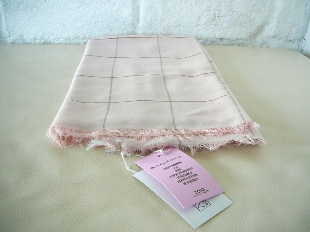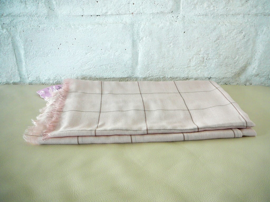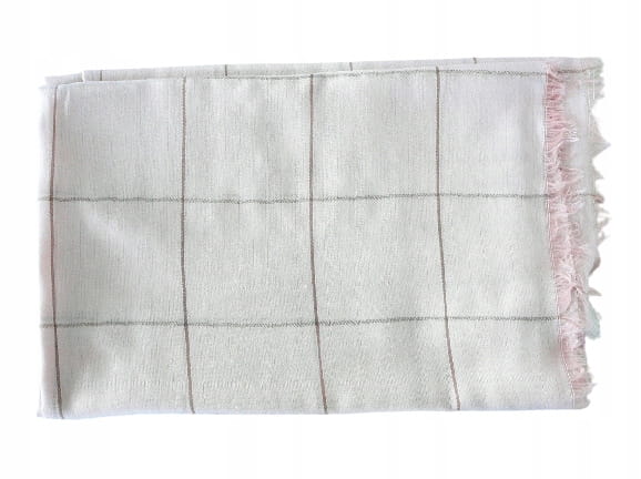 Bladoróżowy, cienki damski szal w brązową kratę, z postrzępionymi końcami - ok. 145 x 70 cm