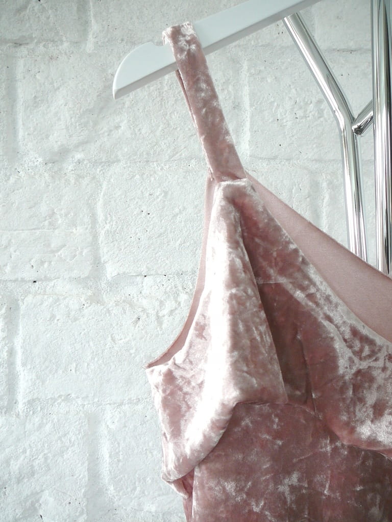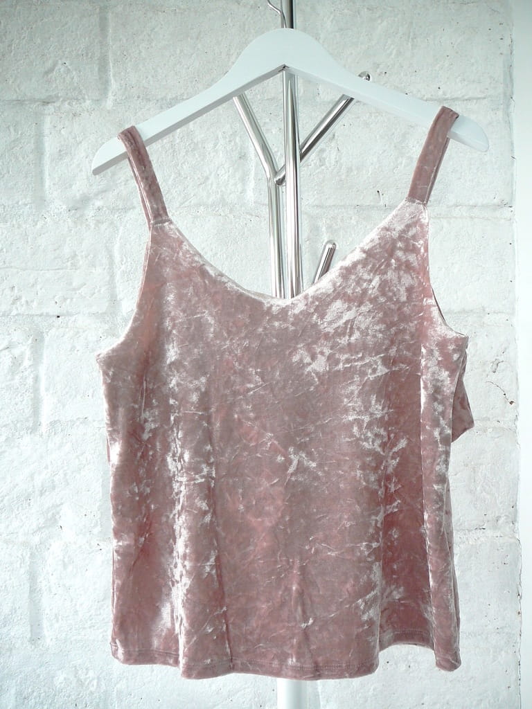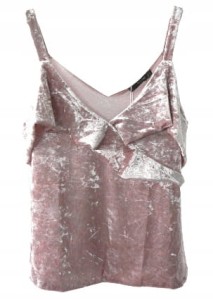 Bladoróżowy elegancki welurowy letni damski top na ramiączkach, z falbaną przy dekolcie - rozmiar 36 S - Mango