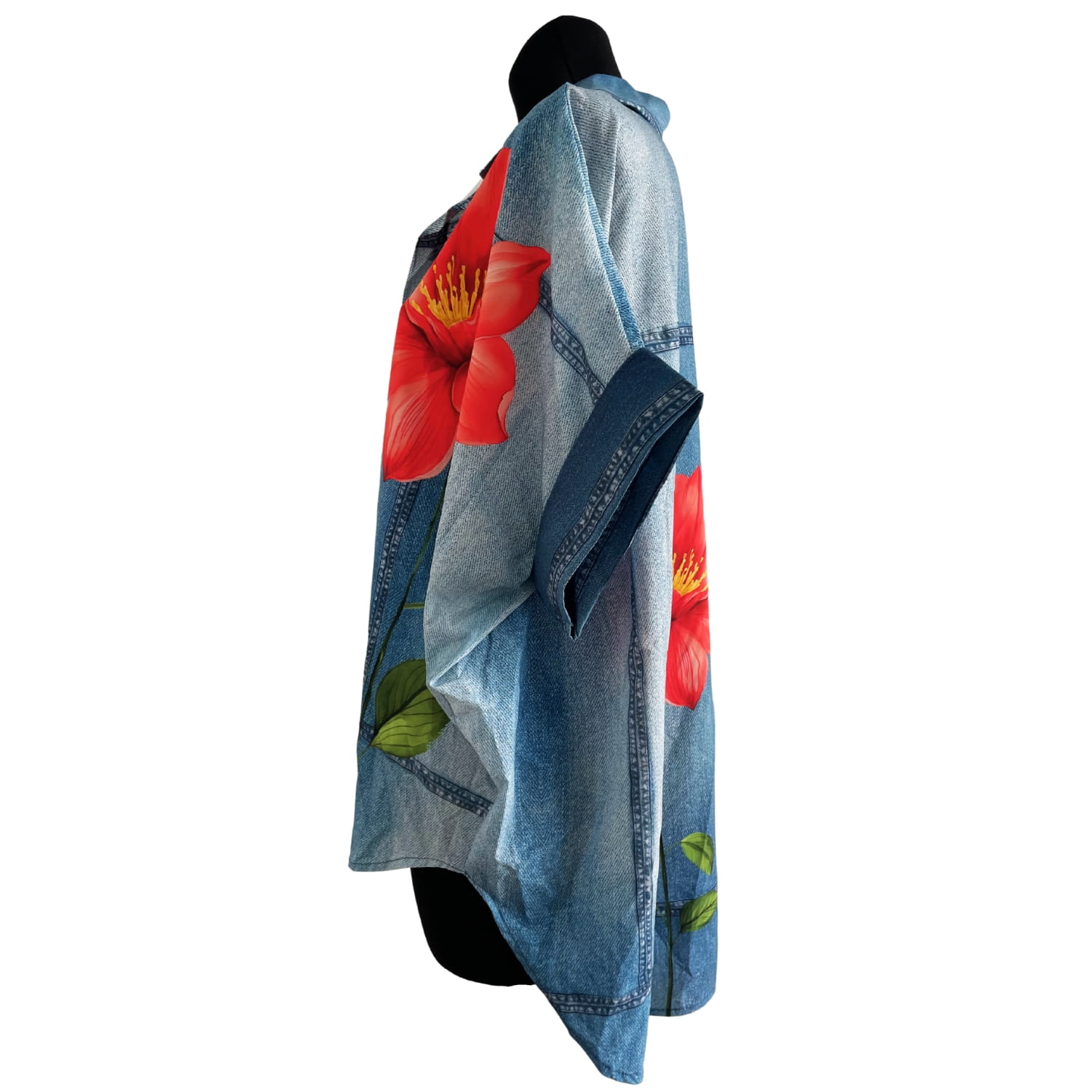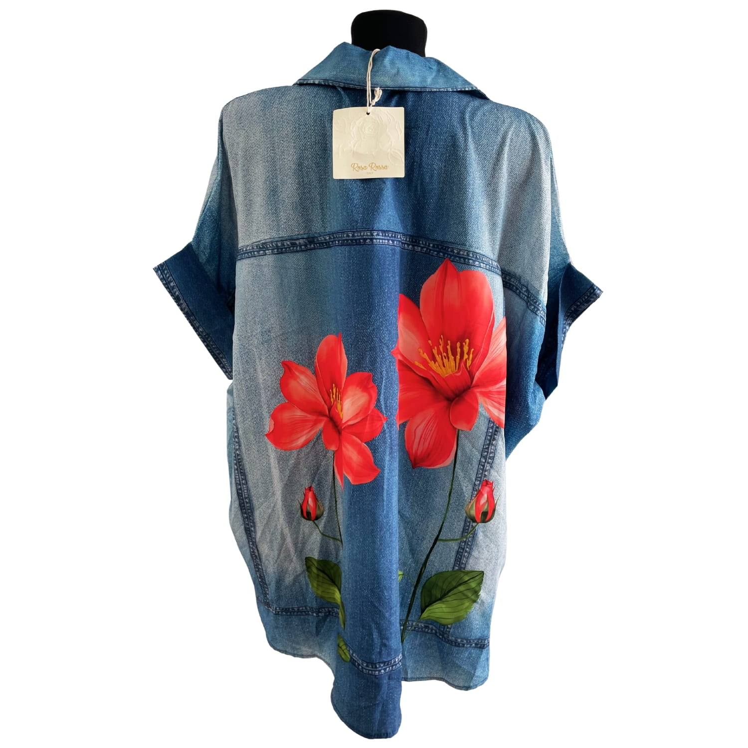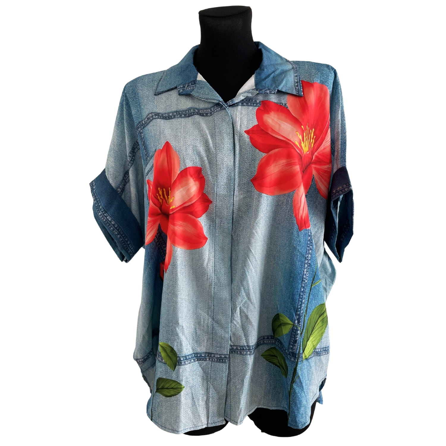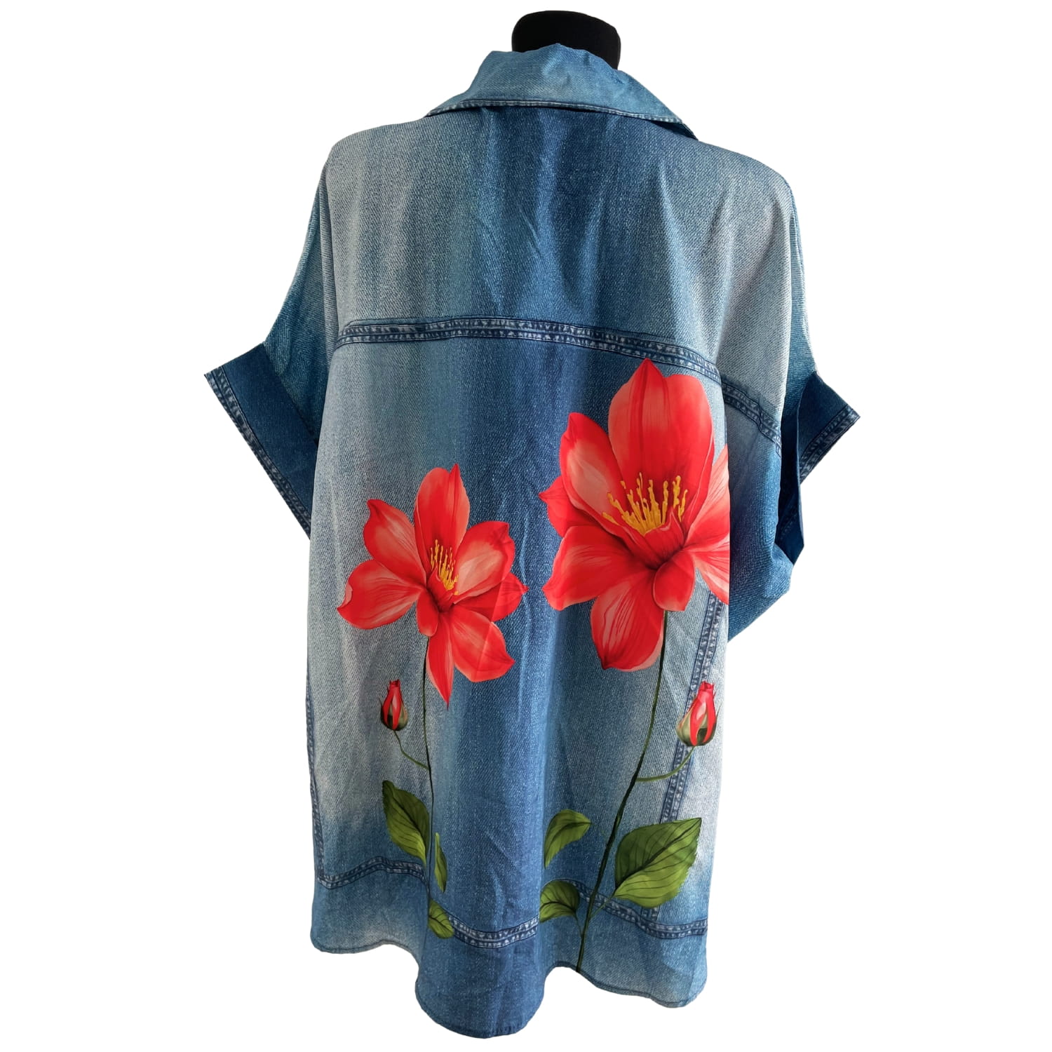 Błękitna cienka włoska damska koszula w kroju oversize, w kolorowe czerwone kwiaty, z krótkim rękawem, imitacja jeansu - r. uniwersalny