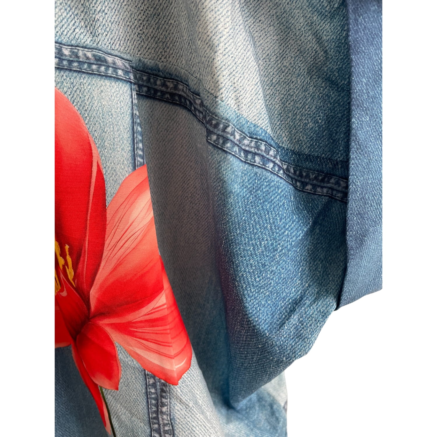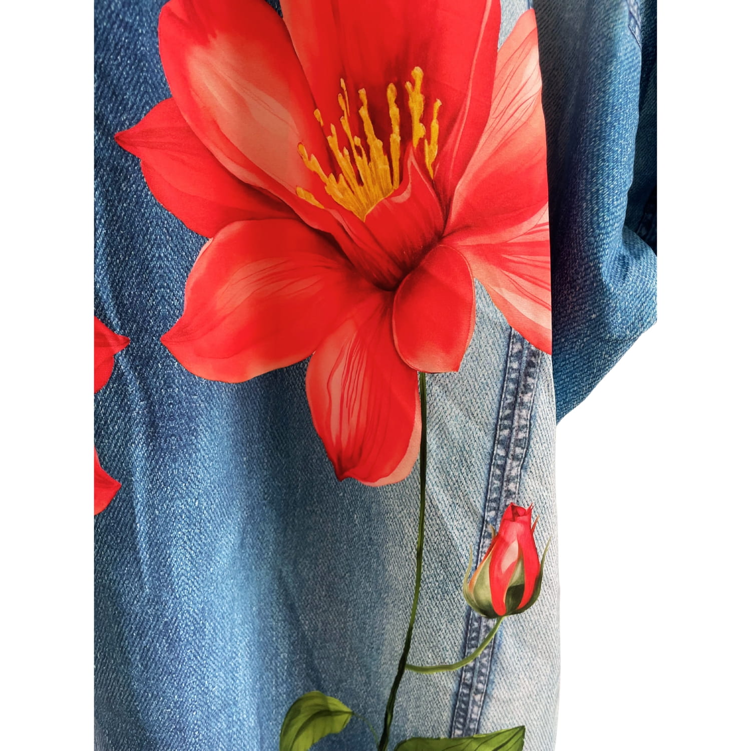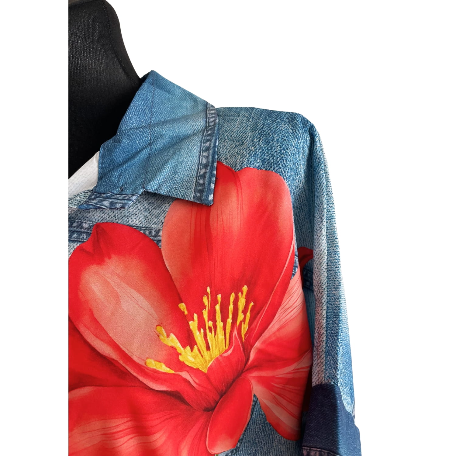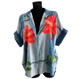Błękitna cienka włoska damska koszula w kroju oversize, w kolorowe czerwone kwiaty, z krótkim rękawem, imitacja jeansu - r. uniwersalny