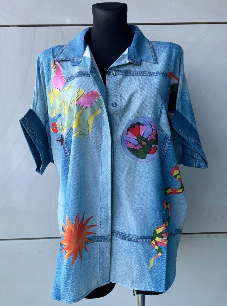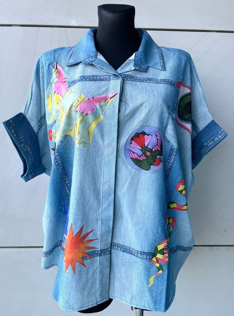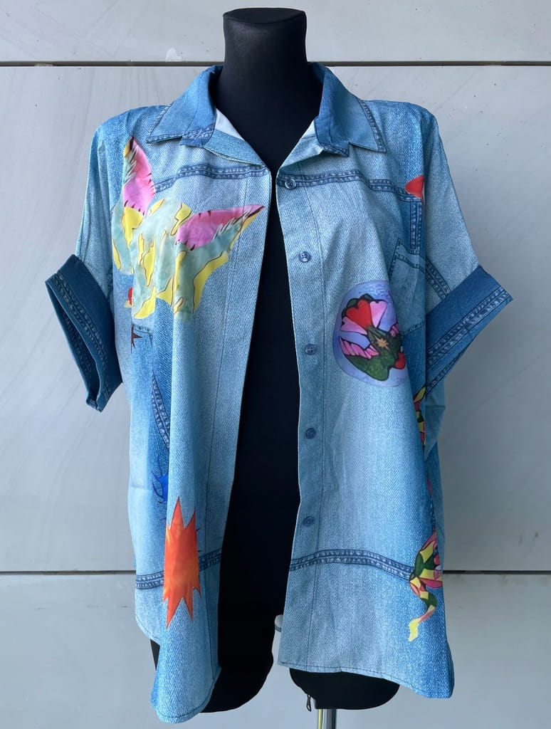 Włoska cienka koszula w kolorze niebieskim (imitacja jeansu), zapinana na guziki, w kolorowe wzory