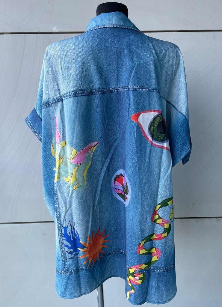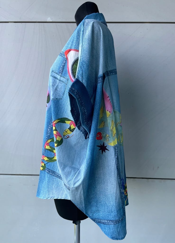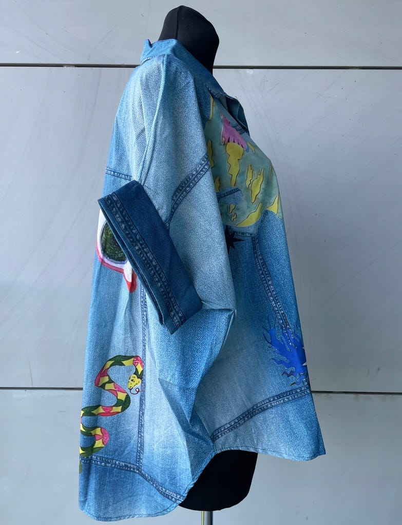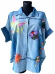 Błękitna cienka włoska damska koszula w kroju oversize, w kolorowe wzory, imitacja jeansu - r. uniwersalny
