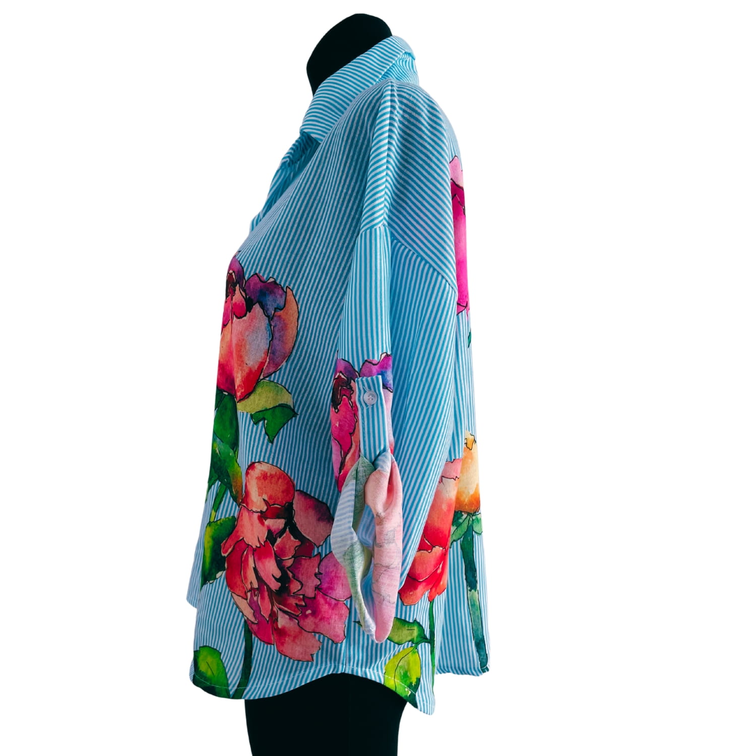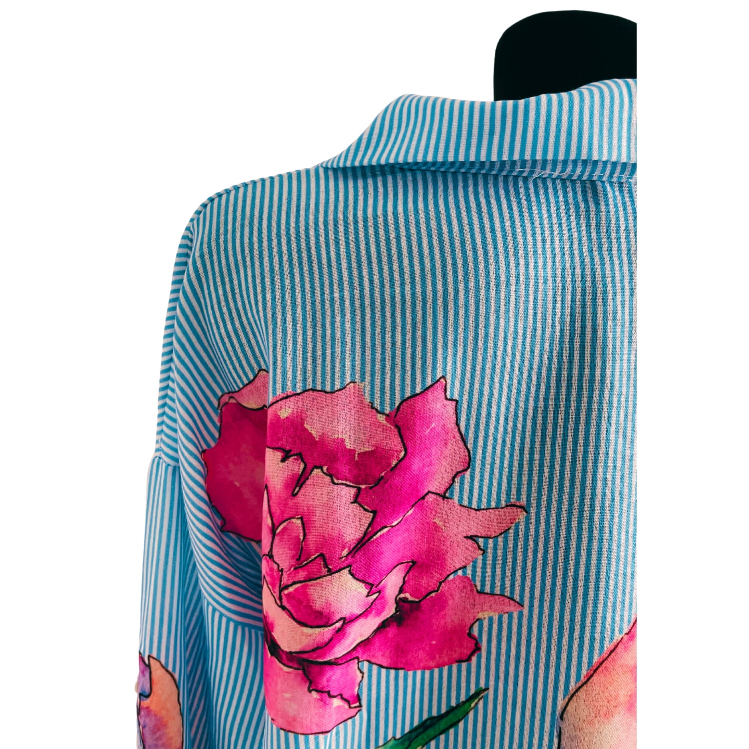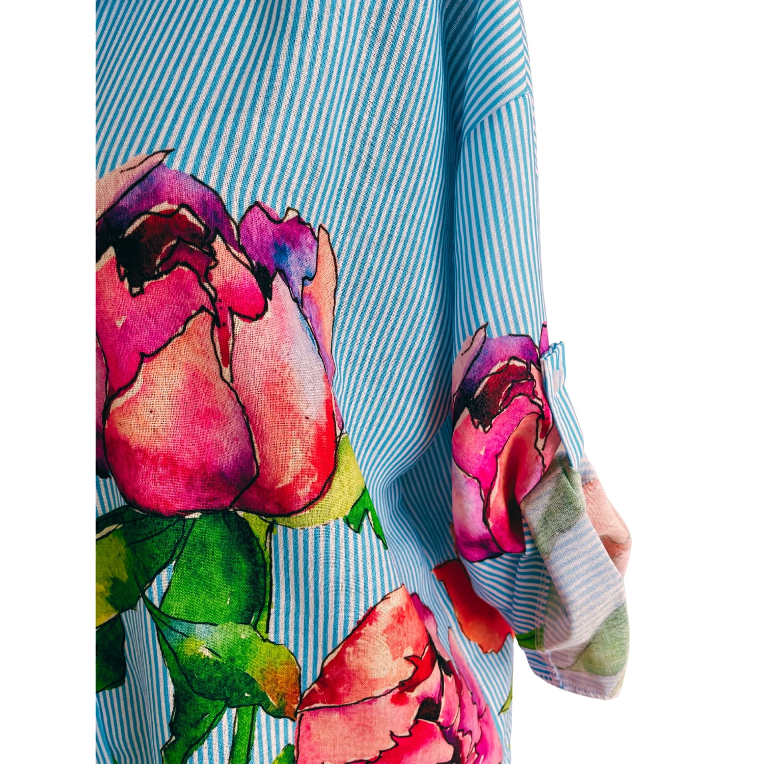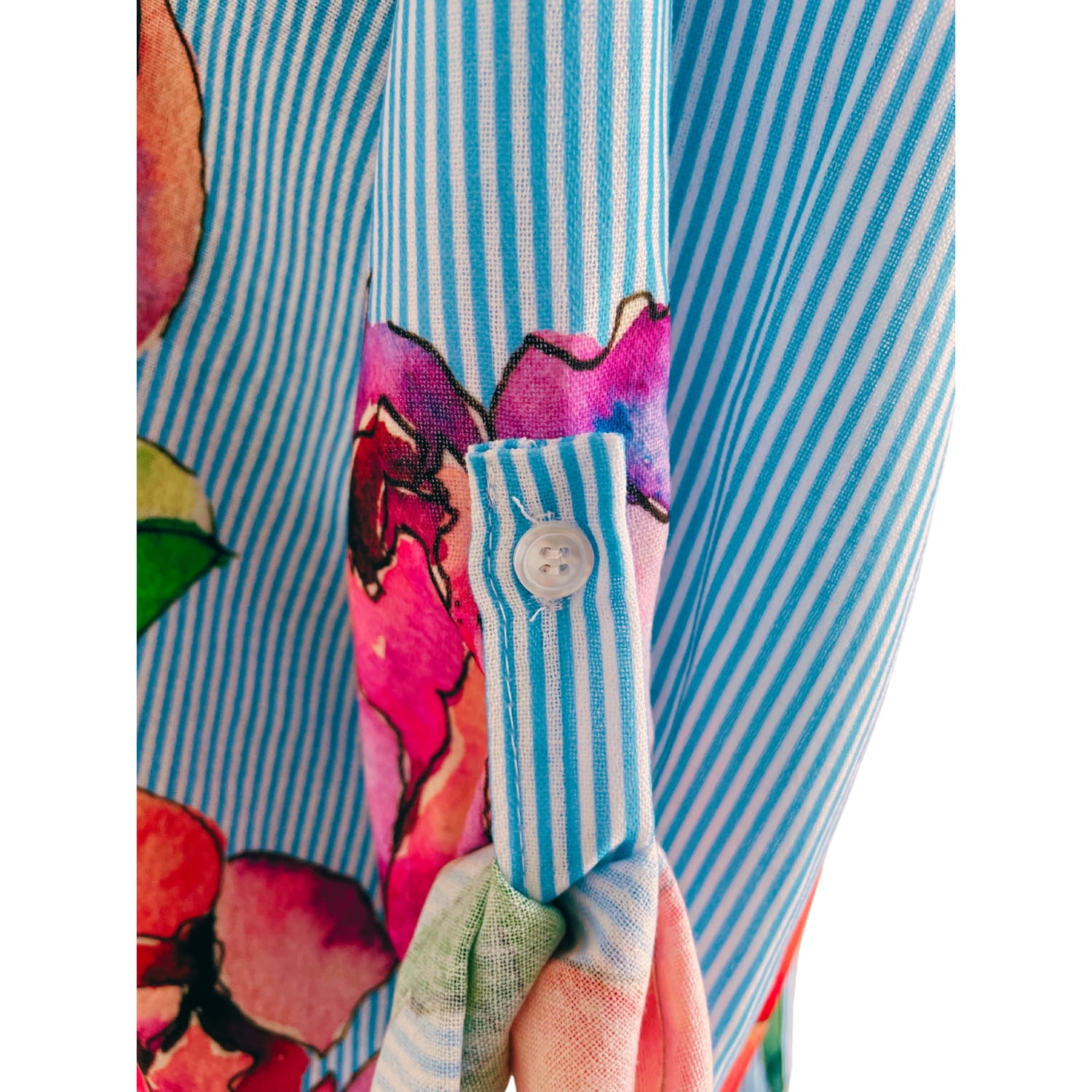 Błękitna cienka włoska damska koszula w paski, z domieszką lnu, w kroju oversize, w kolorowe kwiaty, z podwijanym rękawem 7/8 - r. uniwersalny