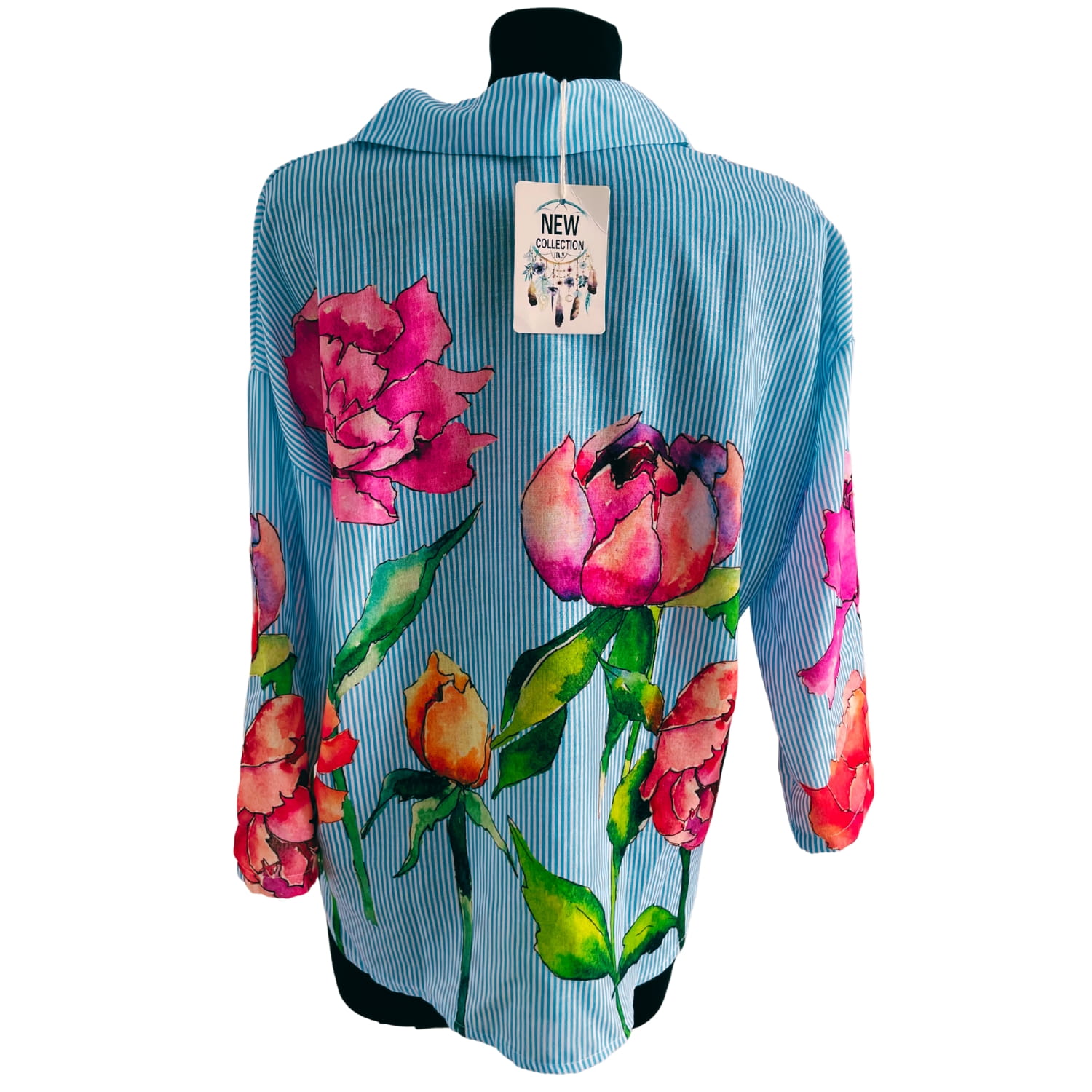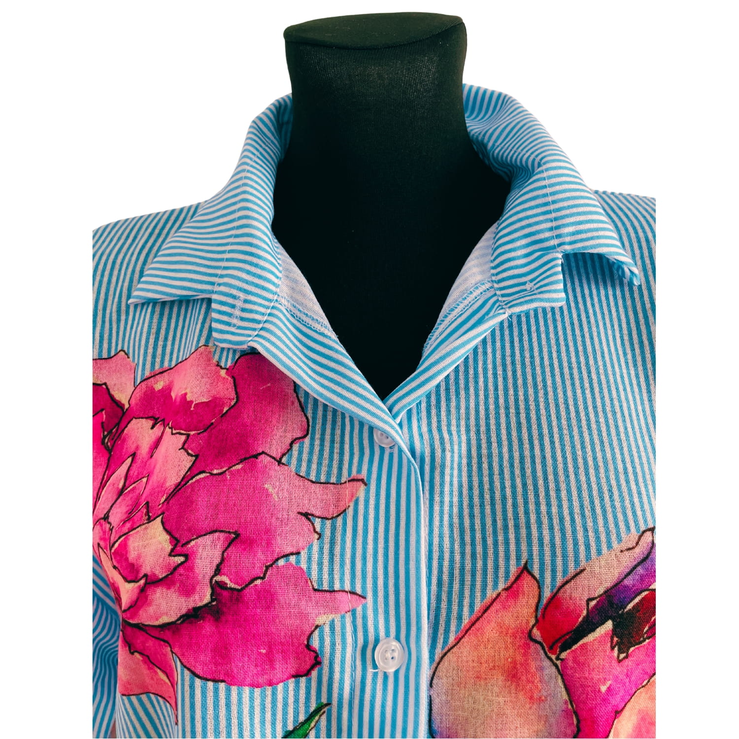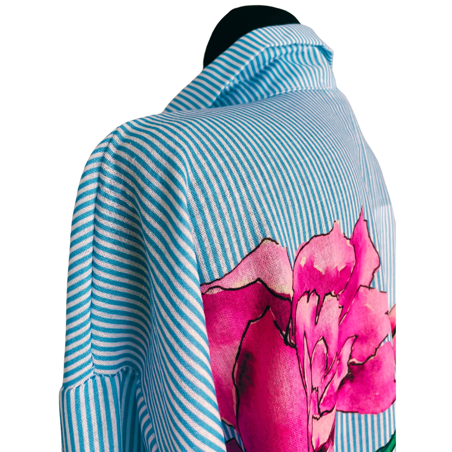 Błękitna cienka włoska damska koszula w paski, z domieszką lnu, w kroju oversize, w kolorowe kwiaty, z podwijanym rękawem 7/8 - r. uniwersalny