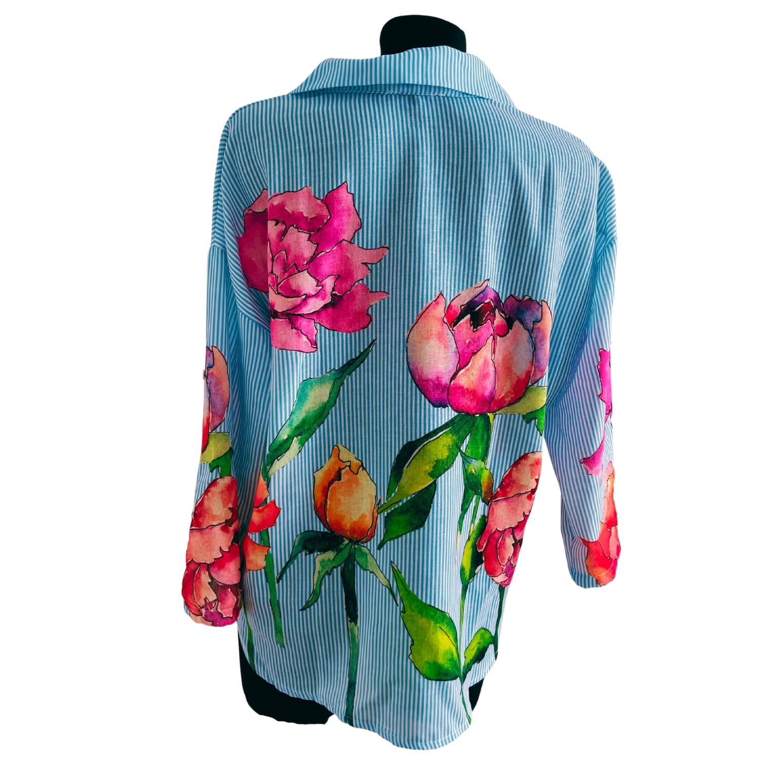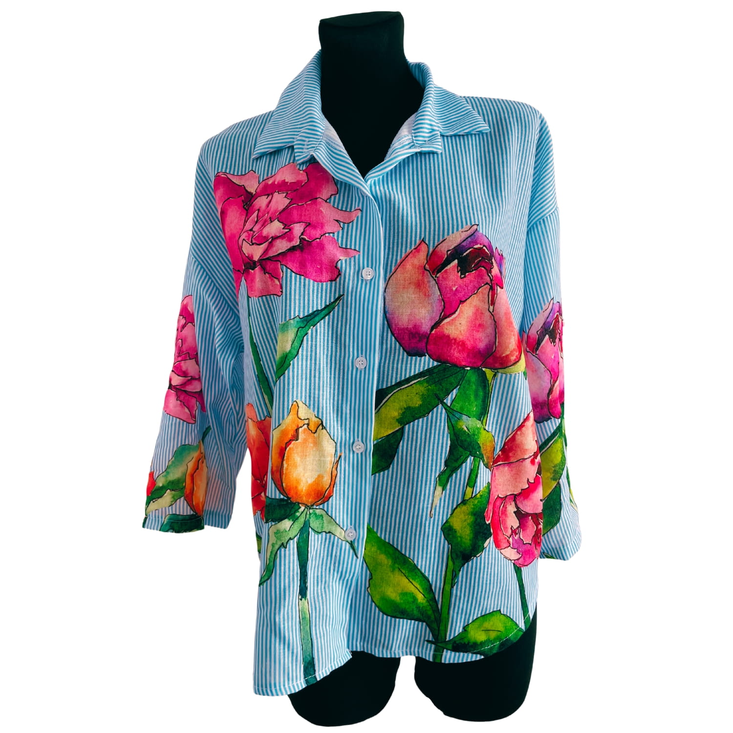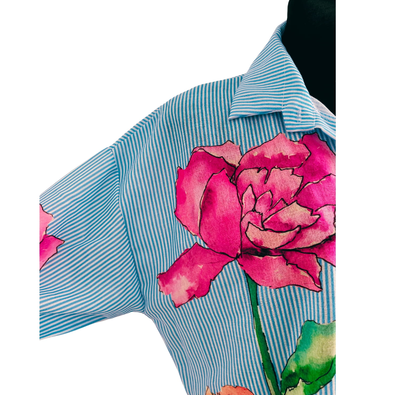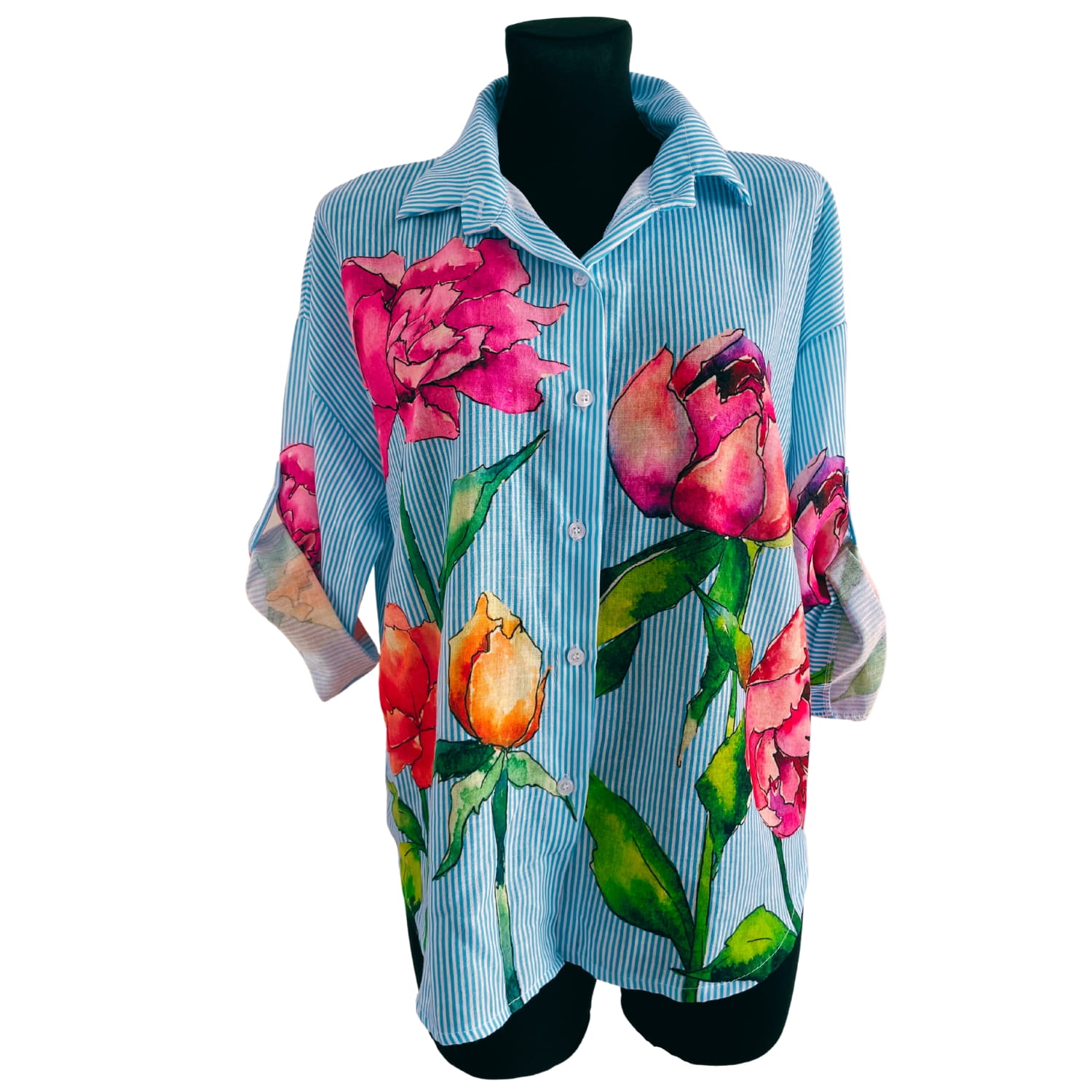 Błękitna cienka włoska damska koszula w paski, z domieszką lnu, w kroju oversize, w kolorowe kwiaty, z podwijanym rękawem 7/8 - r. uniwersalny