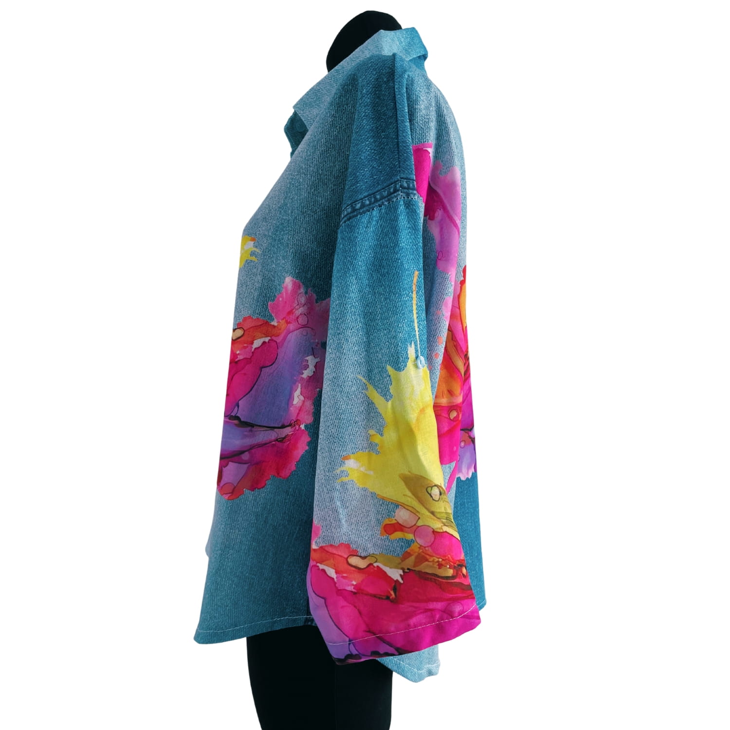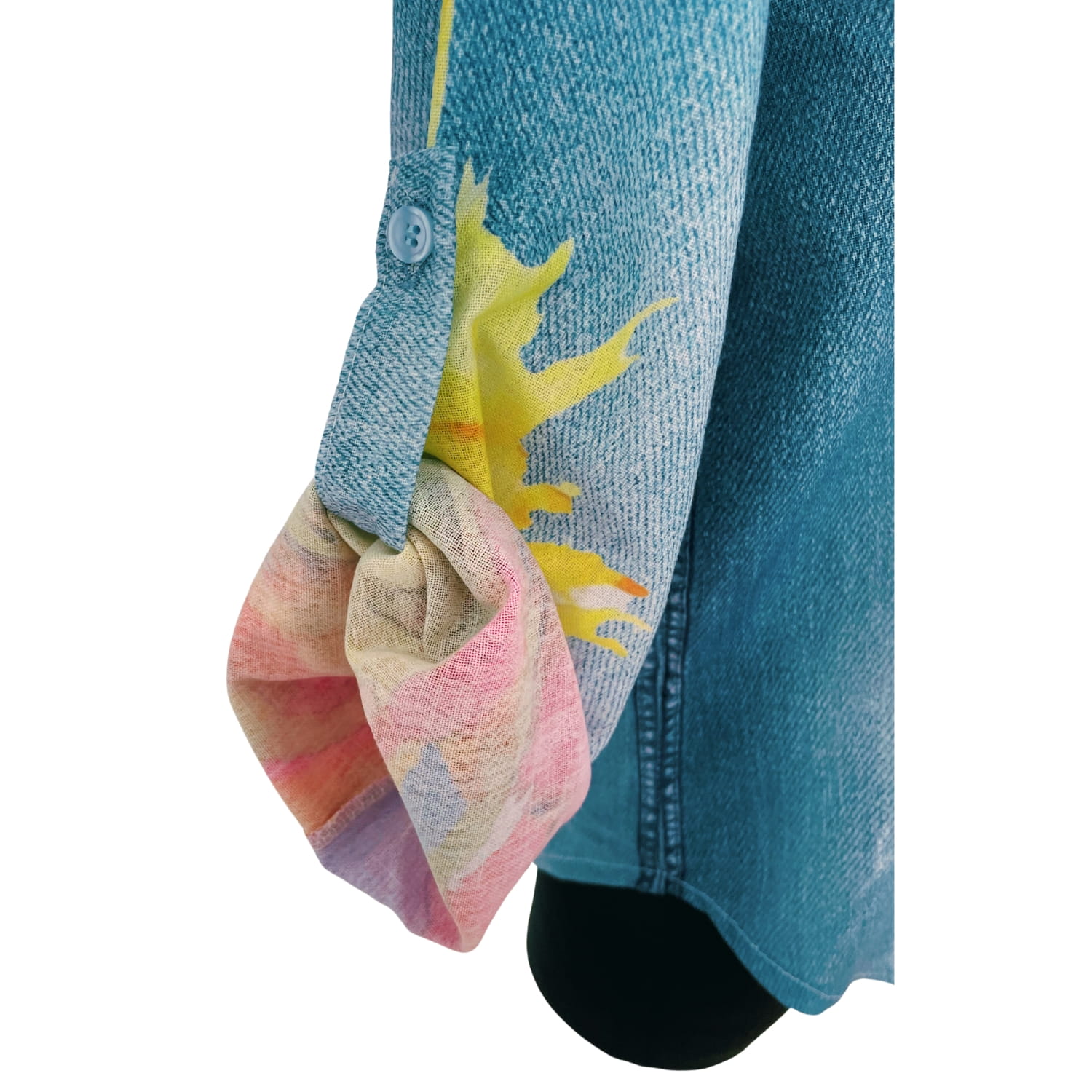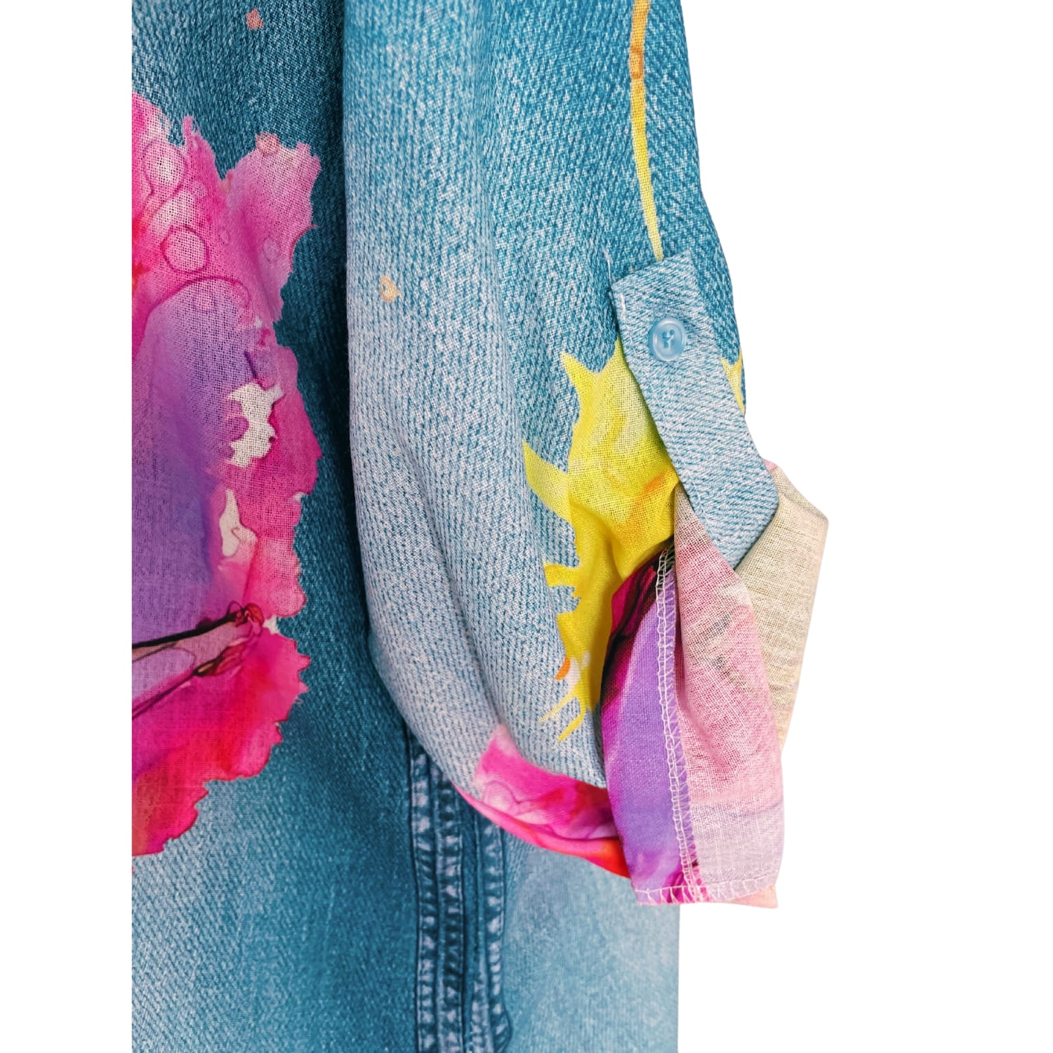 Błękitna cienka włoska damska koszula z domieszką lnu, w kroju oversize, w kolorowe kwiaty, z podwijanym rękawem 7/8, imitacja jeansu - r. uniwersalny