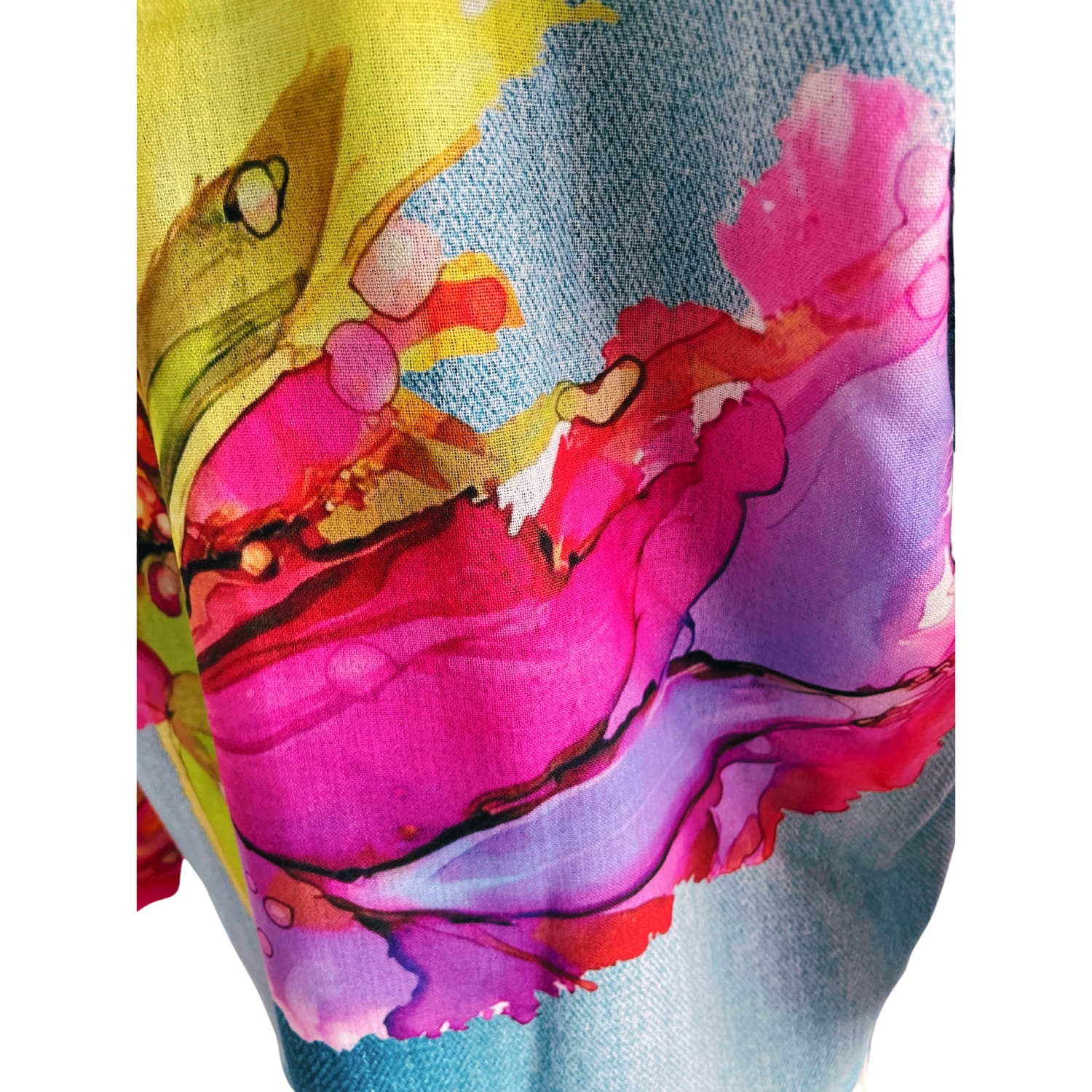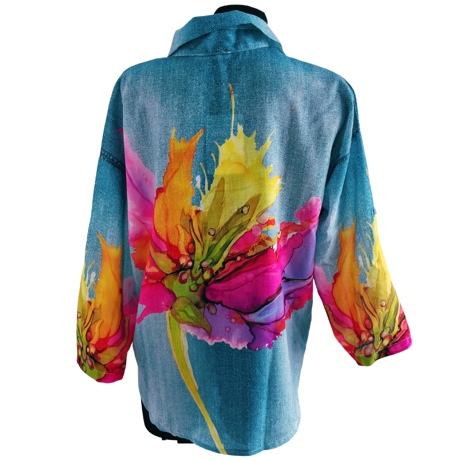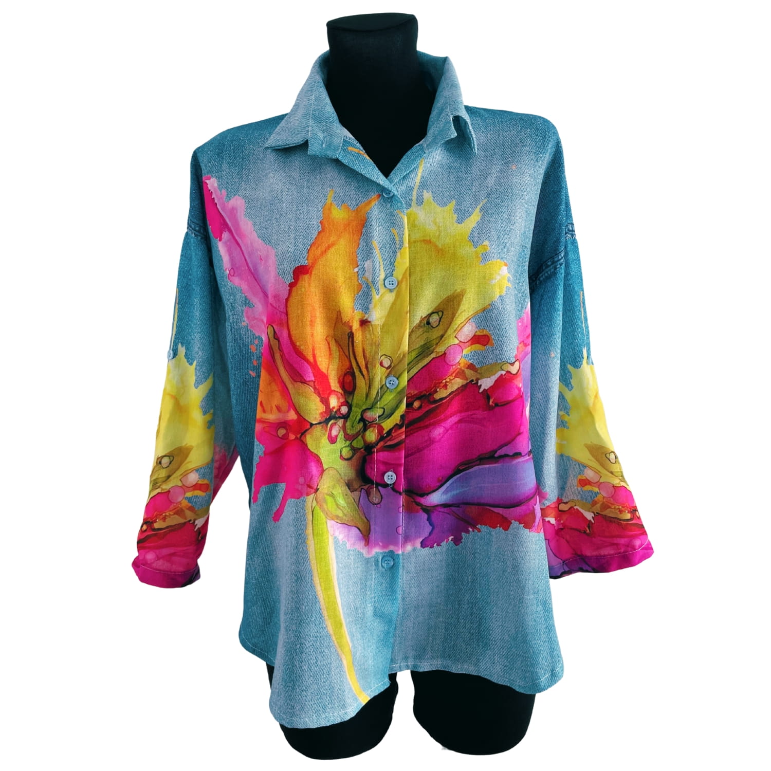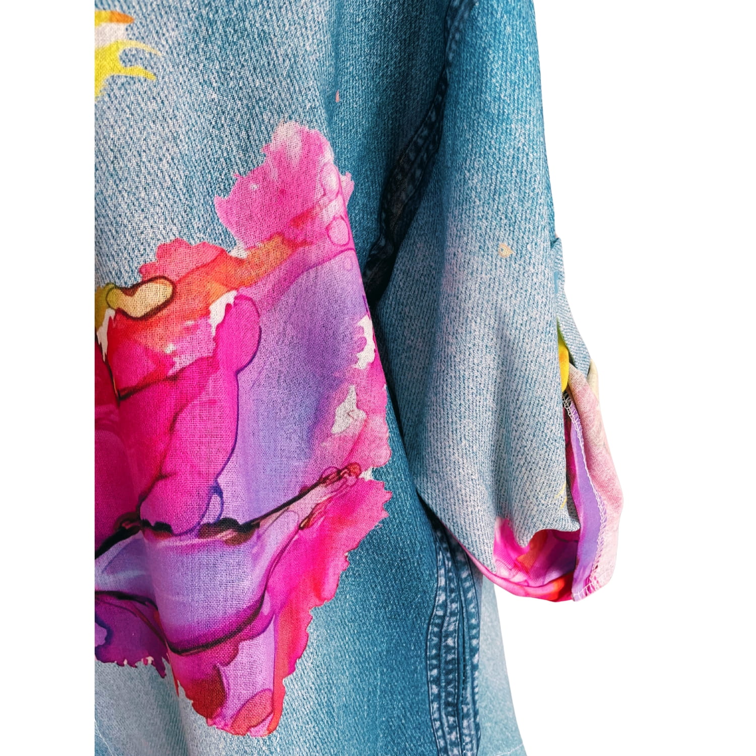 Błękitna cienka włoska damska koszula z domieszką lnu, w kroju oversize, w kolorowe kwiaty, z podwijanym rękawem 7/8, imitacja jeansu - r. uniwersalny