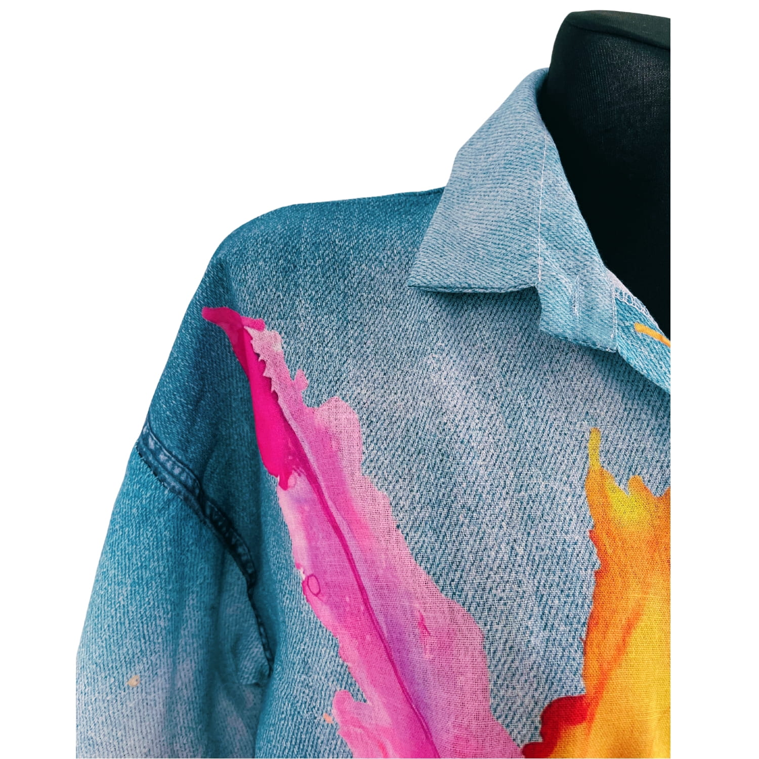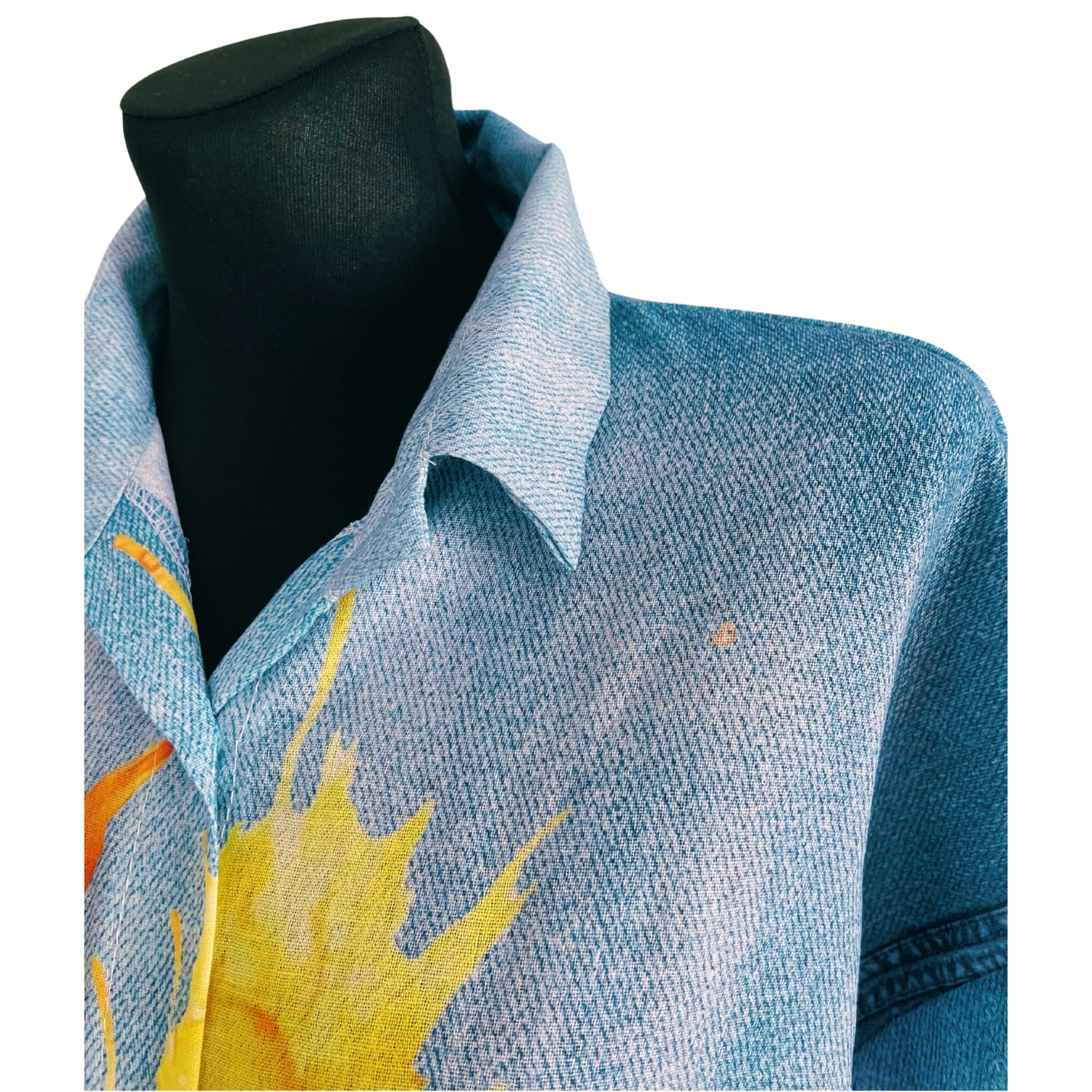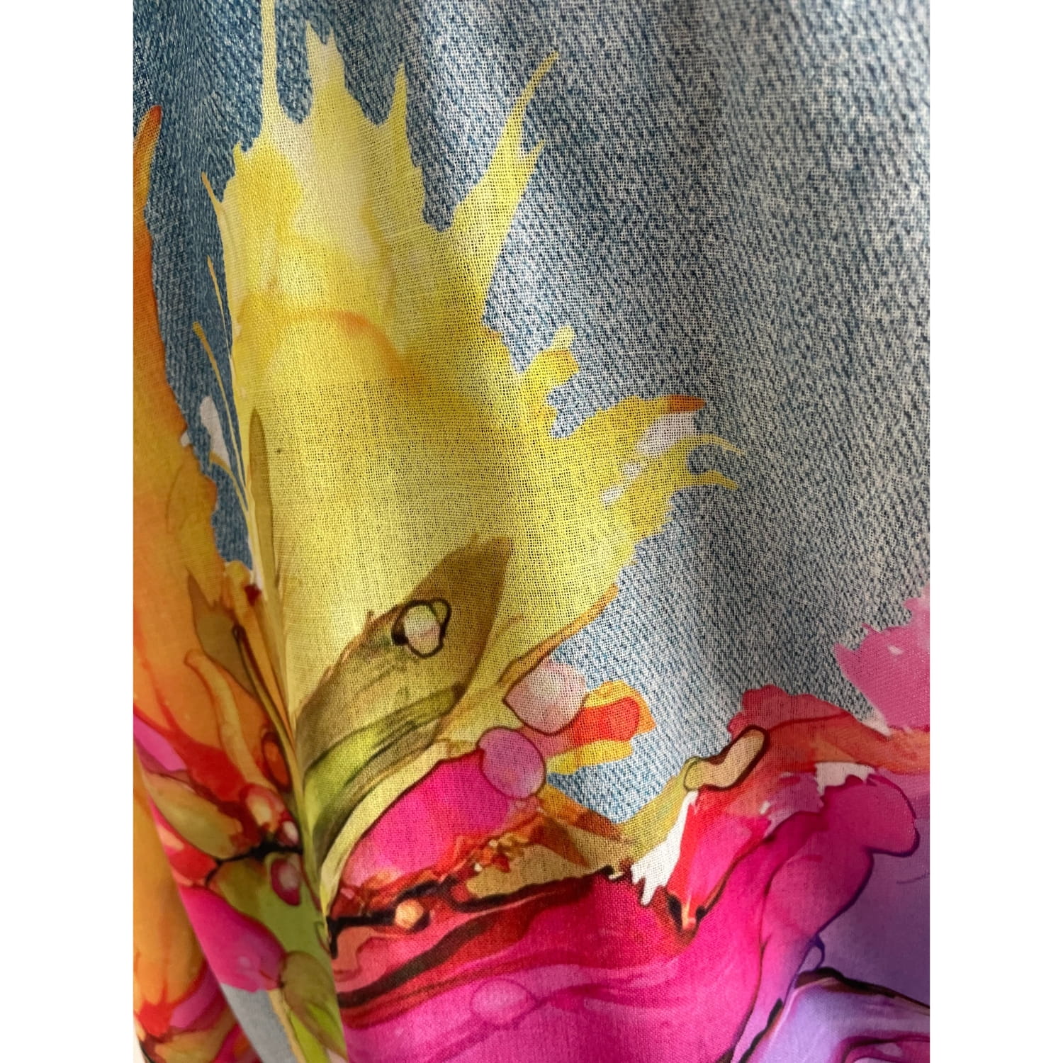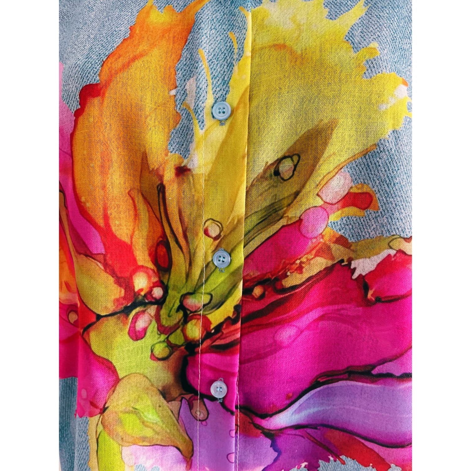 Włoska cienka koszula w kolorze niebieskim (imitacja jeansu), zapinana na guziki, w kolorowe kwieciste wzory, z domieszką lnu
