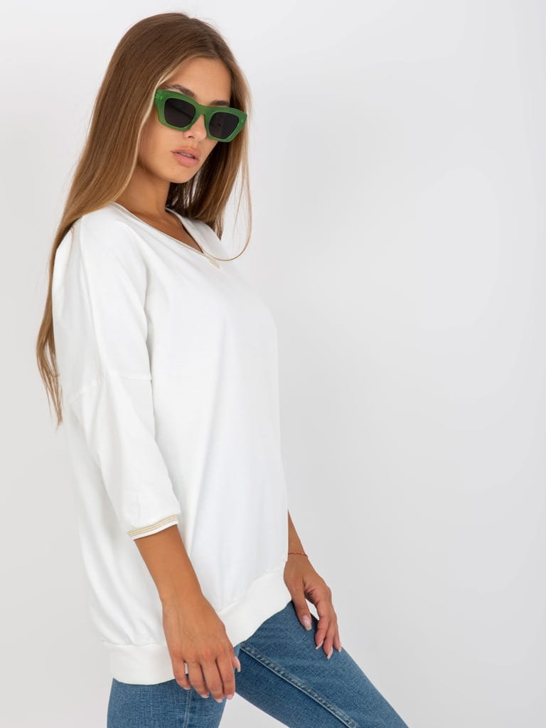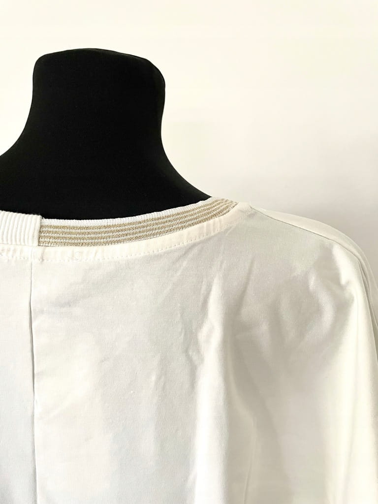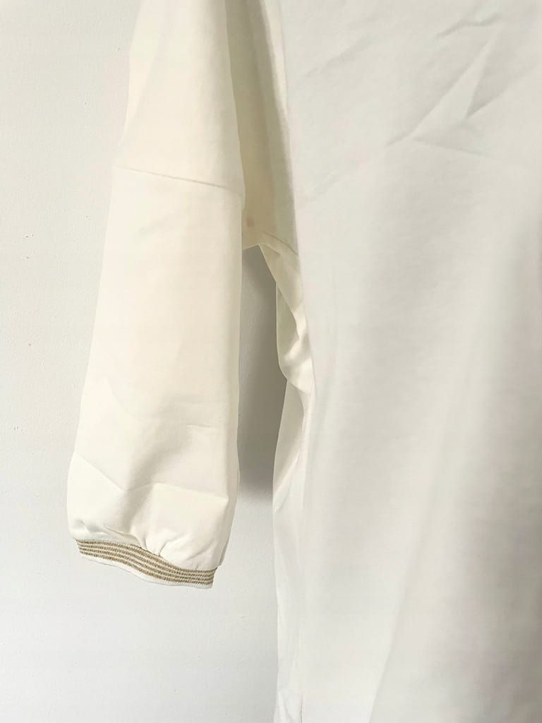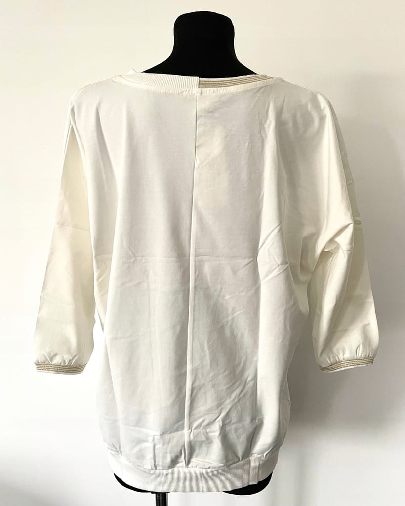 Klasyczna bluzka w kolorze ecru z rękawem 3/4 i złotymi wstawkami przy dekolcie i ściągaczach rękawów