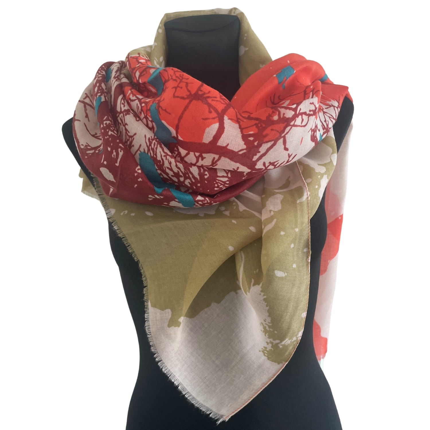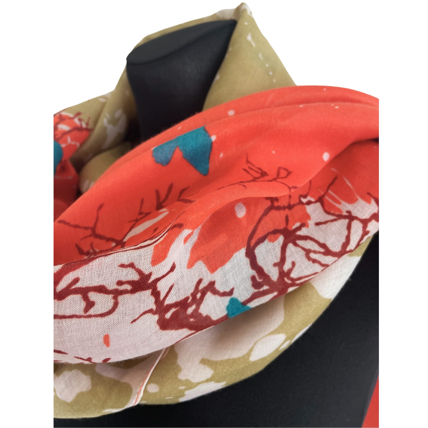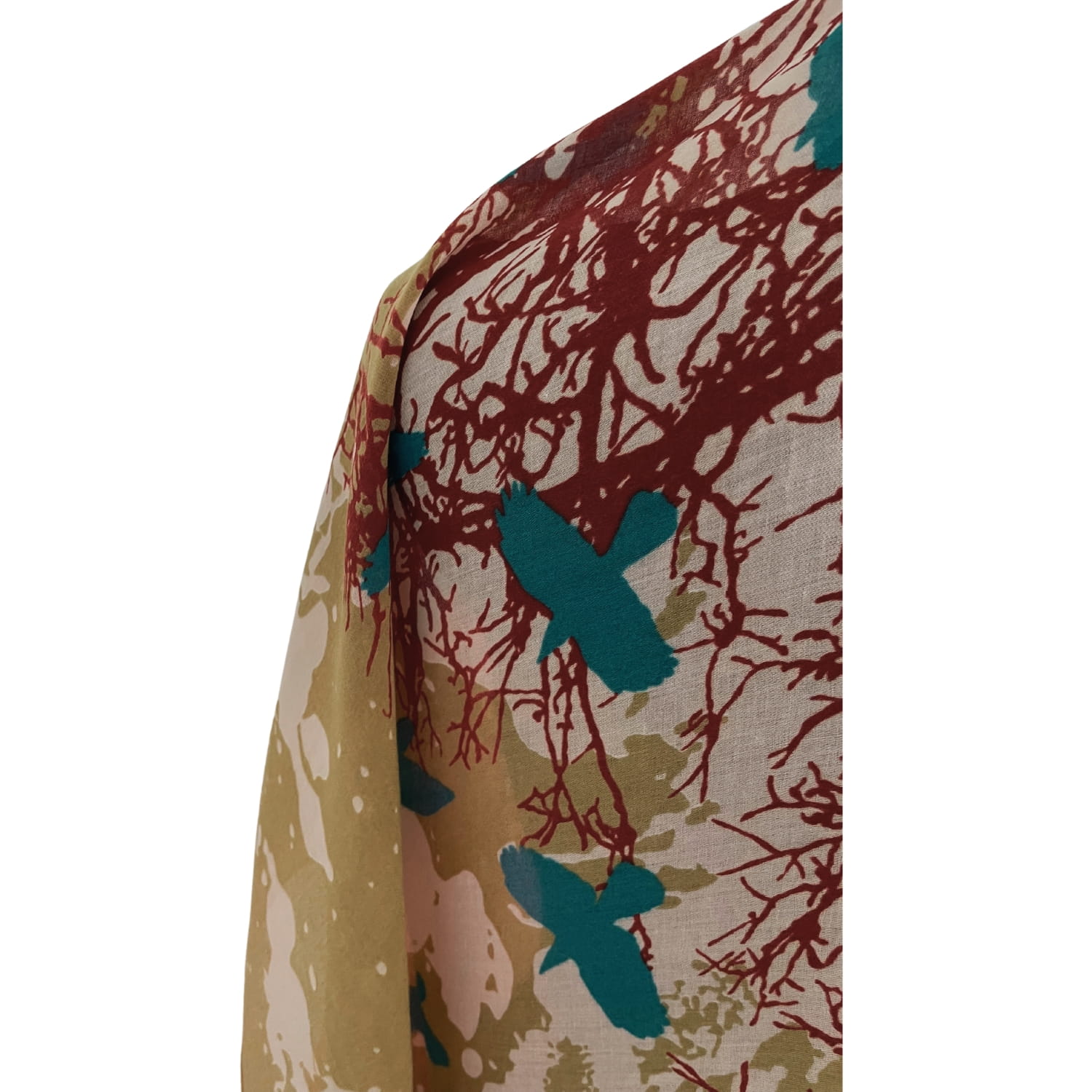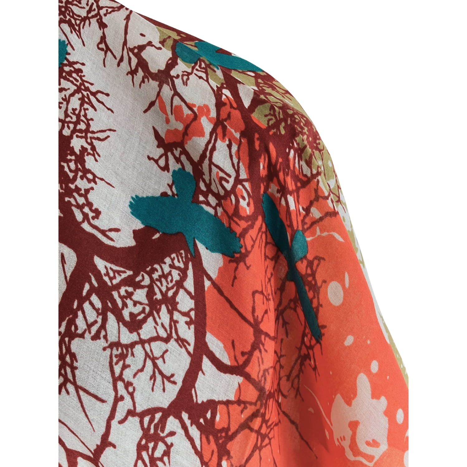 Chusta damska oliwkowo-koralowo-turkusowa z motywem ptaków i drzewa - ok. 170 x 90 cm
