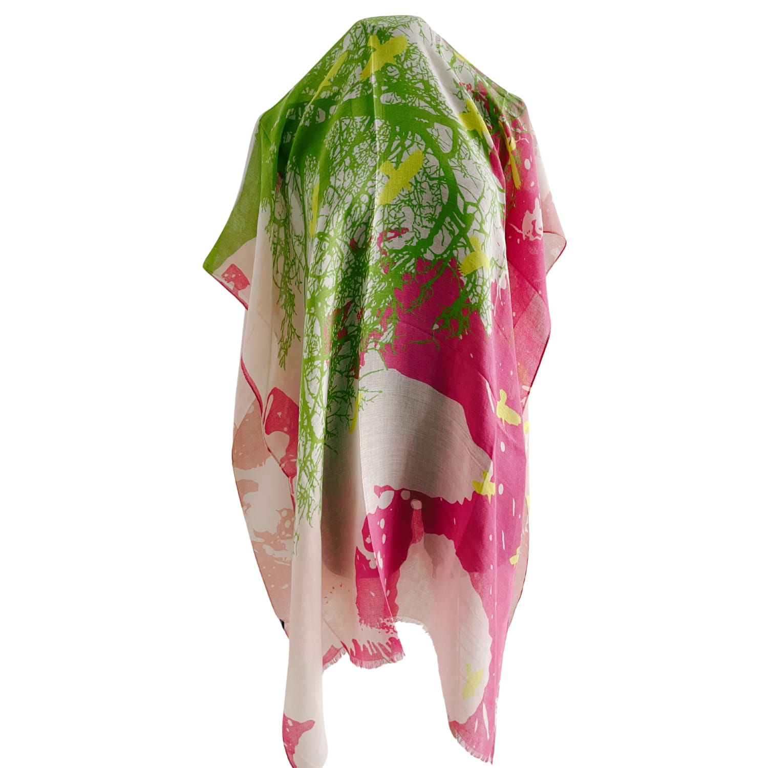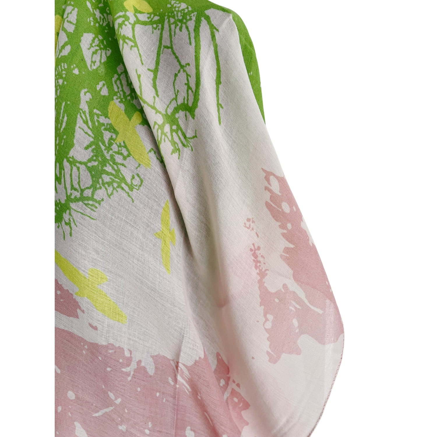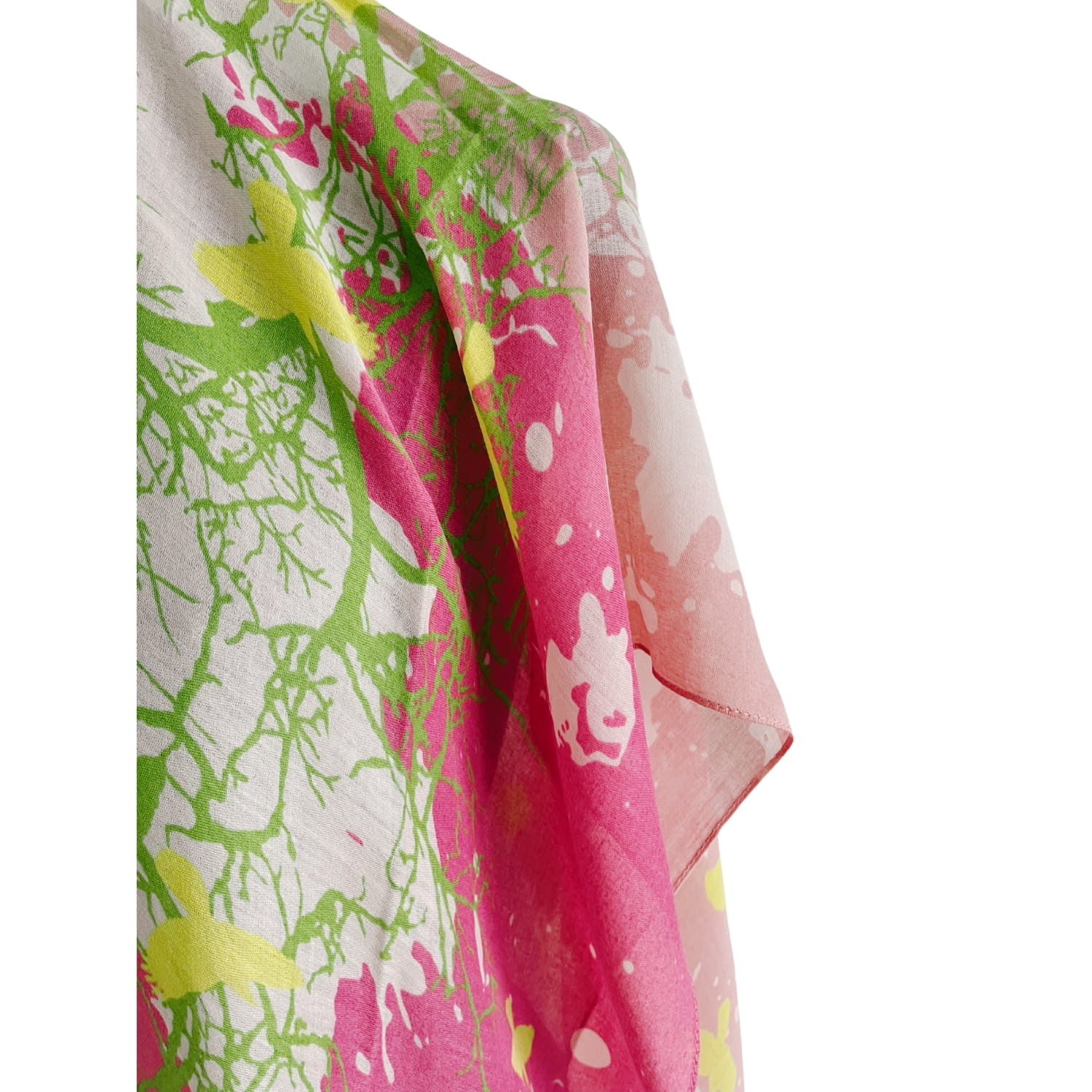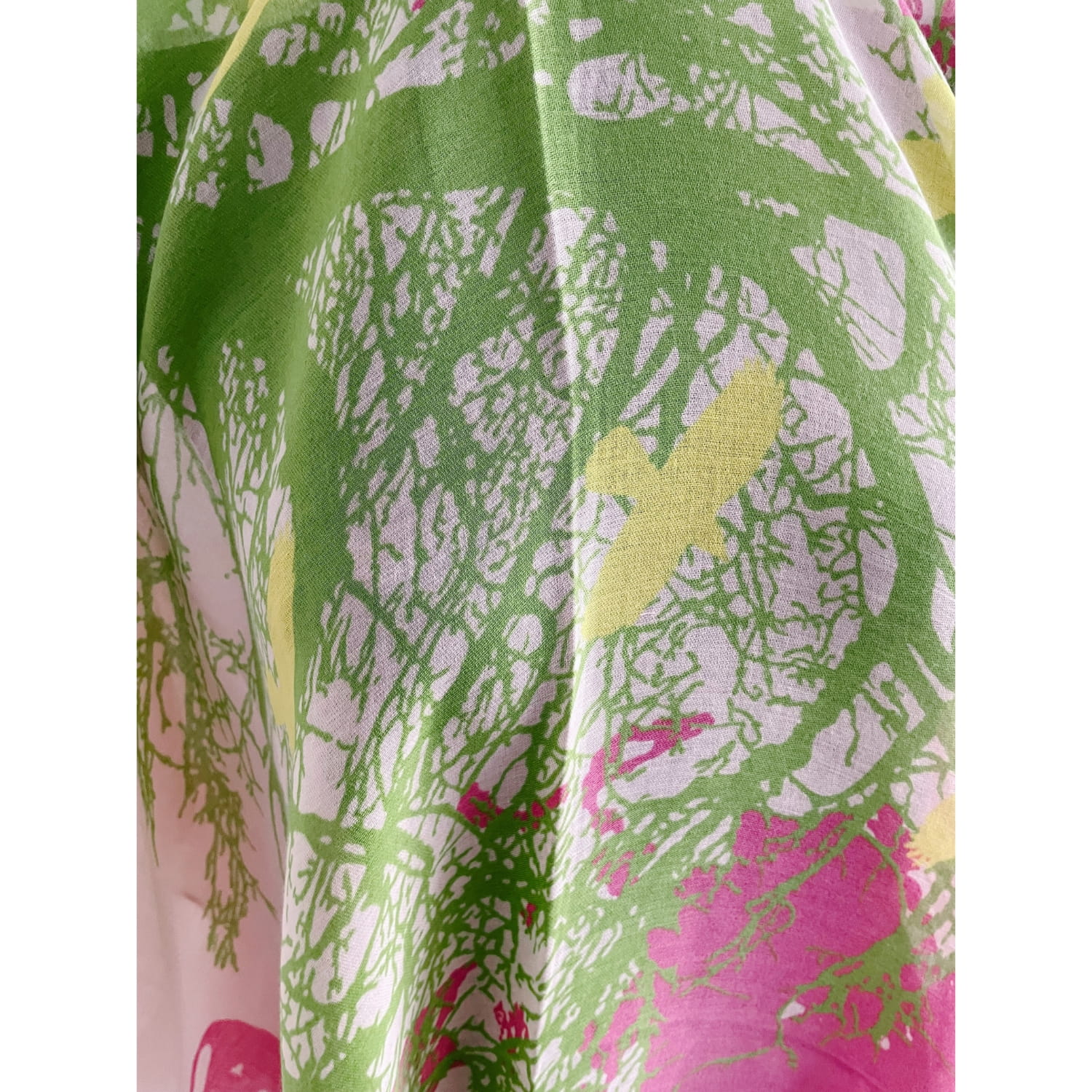Chusta damska różowo-zielono-żółta z motywem ptaków i drzewa - ok. 170 x 90 cm