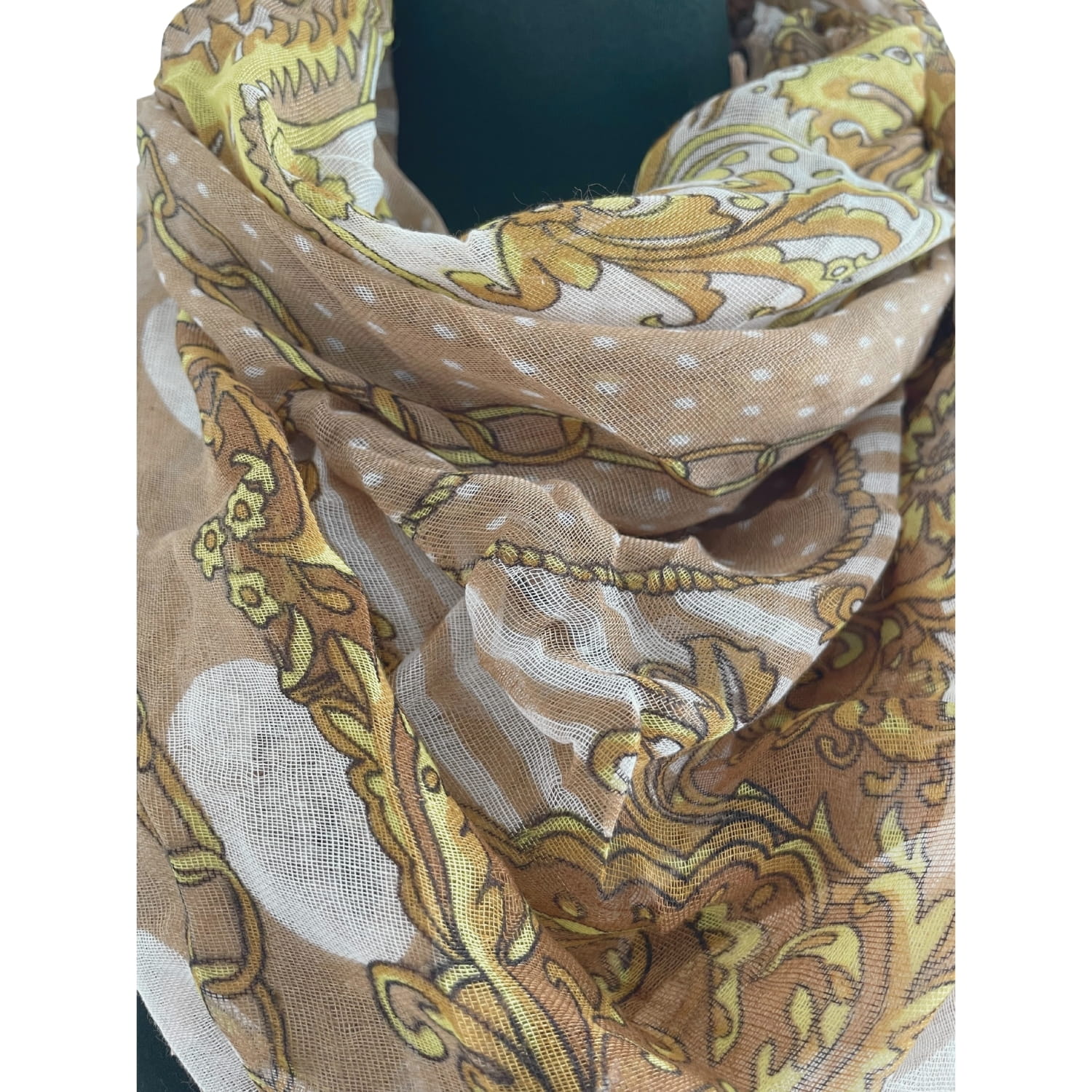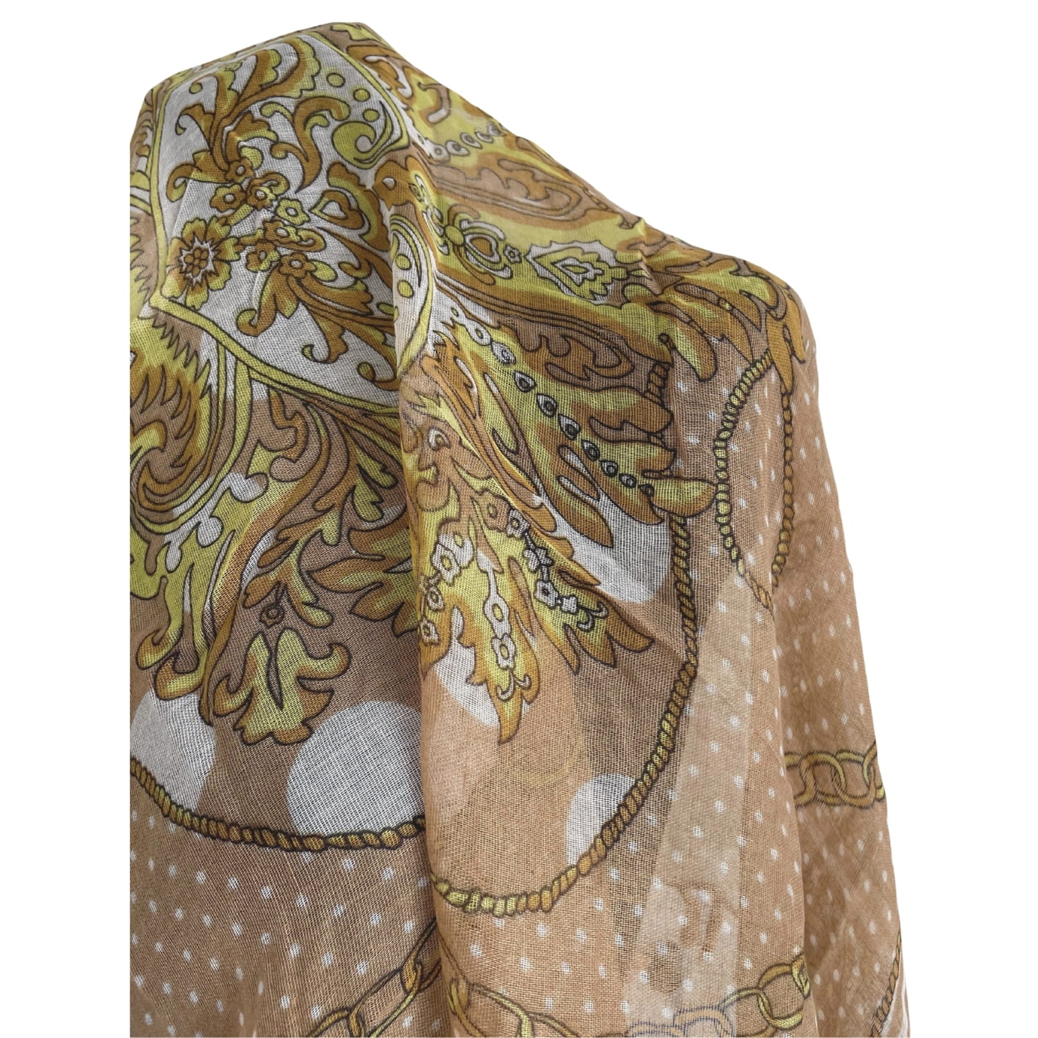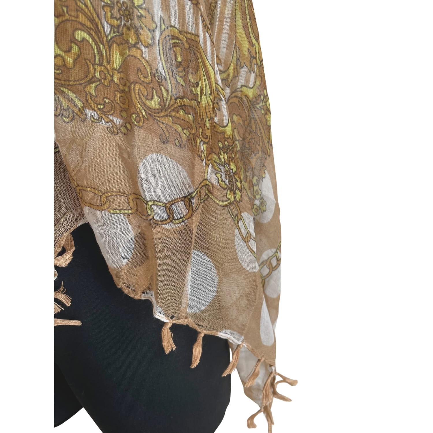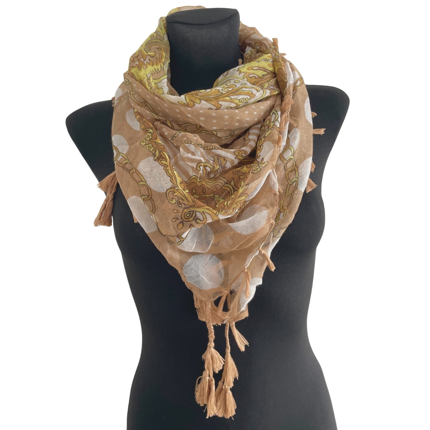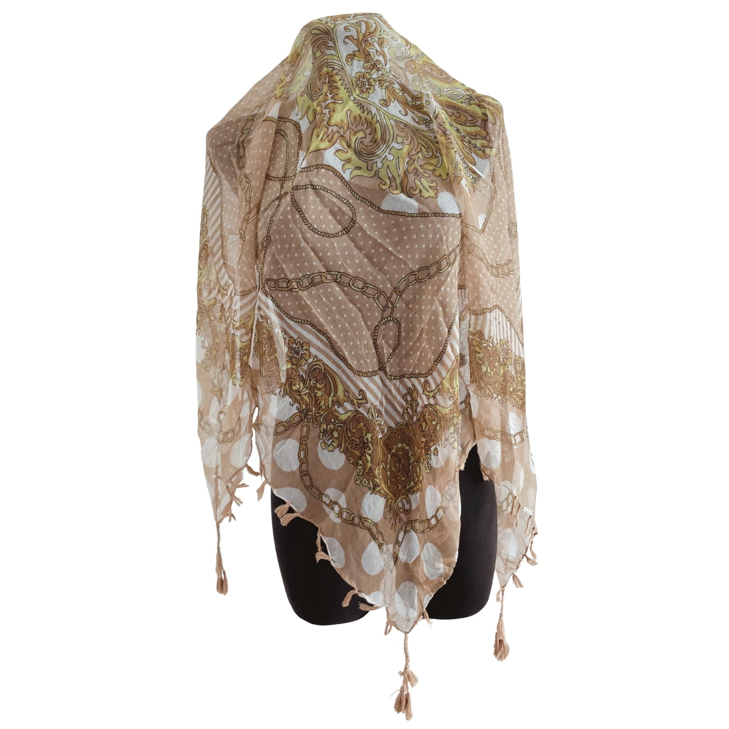 Cienka beżowa damska chusta w białe grochy i złote wzory, z frędzlami - ok. 100 x 100 cm