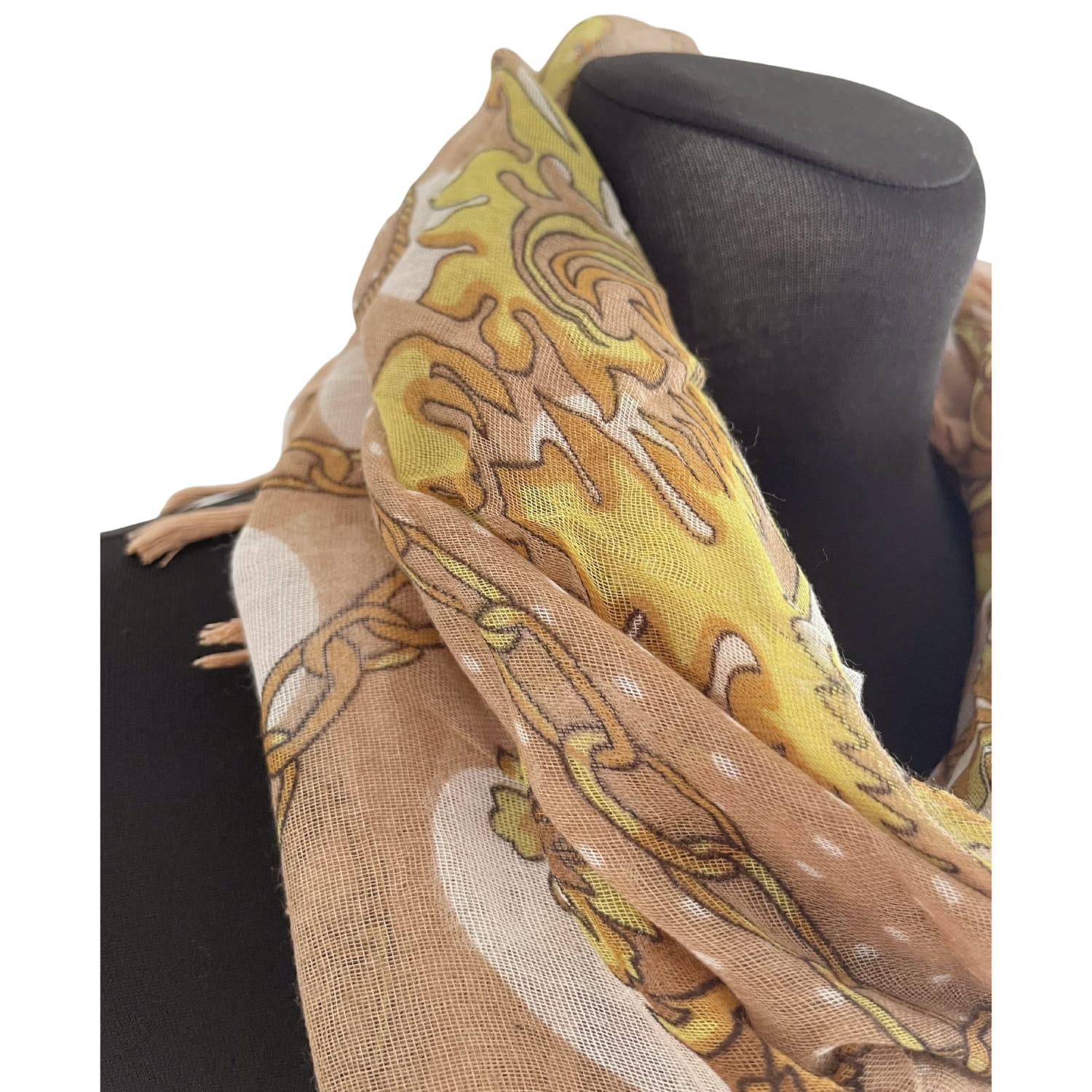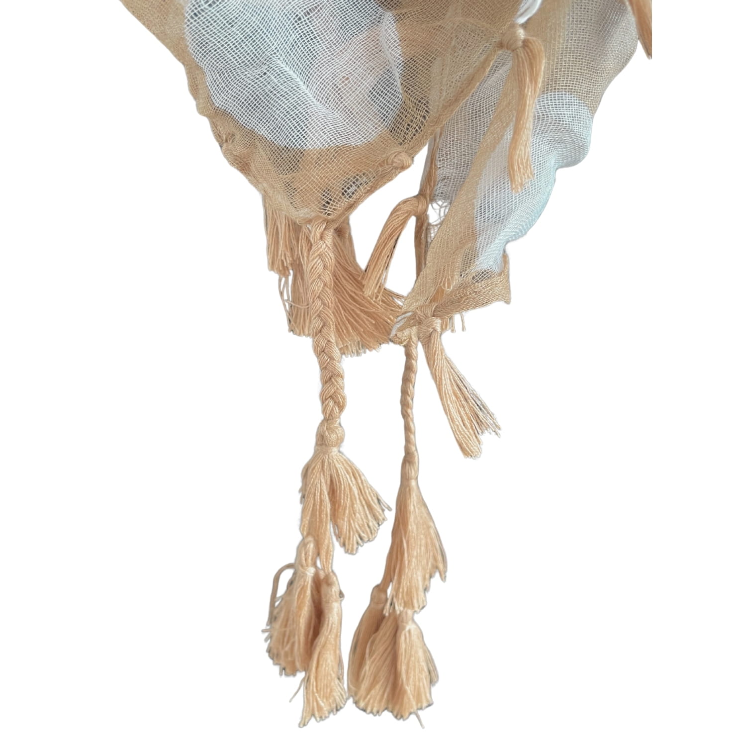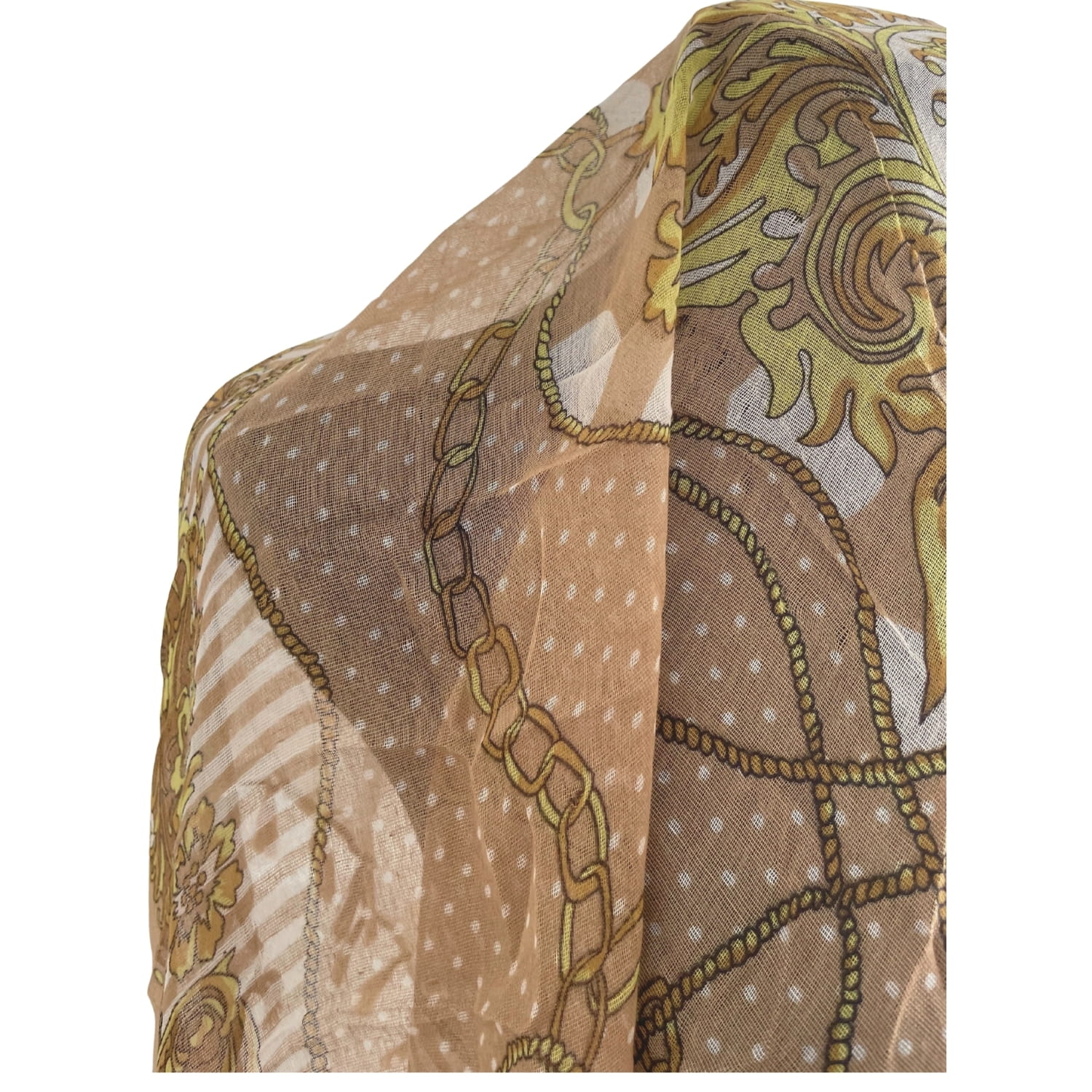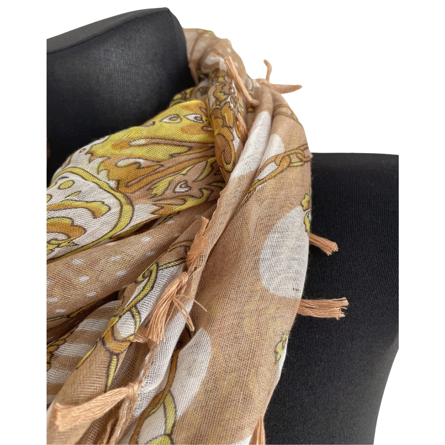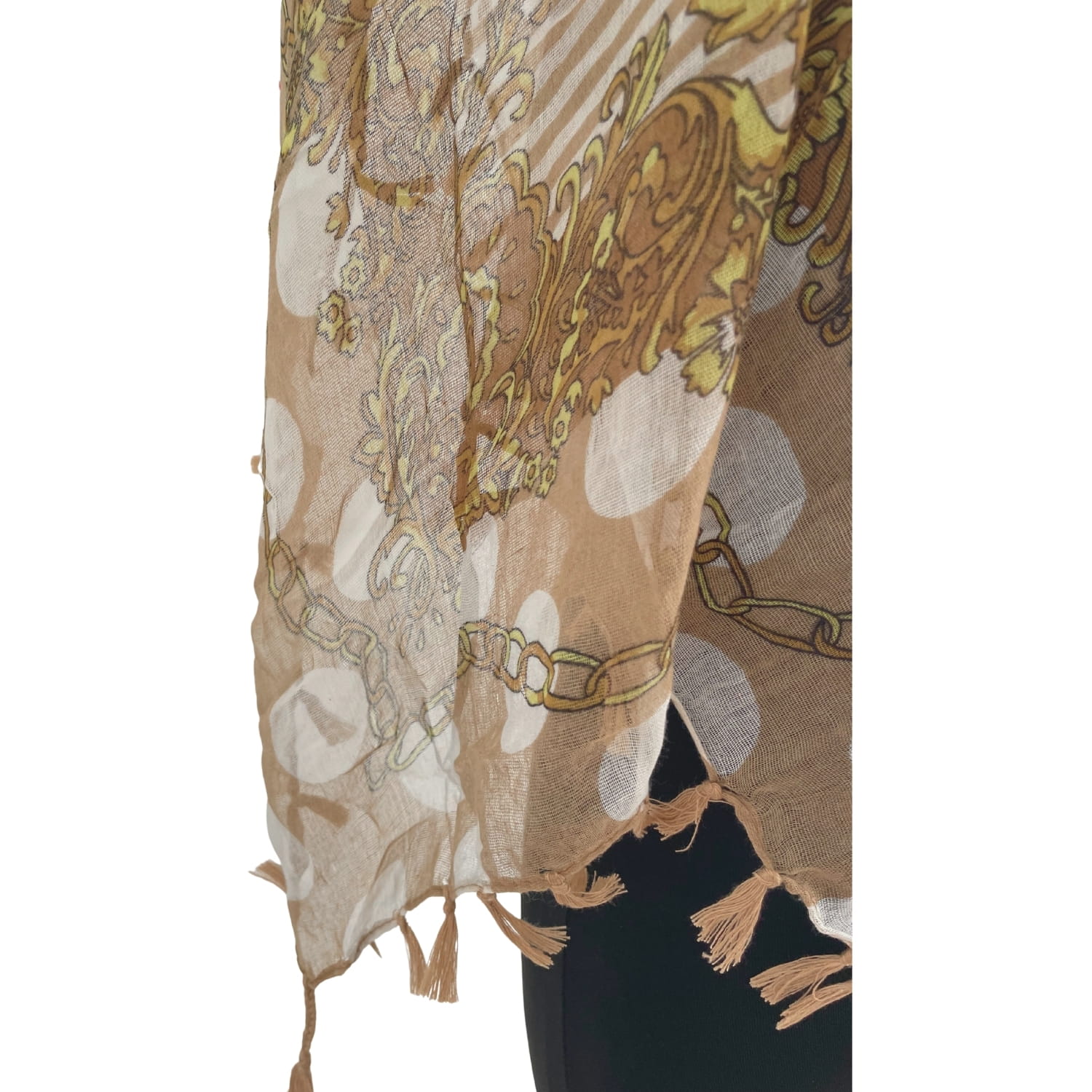 Cienka beżowa damska chusta w białe grochy i złote wzory, z frędzlami - ok. 100 x 100 cm