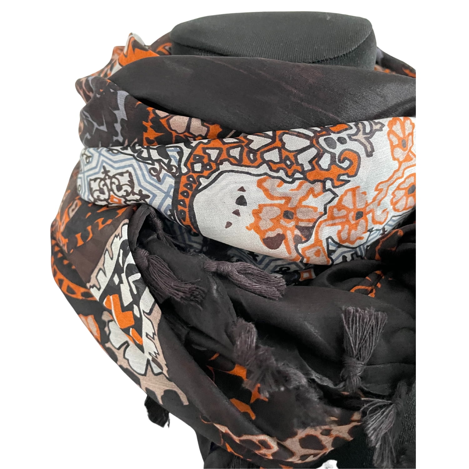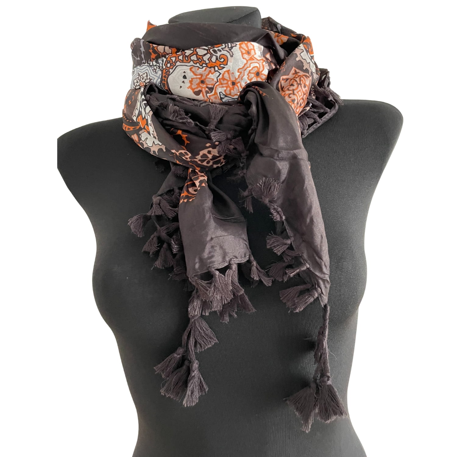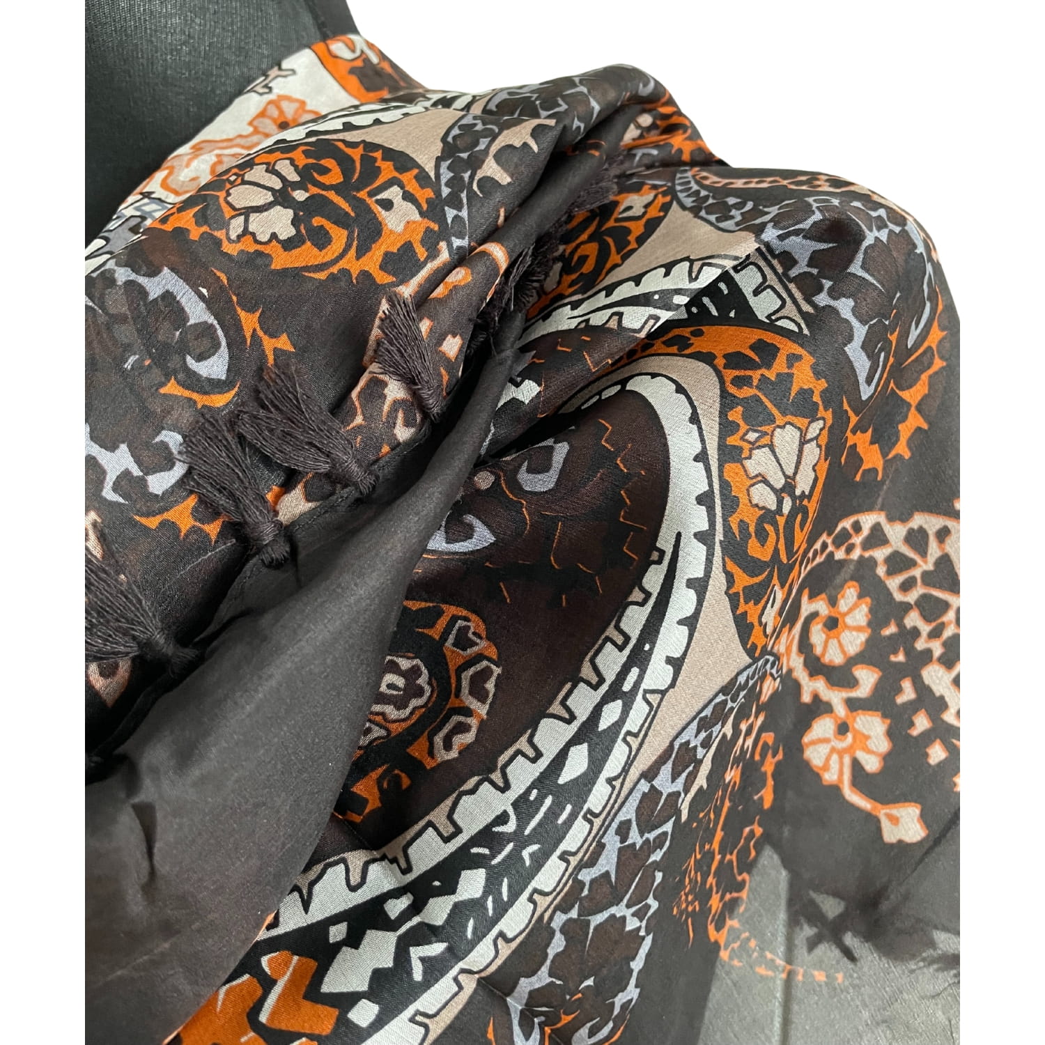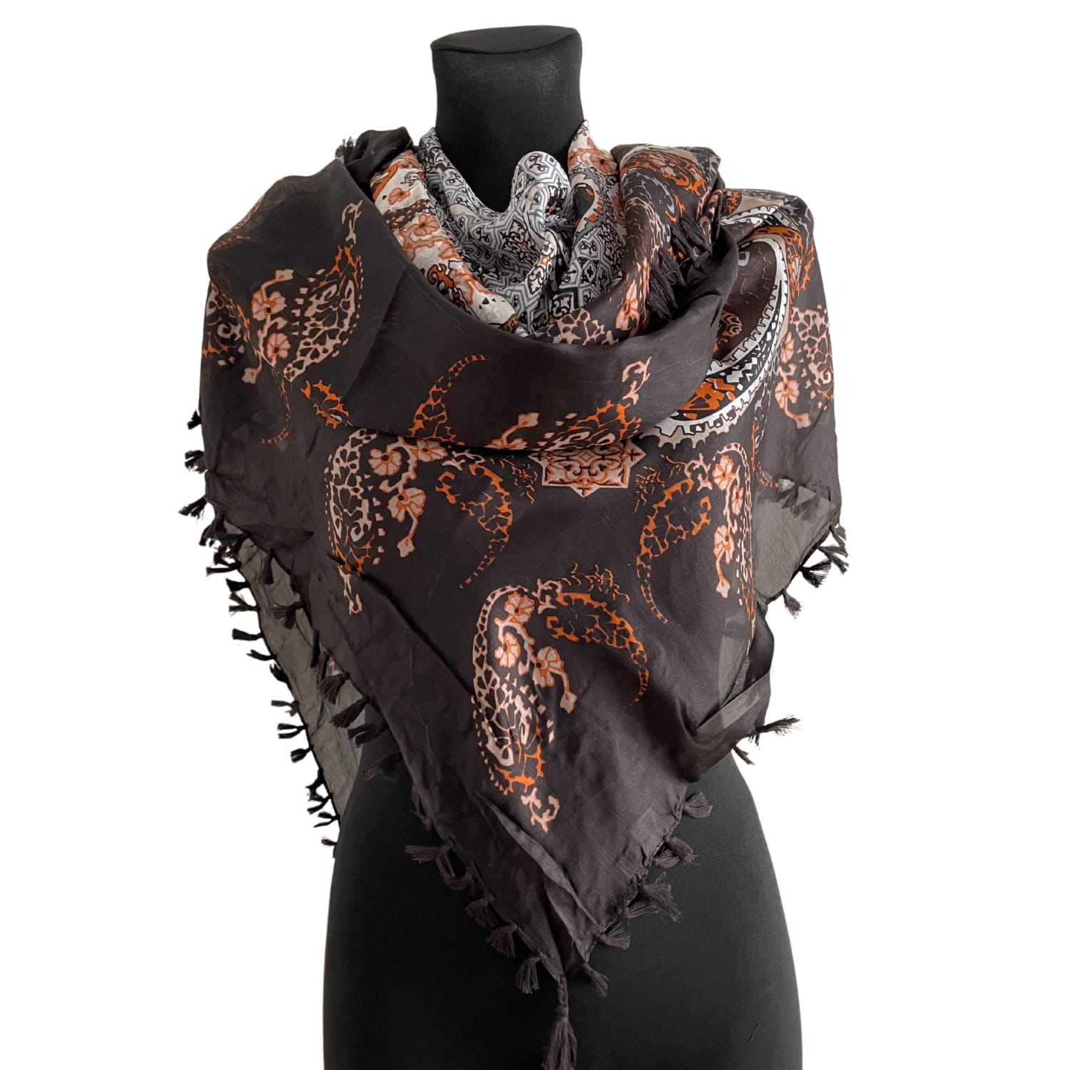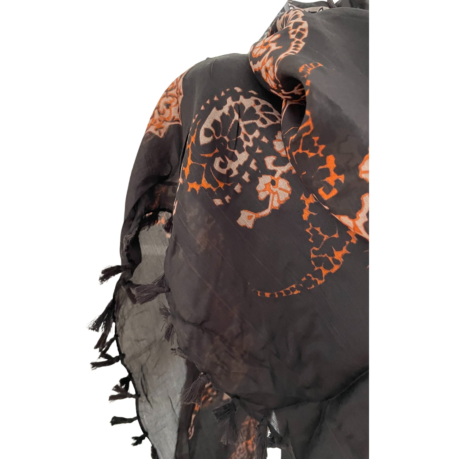 Cienka czarna jedwabna elegancka delikatna damska chusta apaszka w kolorowe orientalne wzory, z frędzlami - ok. 110 x 110 cm
