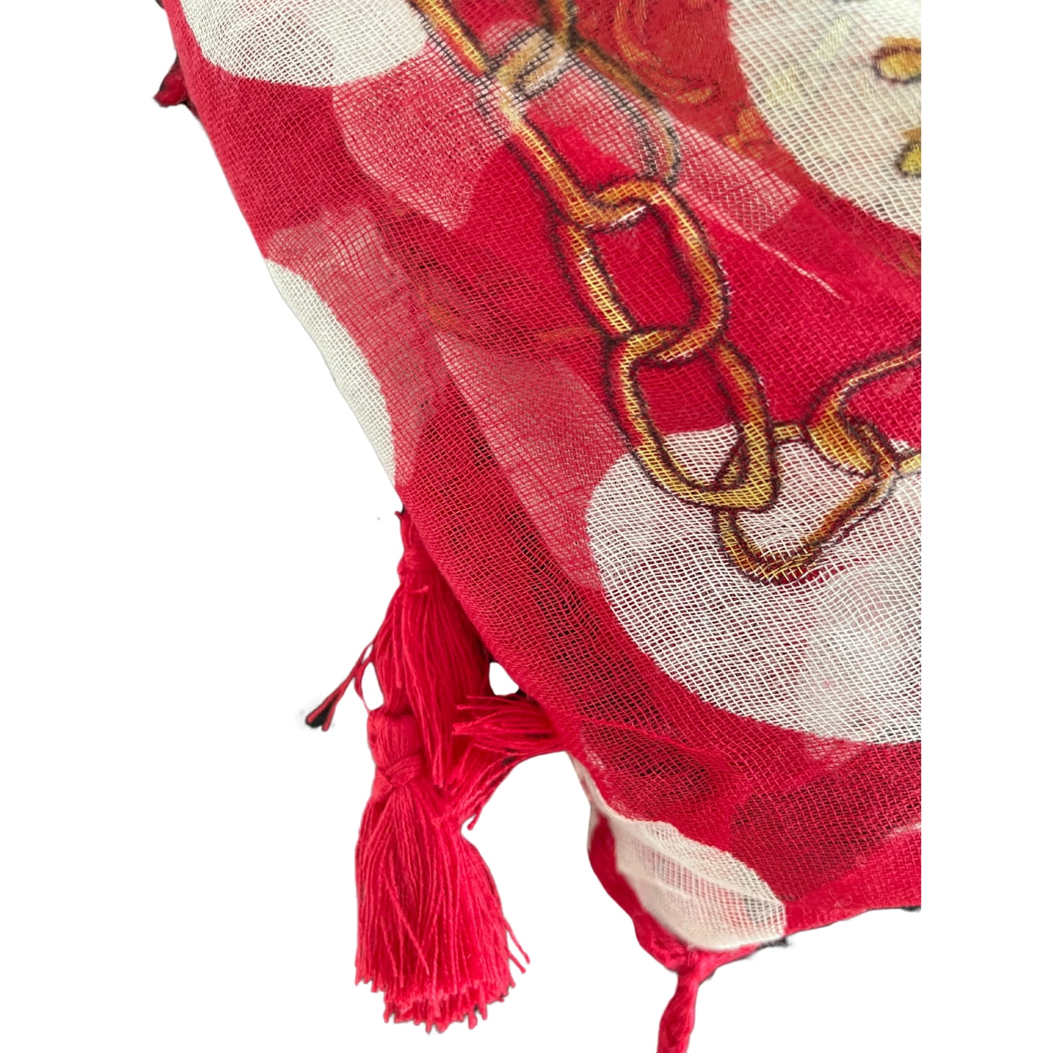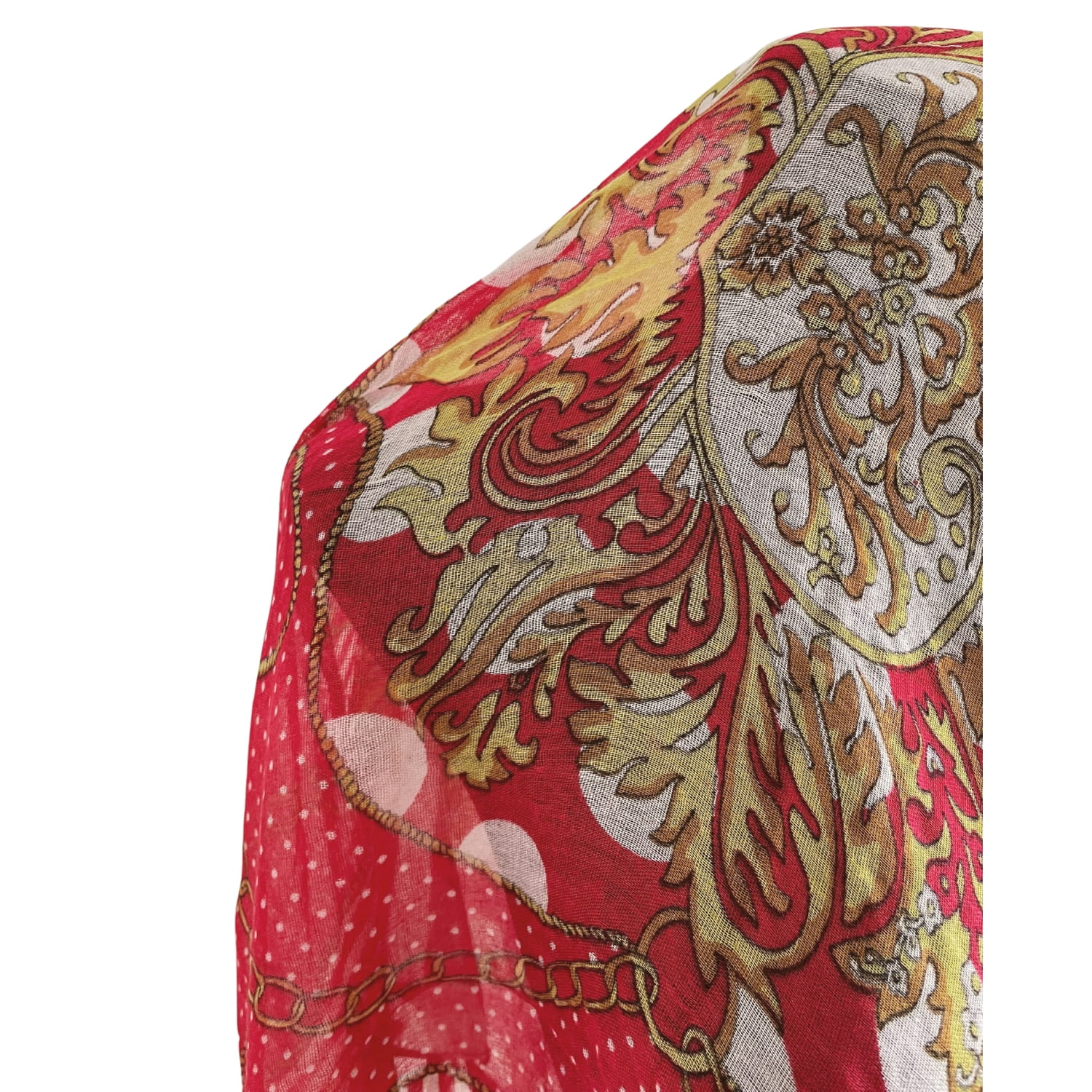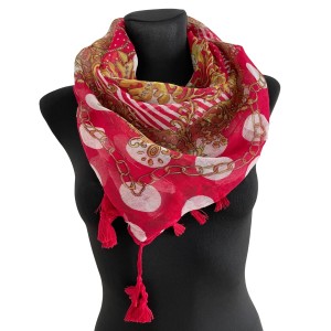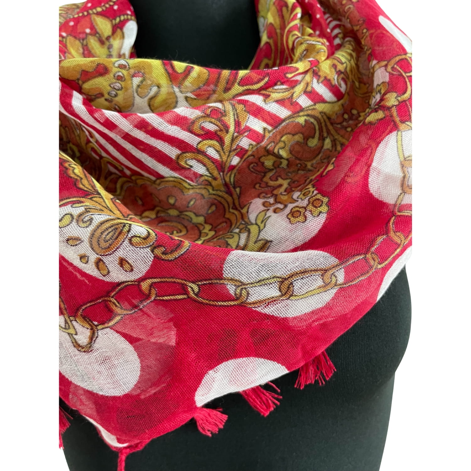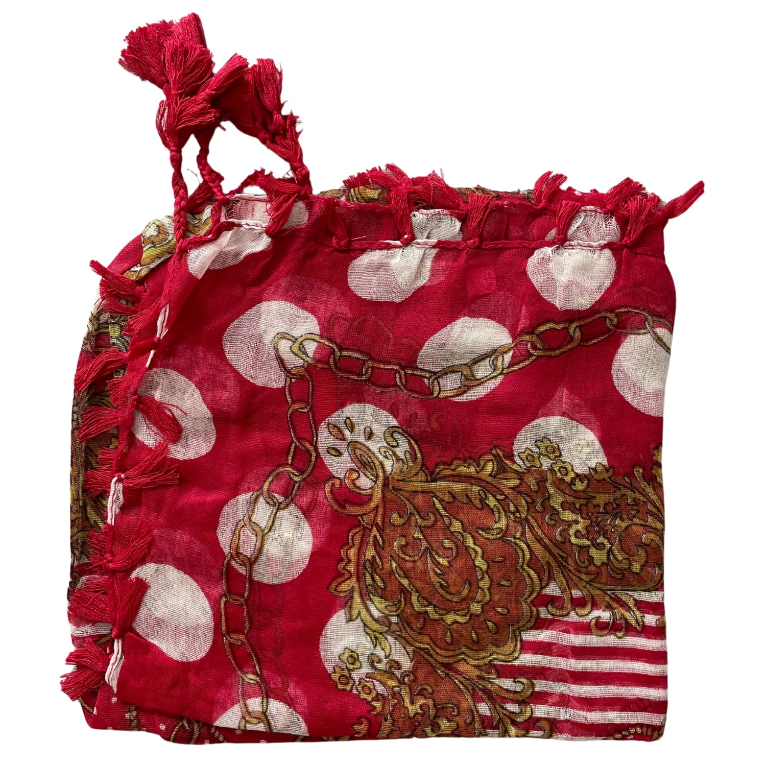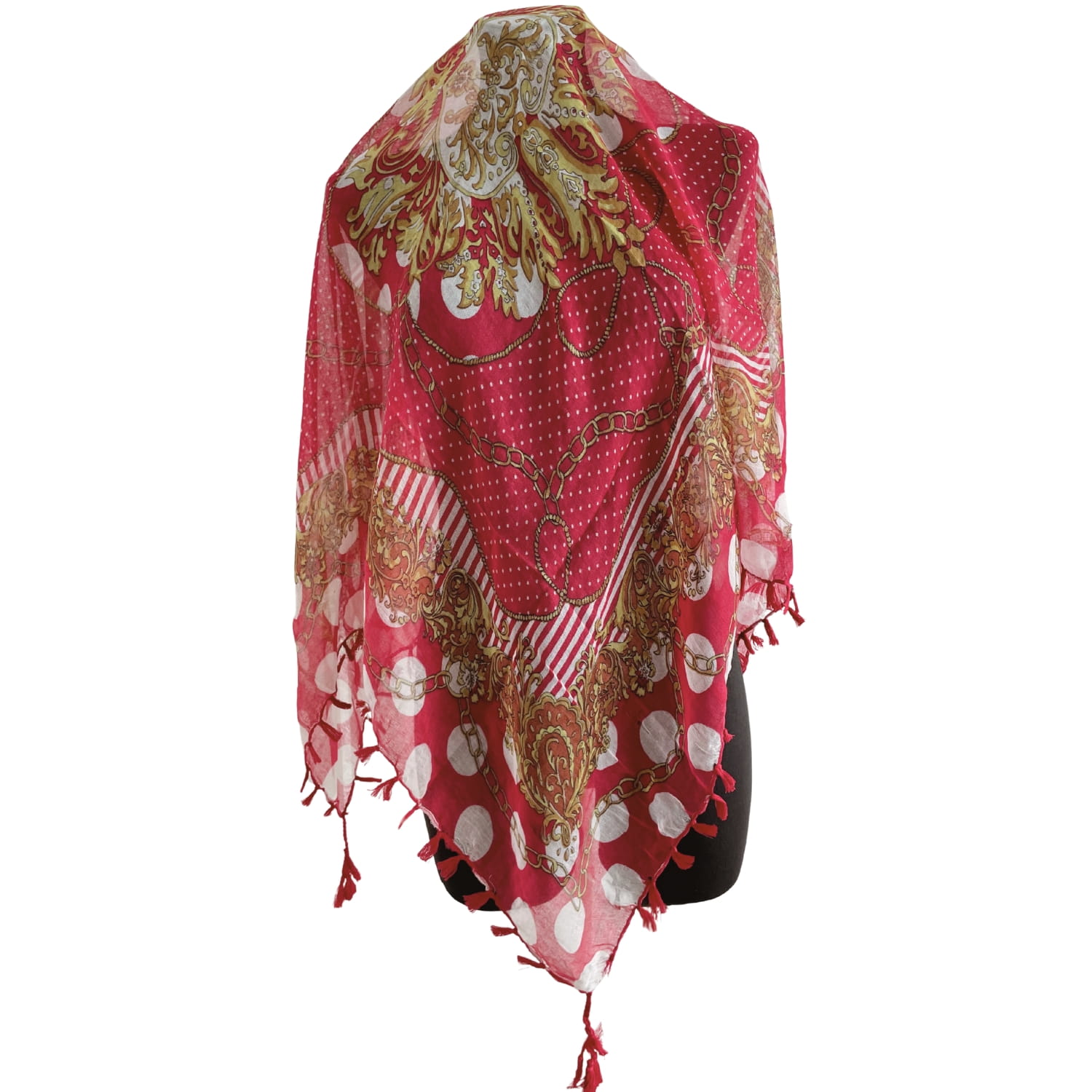 Cienka czerwona damska chusta w białe grochy i złote wzory, z frędzlami - ok. 100 x 100 cm