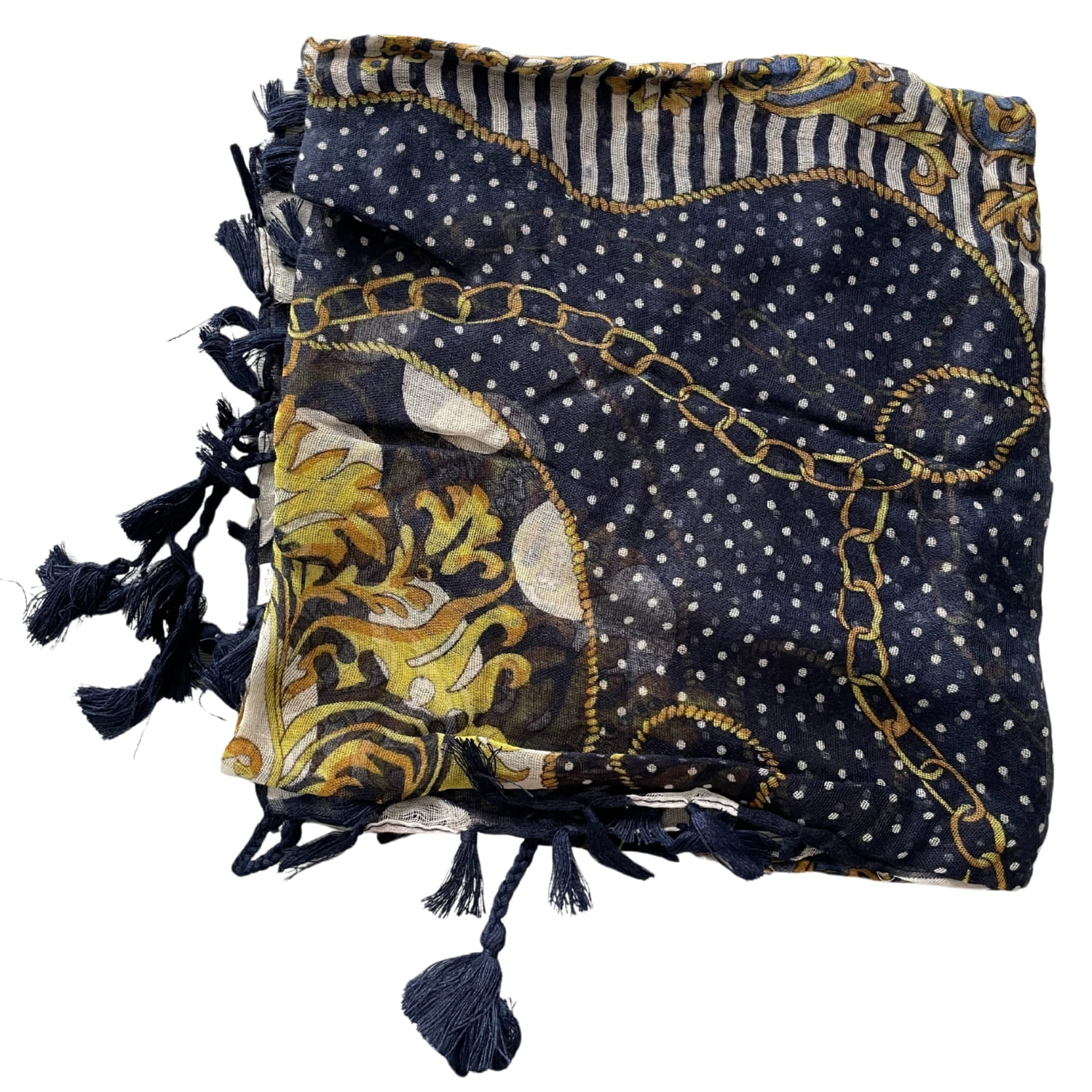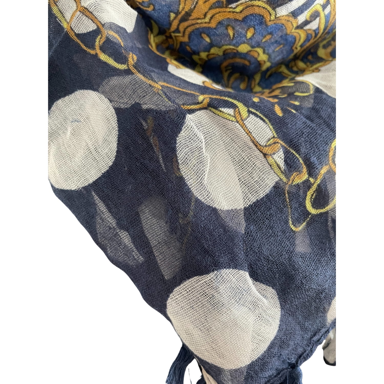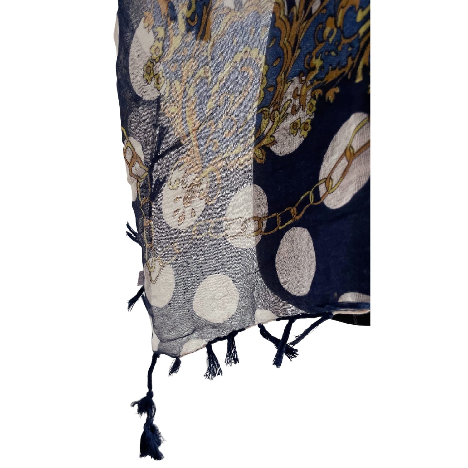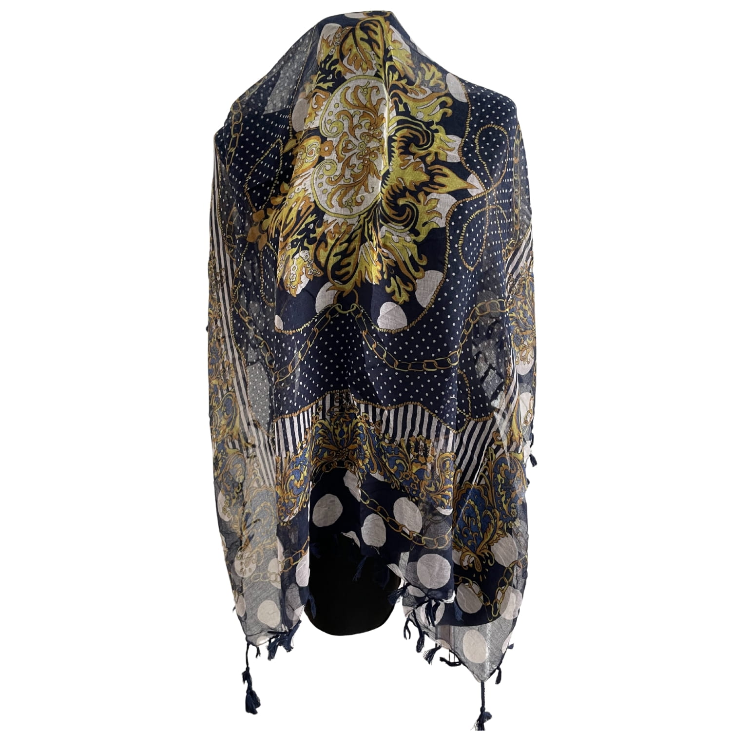 Cienka granatowa damska chusta w białe grochy i złote wzory, z frędzlami - ok. 100 x 100 cm