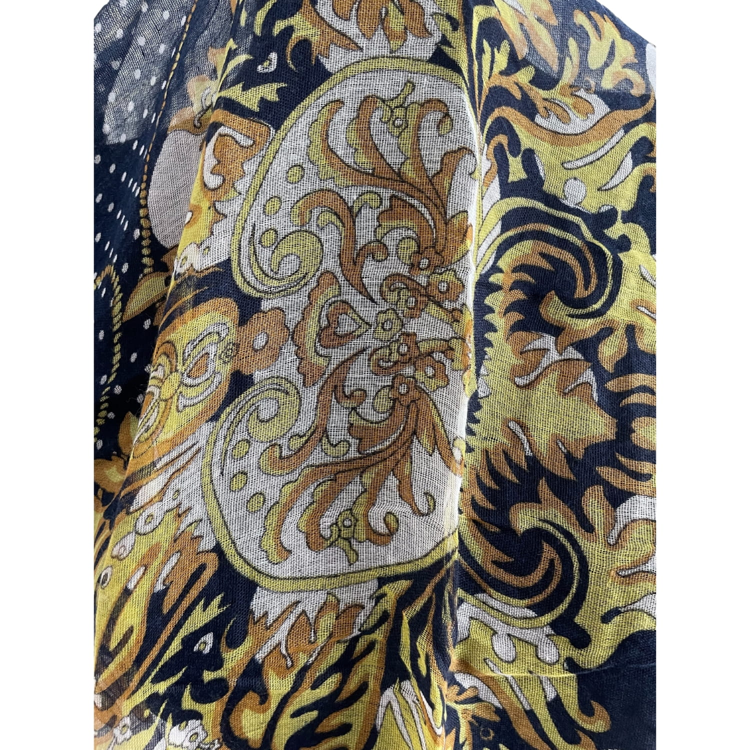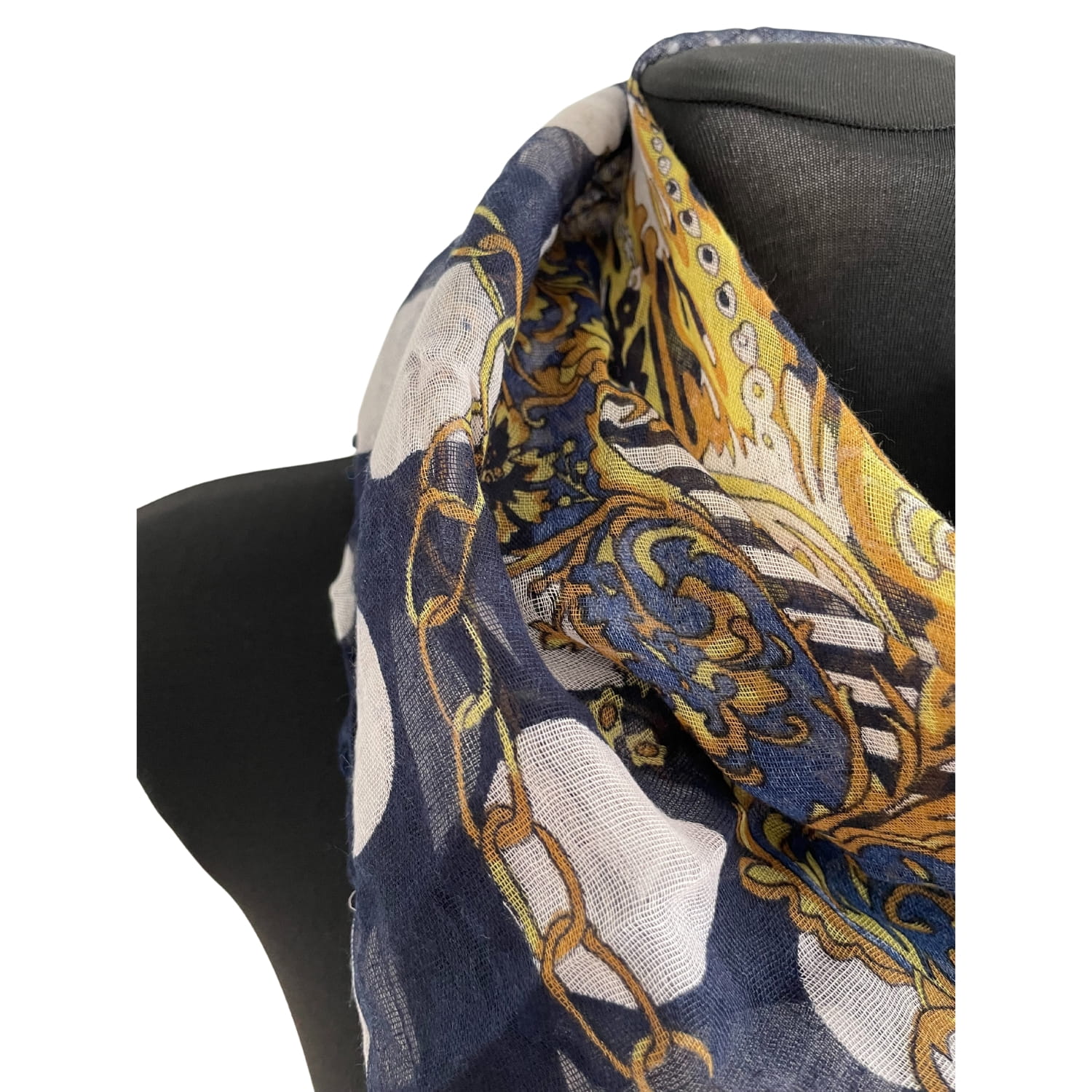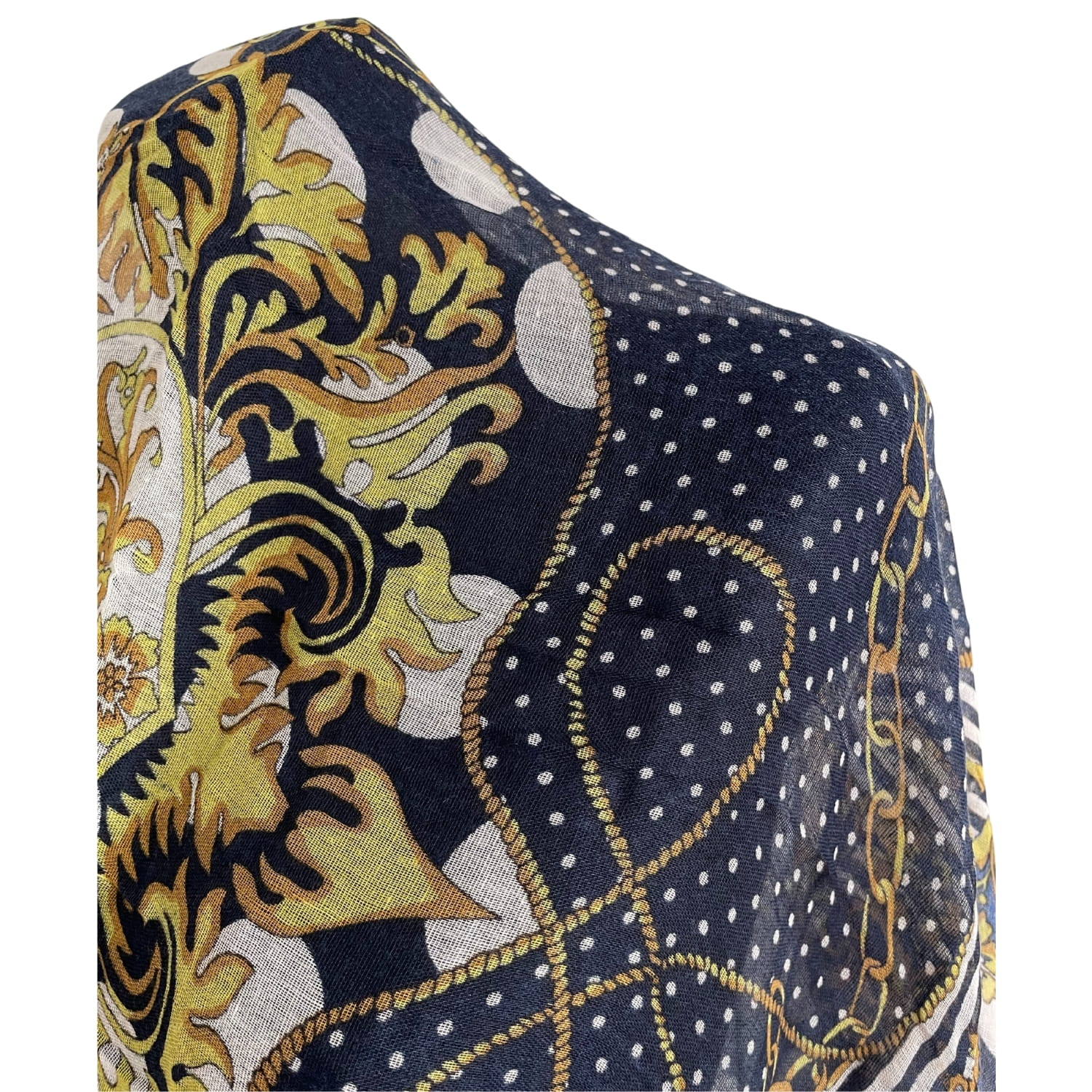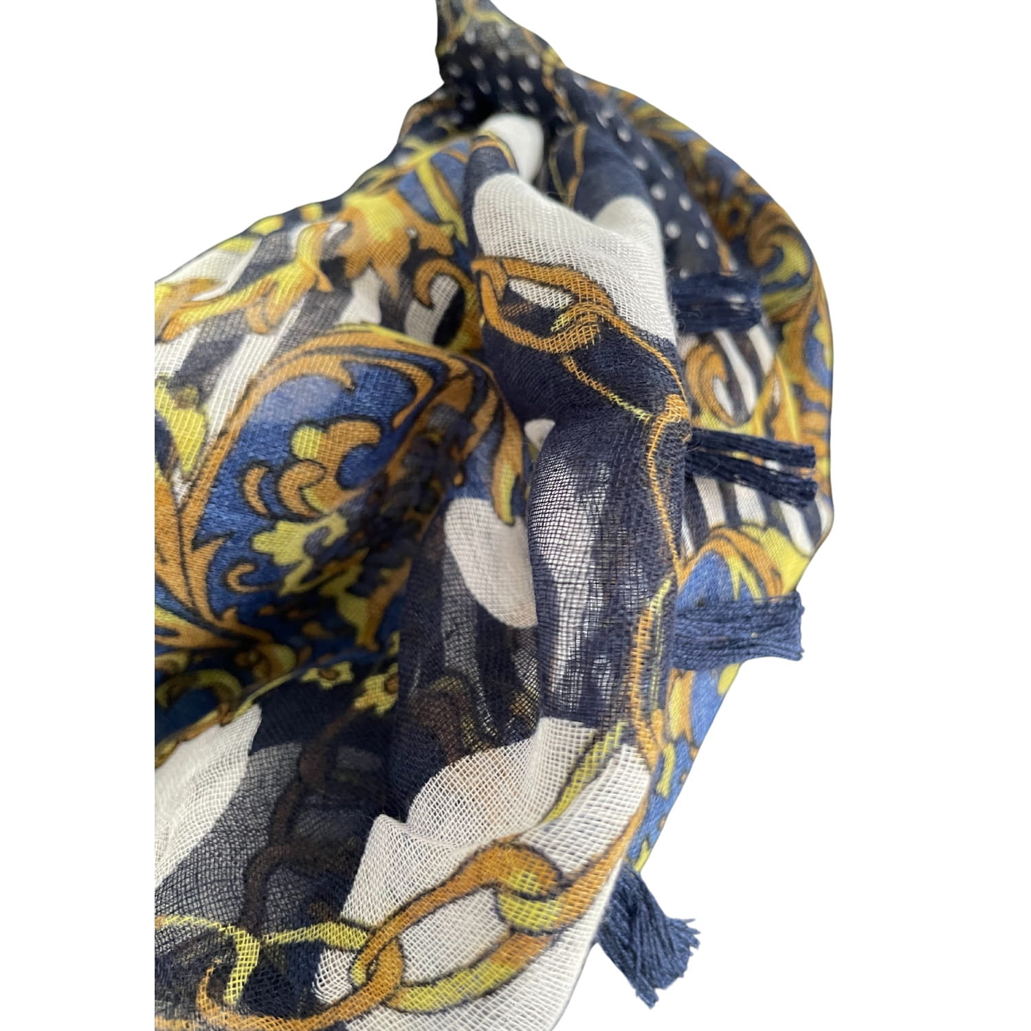 Cienka granatowa damska chusta w białe grochy i złote wzory, z frędzlami - ok. 100 x 100 cm