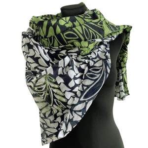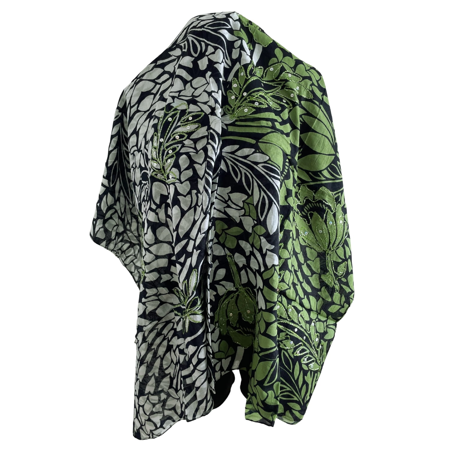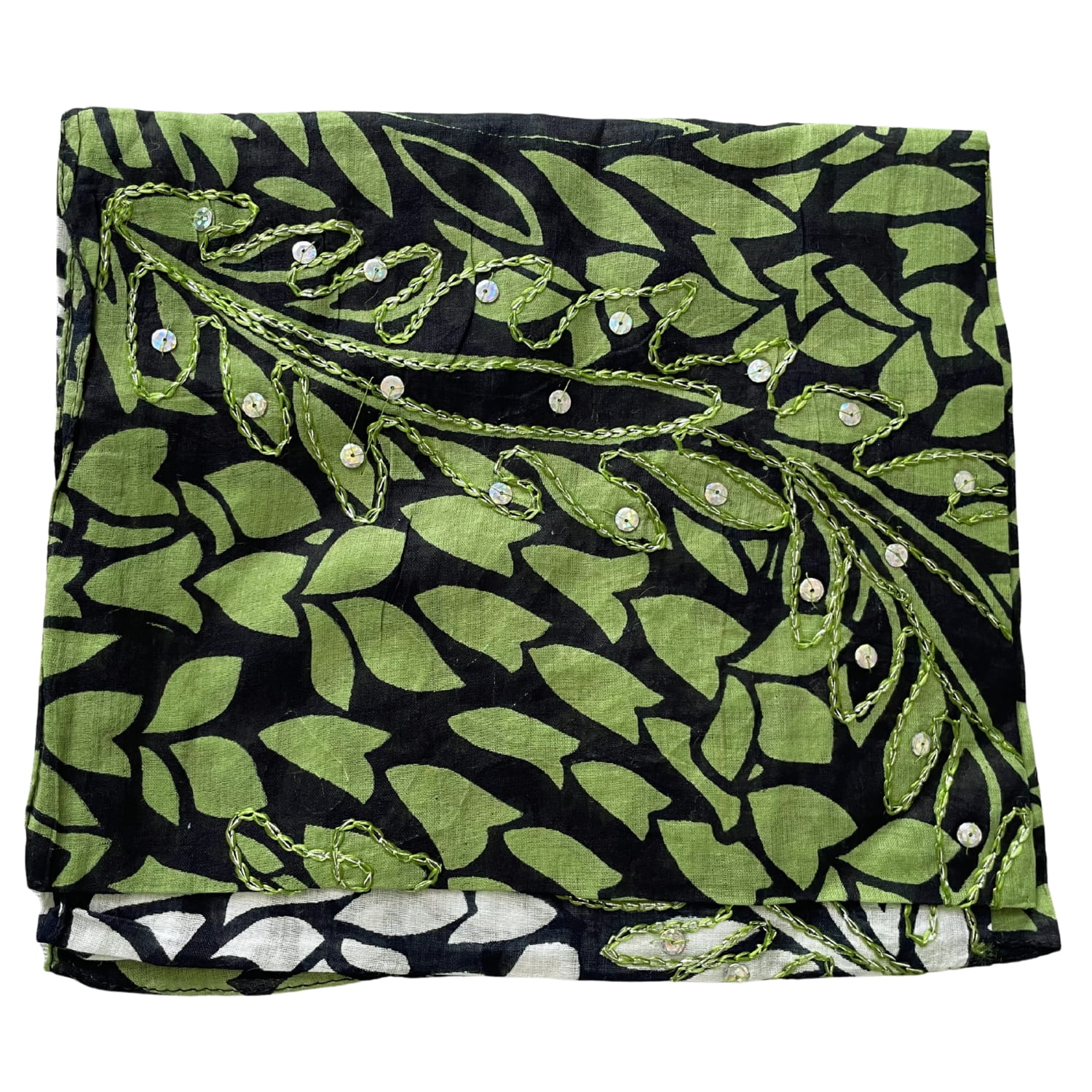 Cienka indyjska bawełniana biało-zielona damska chusta lub pareo w liście z cekinami - ok. 180 x 105 cm