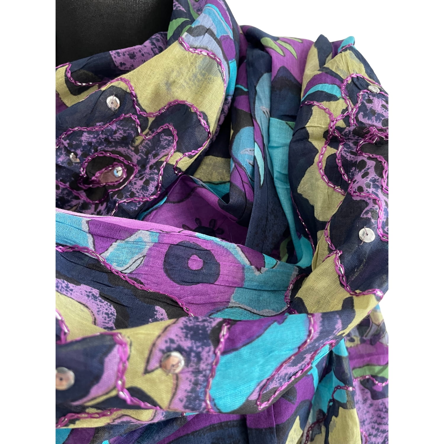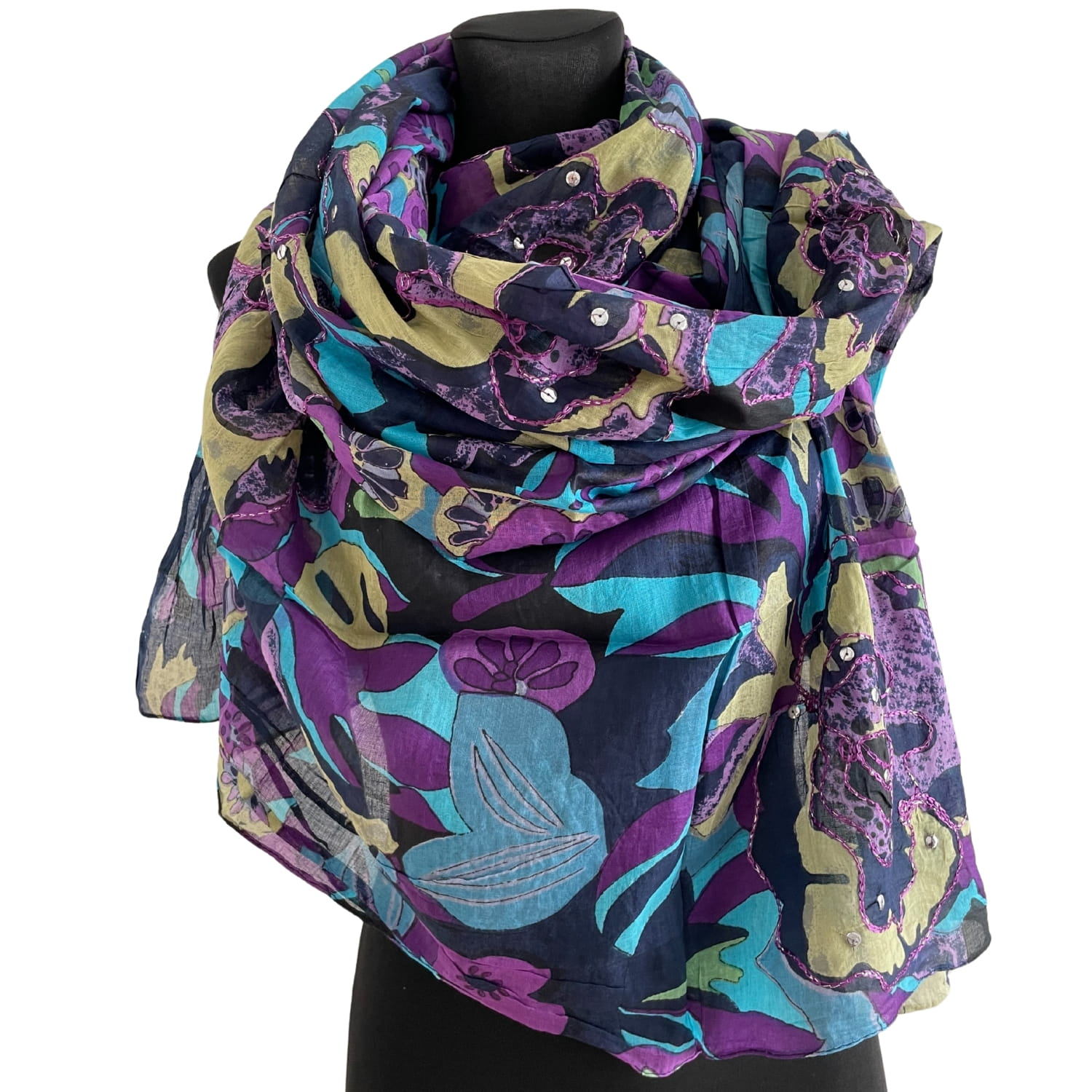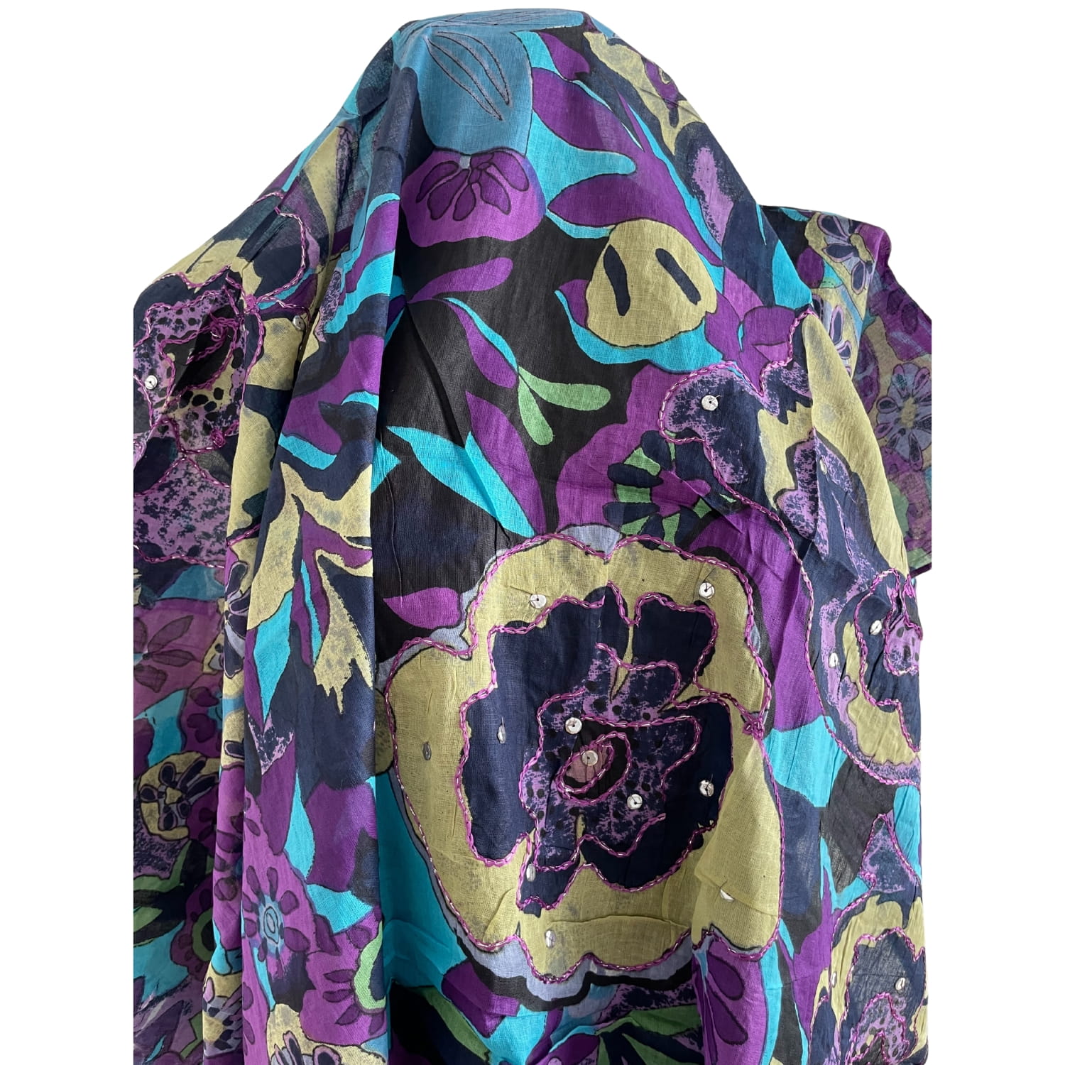 Cienka indyjska bawełniana wielokolorowa damska chusta lub pareo w kwiatowe wzory z cekinami (fiolet, niebieski, oliwka) - ok. 180 x 105 cm