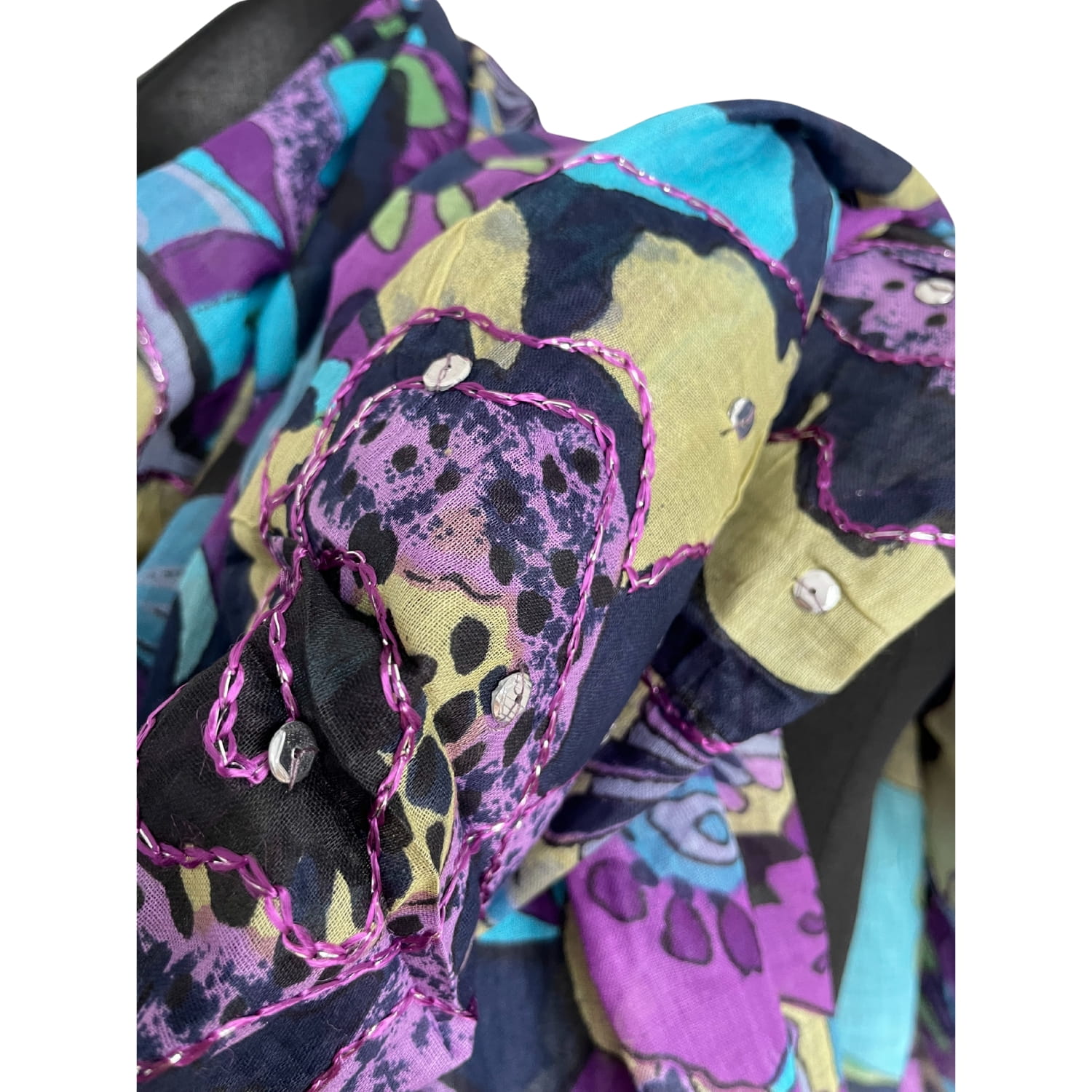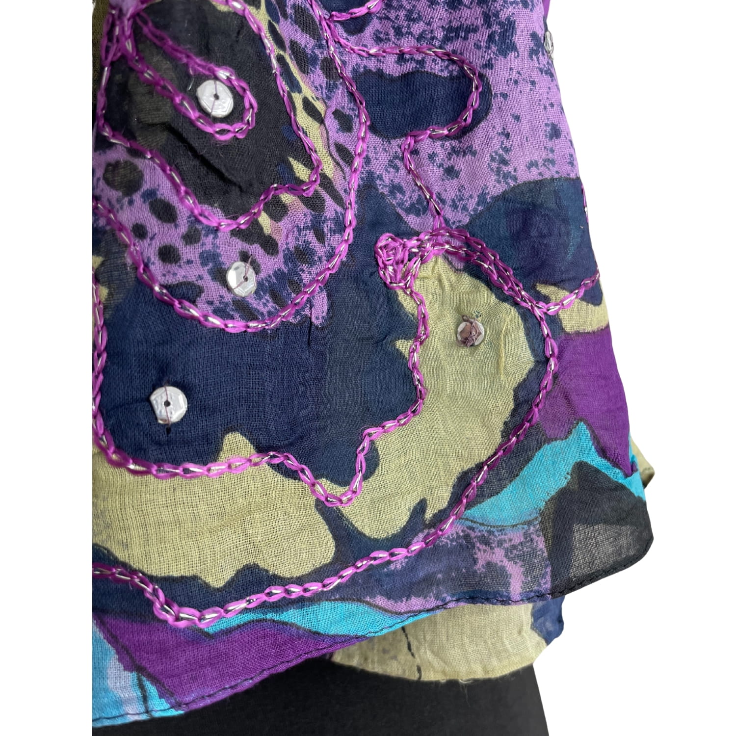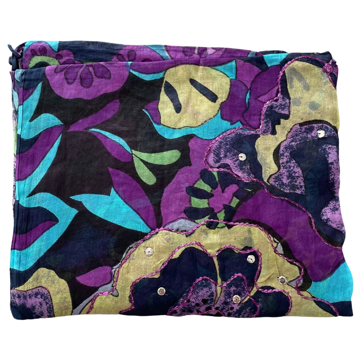 Cienka indyjska bawełniana wielokolorowa damska chusta lub pareo w kwiatowe wzory z cekinami (fiolet, niebieski, oliwka) - ok. 180 x 105 cm
