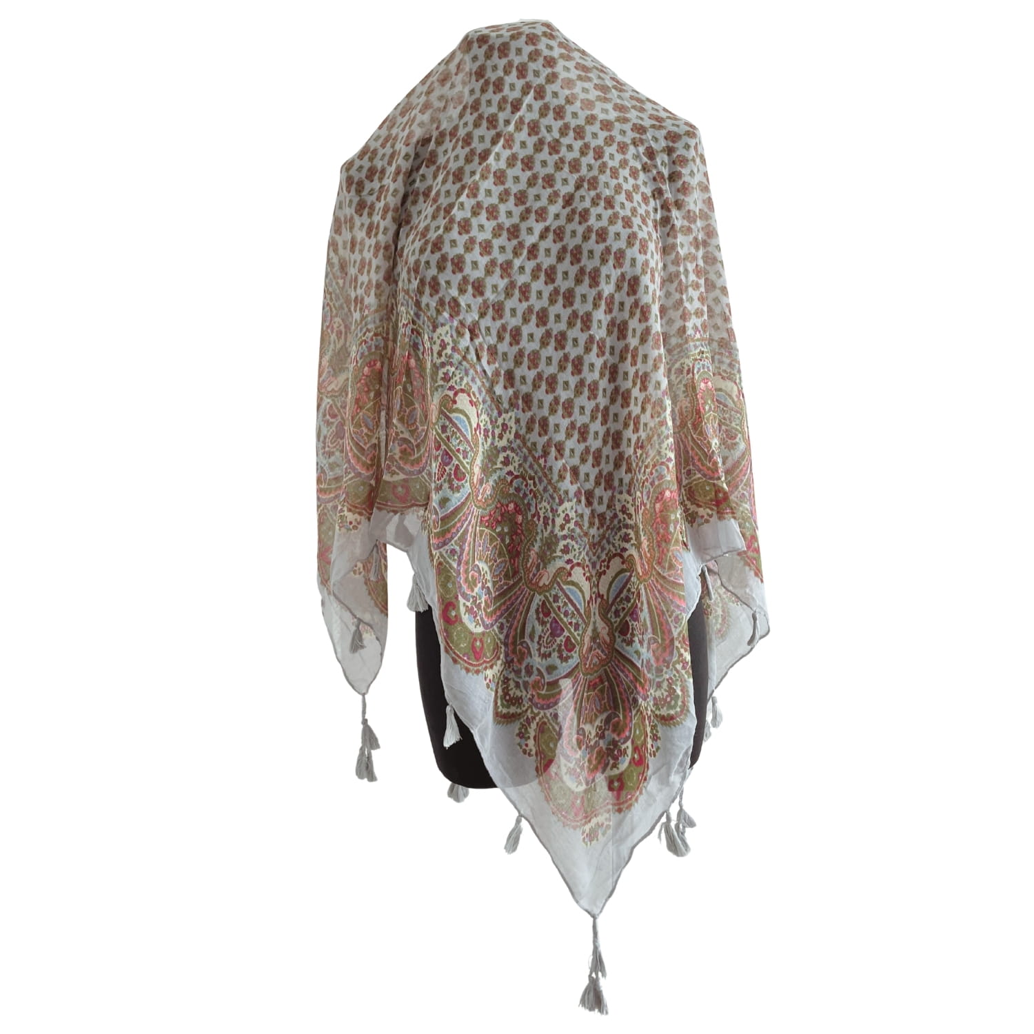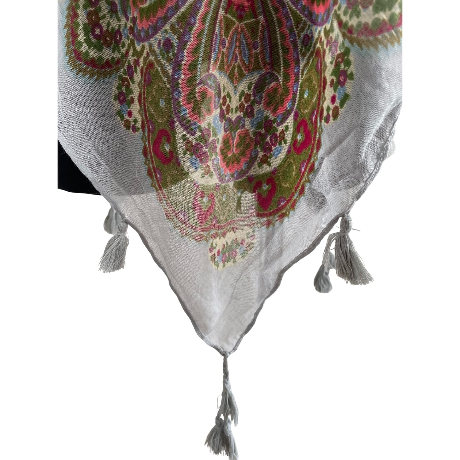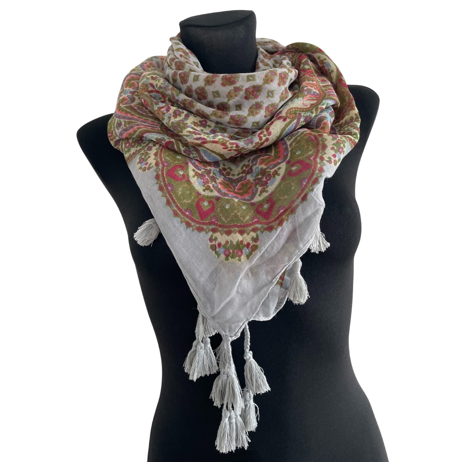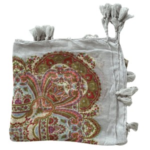 Cienka jasnoszara kolorowa damska chusta w orientalne wzory etno paisley, z frędzlami - ok. 110 x 110 cm