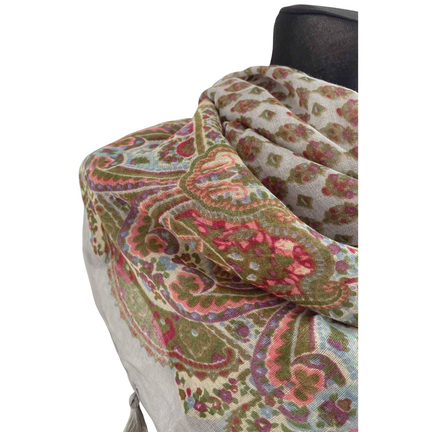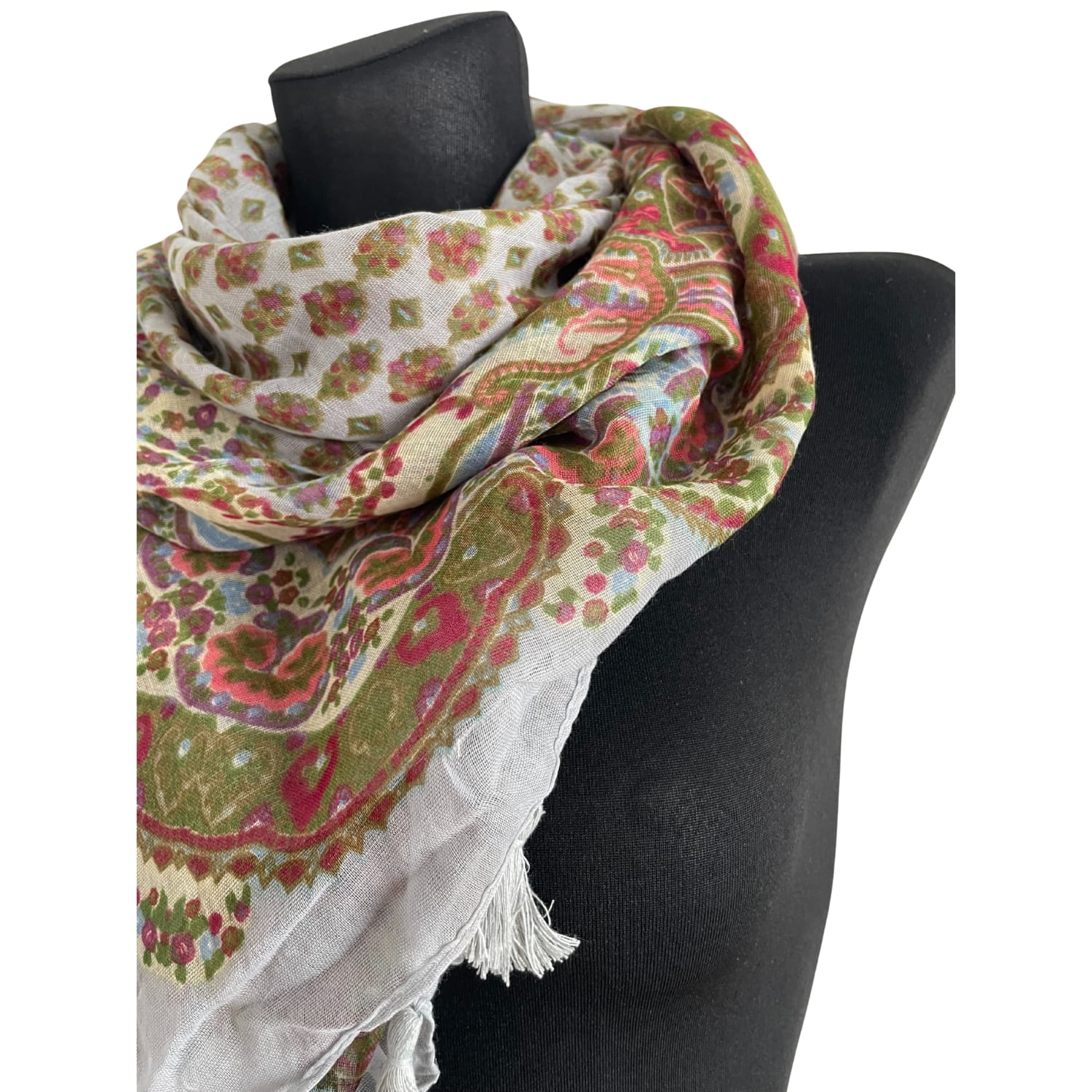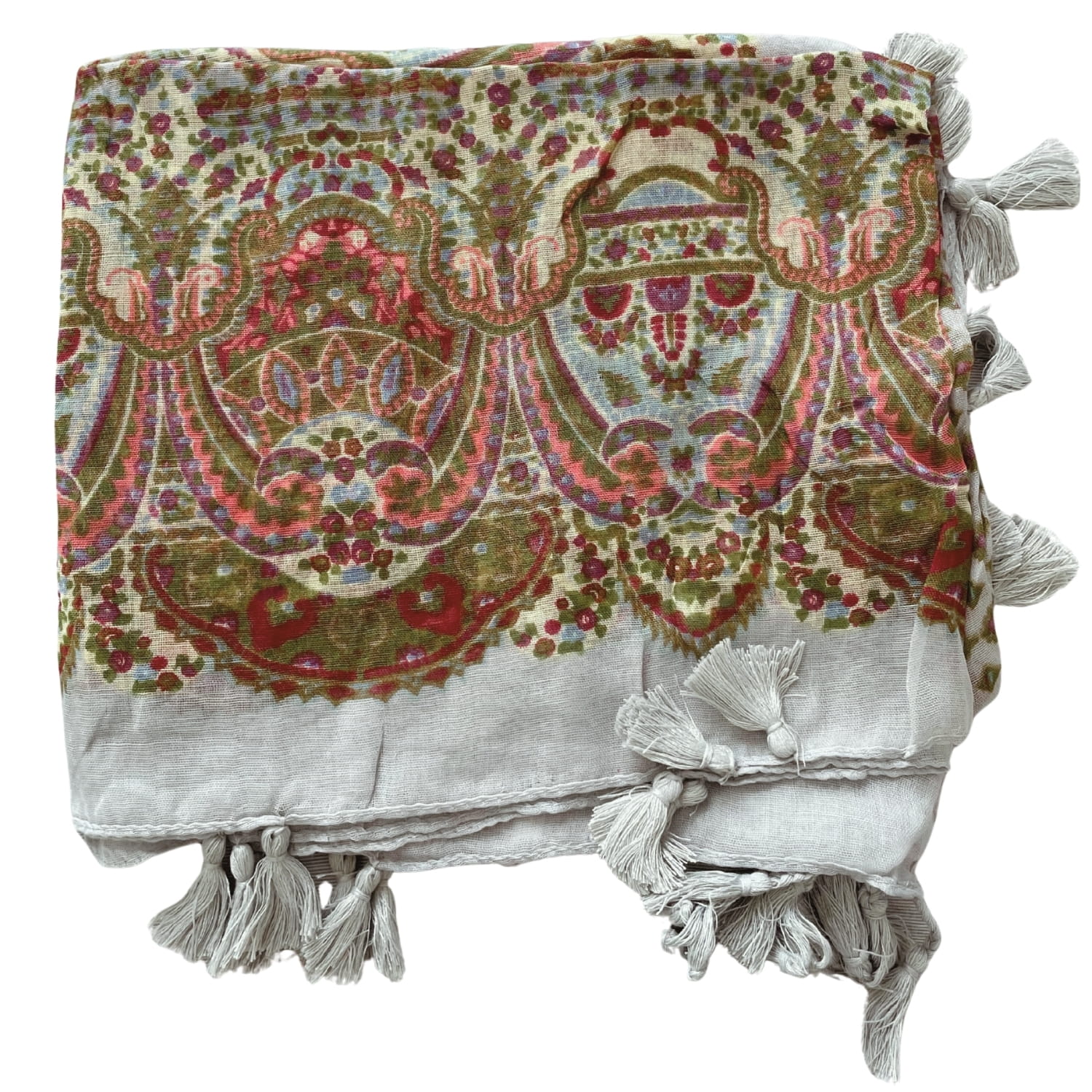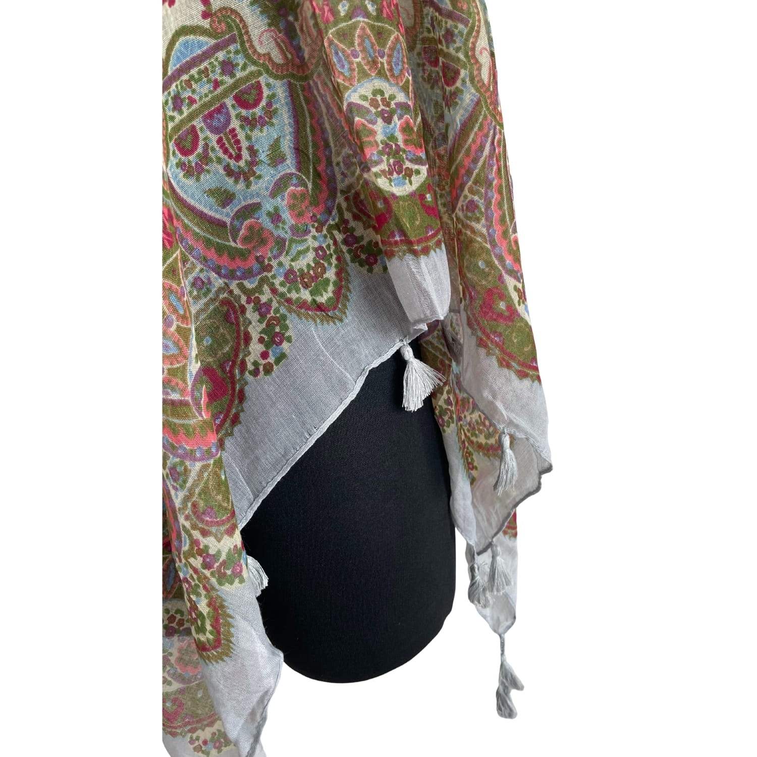 Cienka jasnoszara kolorowa damska chusta w orientalne wzory etno paisley, z frędzlami - ok. 110 x 110 cm