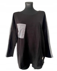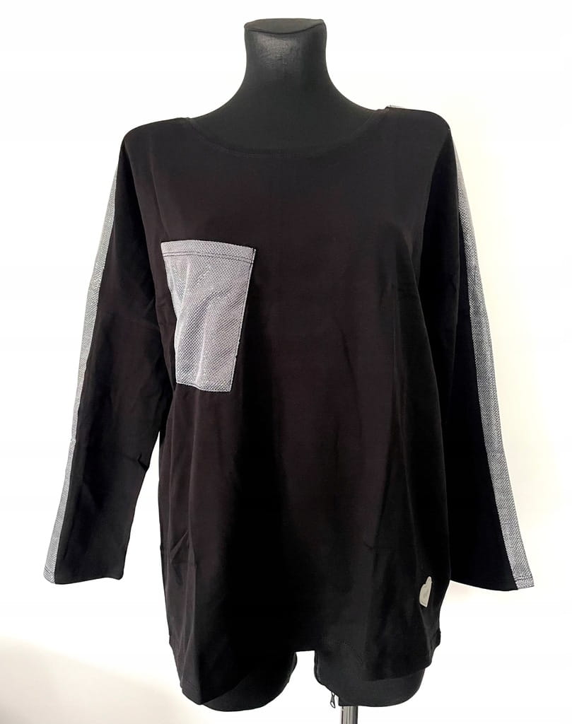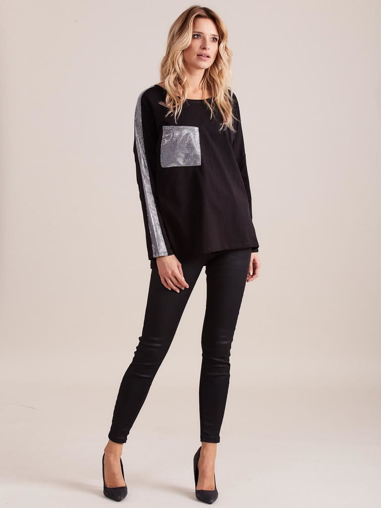 Czarna luźna damska bluzka ze srebrną kieszenią glamour, z długim rękawem - rozmiar 38 M