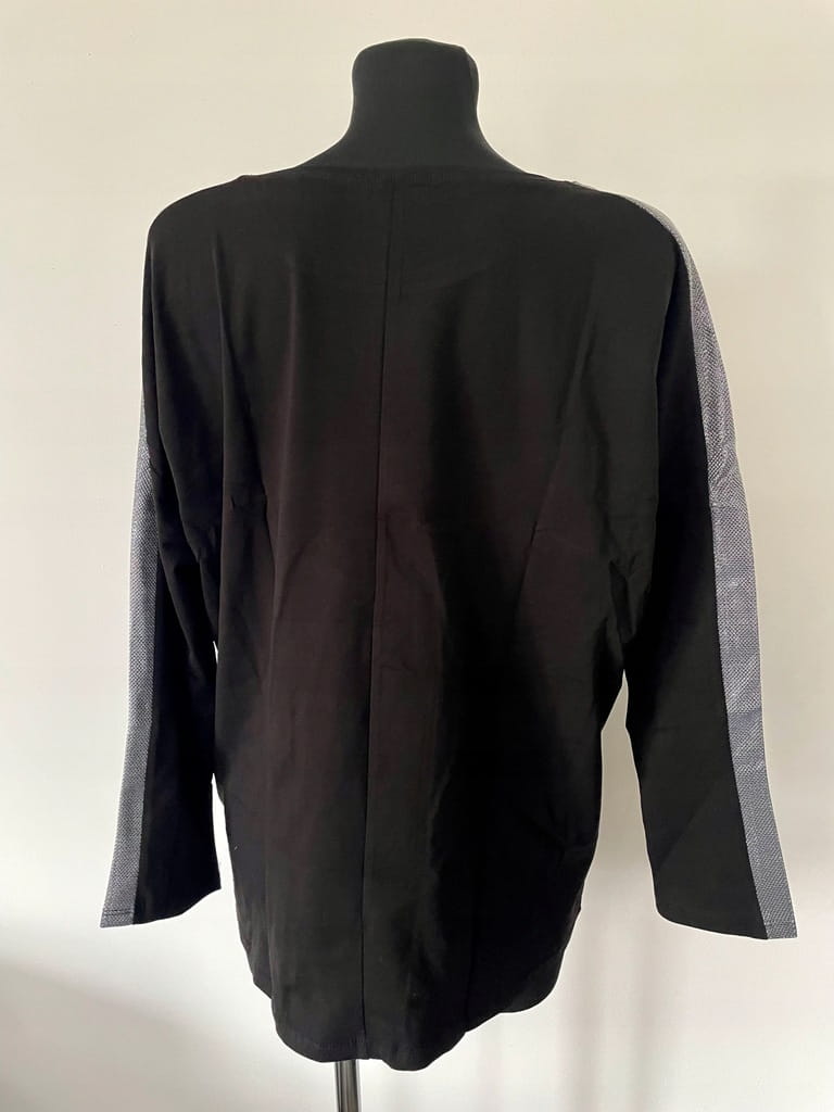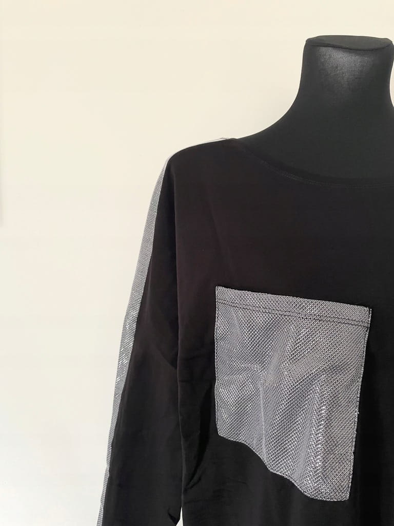 Luźna czarna bluzka z długim rękawem ze srebrną kieszenią i srebrnymi paskami na rękawach