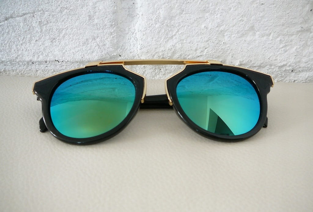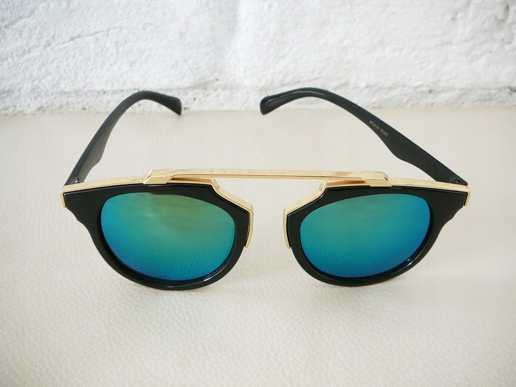 Czarno-złote okulary przeciwsłoneczne z niebiesko-zielonymi lustrzanymi szkłami