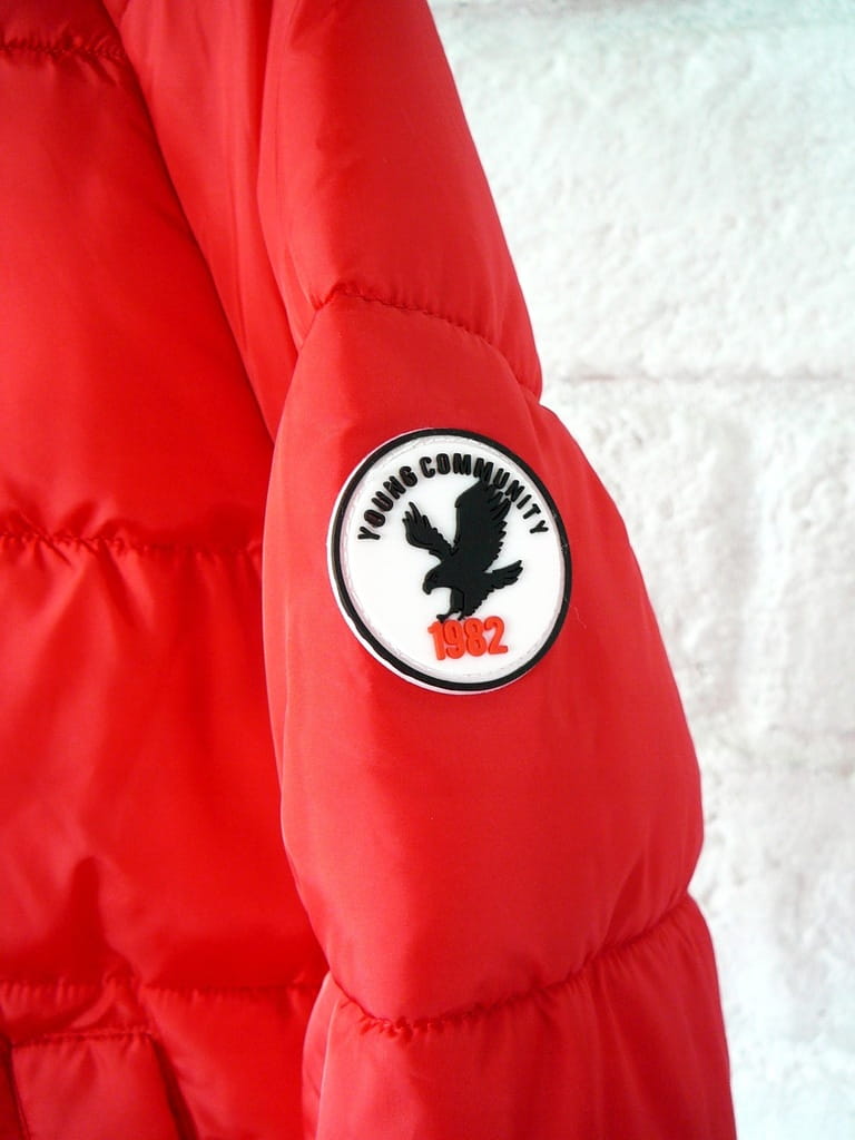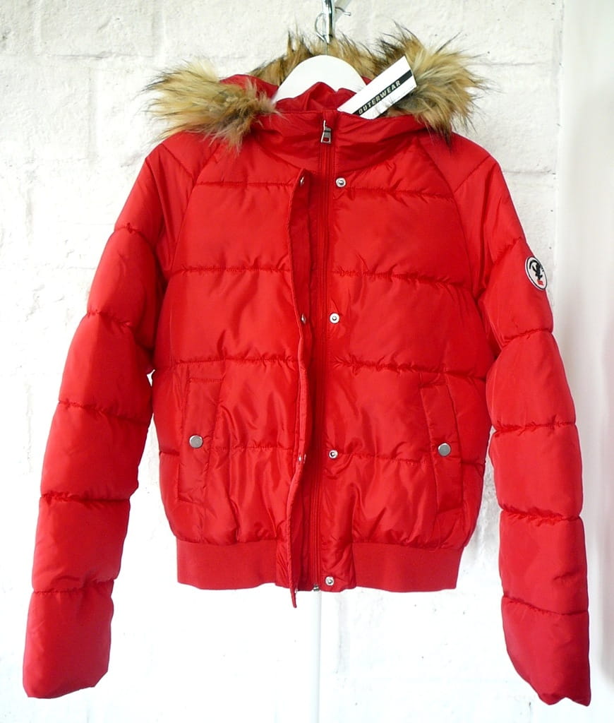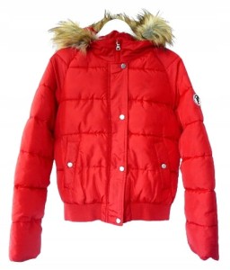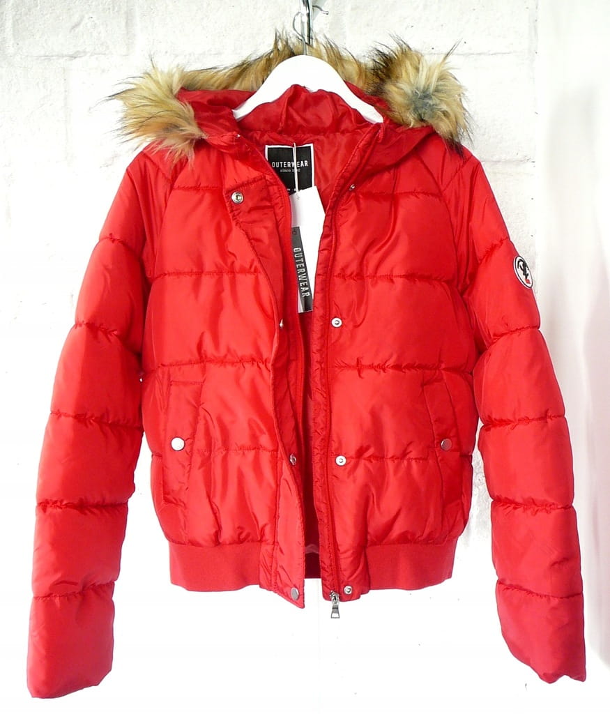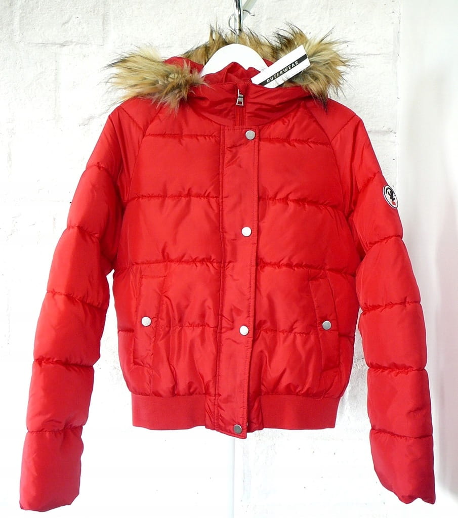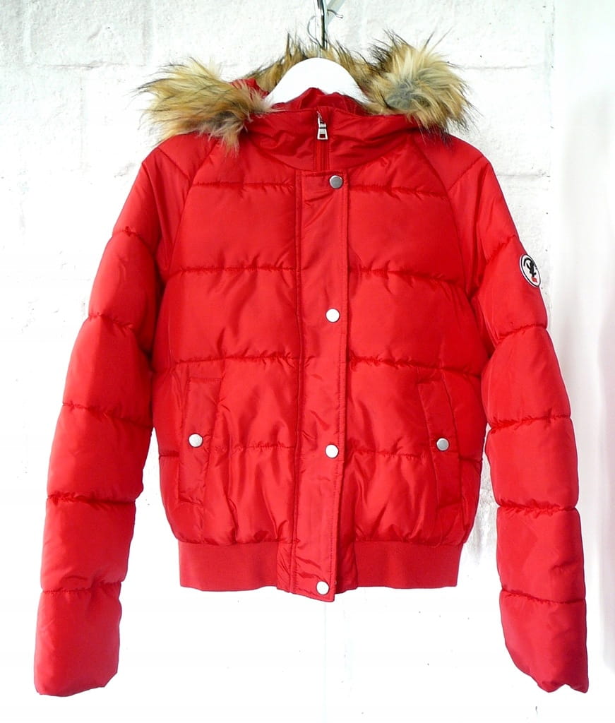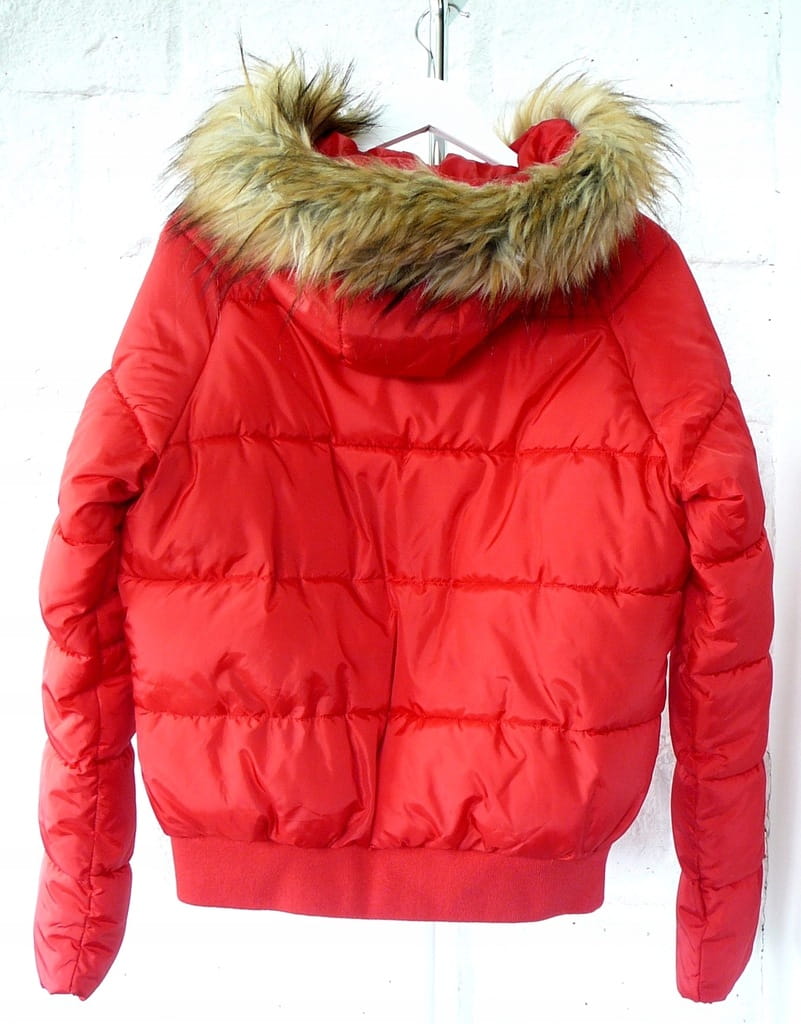 Czerwona ocieplana damska zimowa kurtka z kapturem obszytym sztucznym futrem, z kieszeniami, zapinana na zamek i zatrzaski - rozmiar 36/38 S/M - Jennyfer
