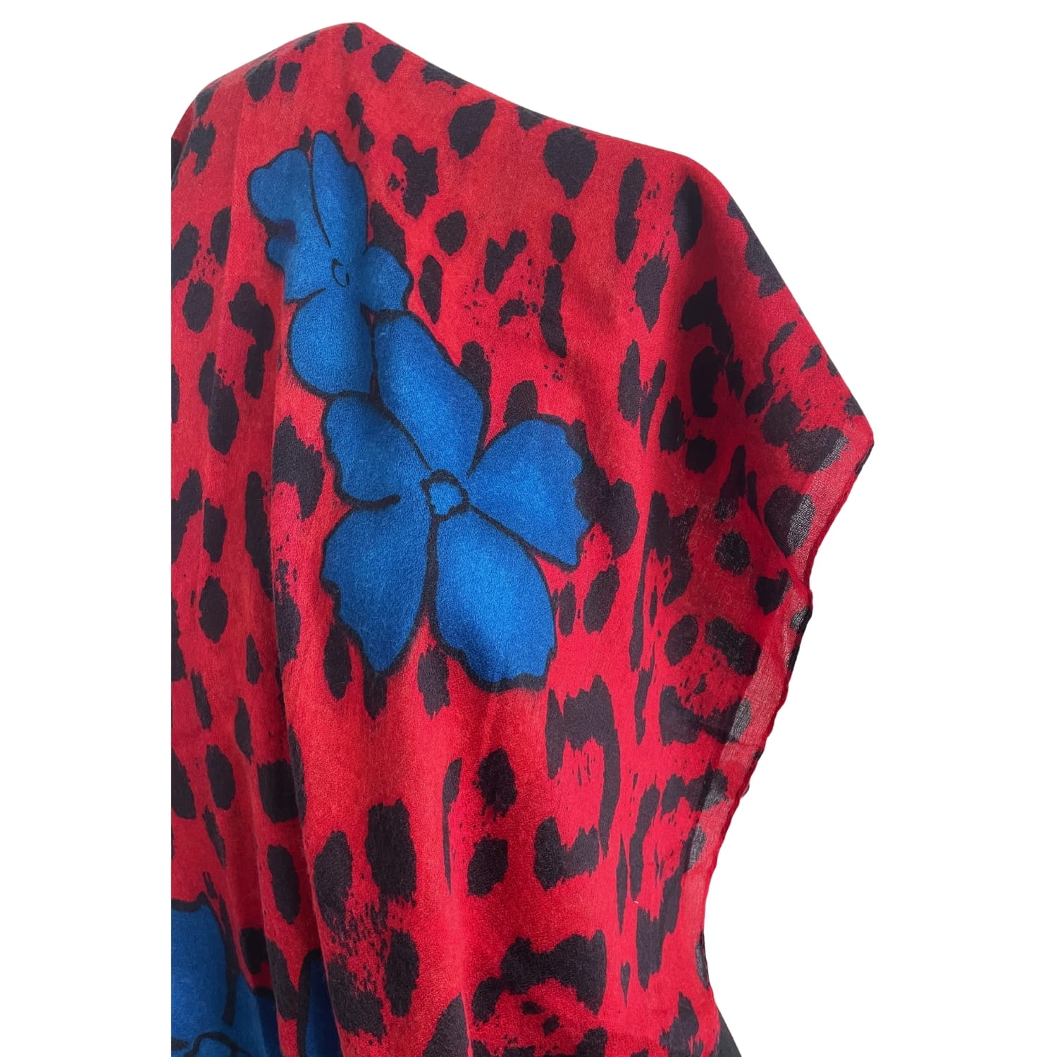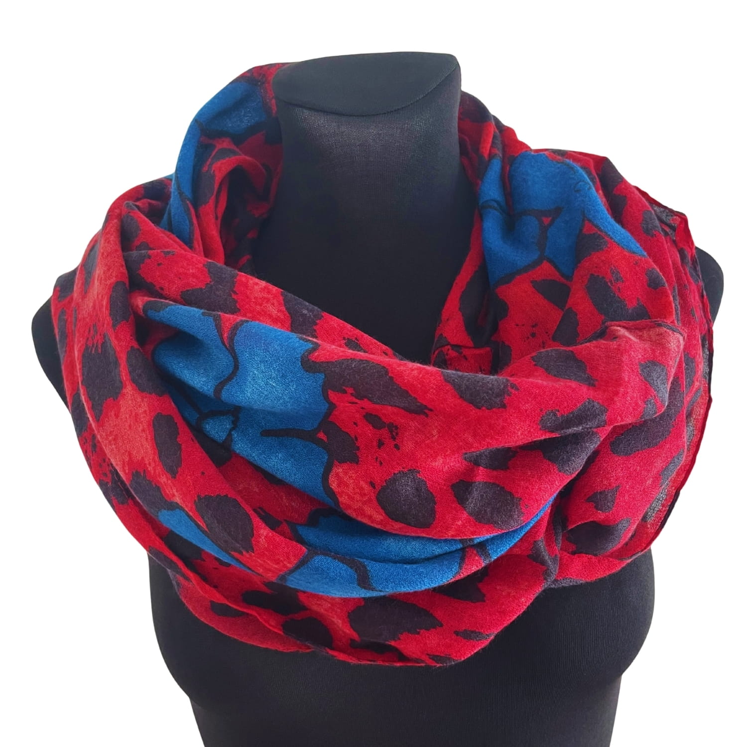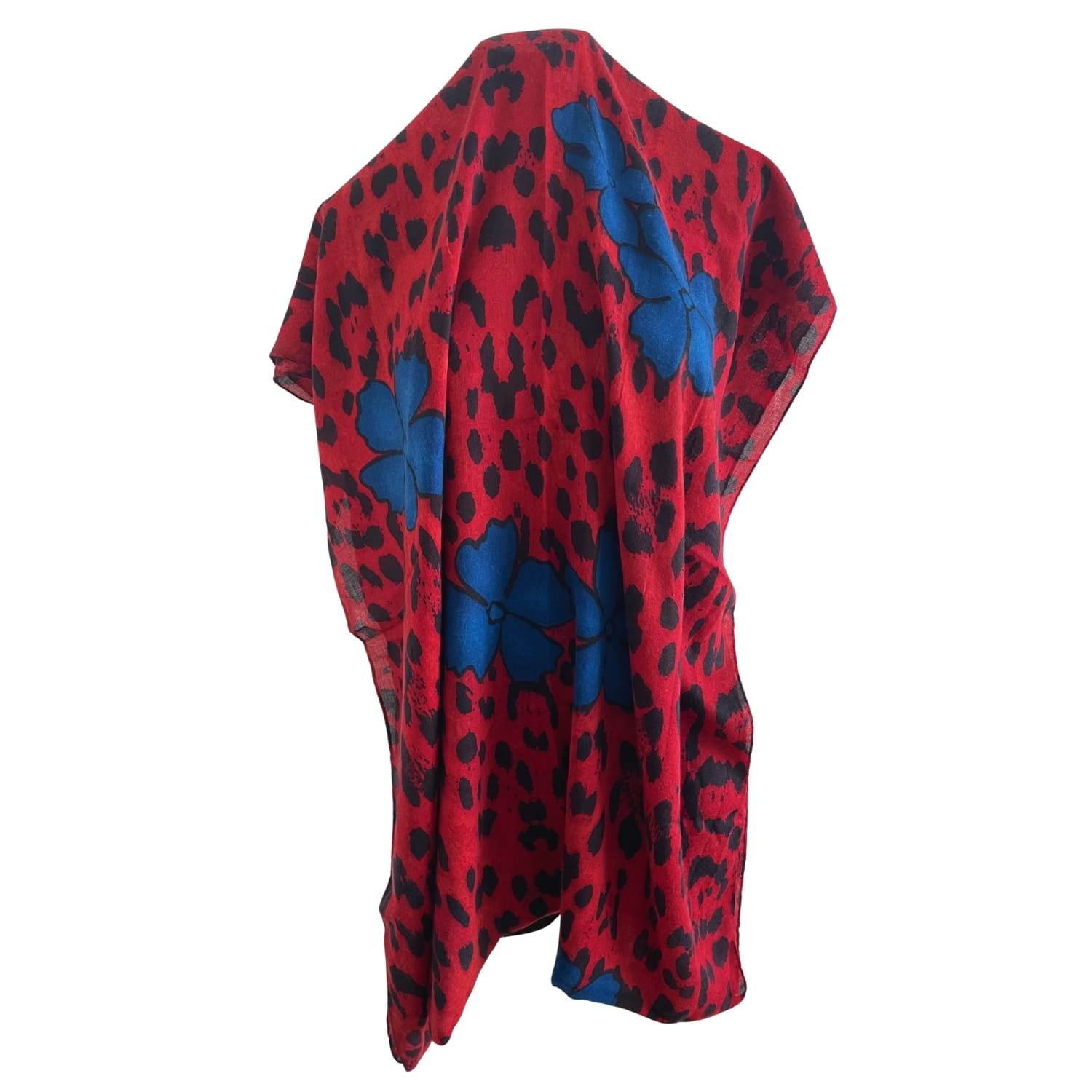 Czerwony damski szal komin w panterkę, z dużymi niebieskimi kwiatami - ok. 95 x 70 cm