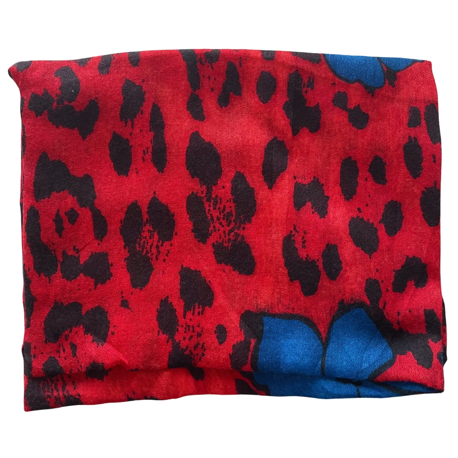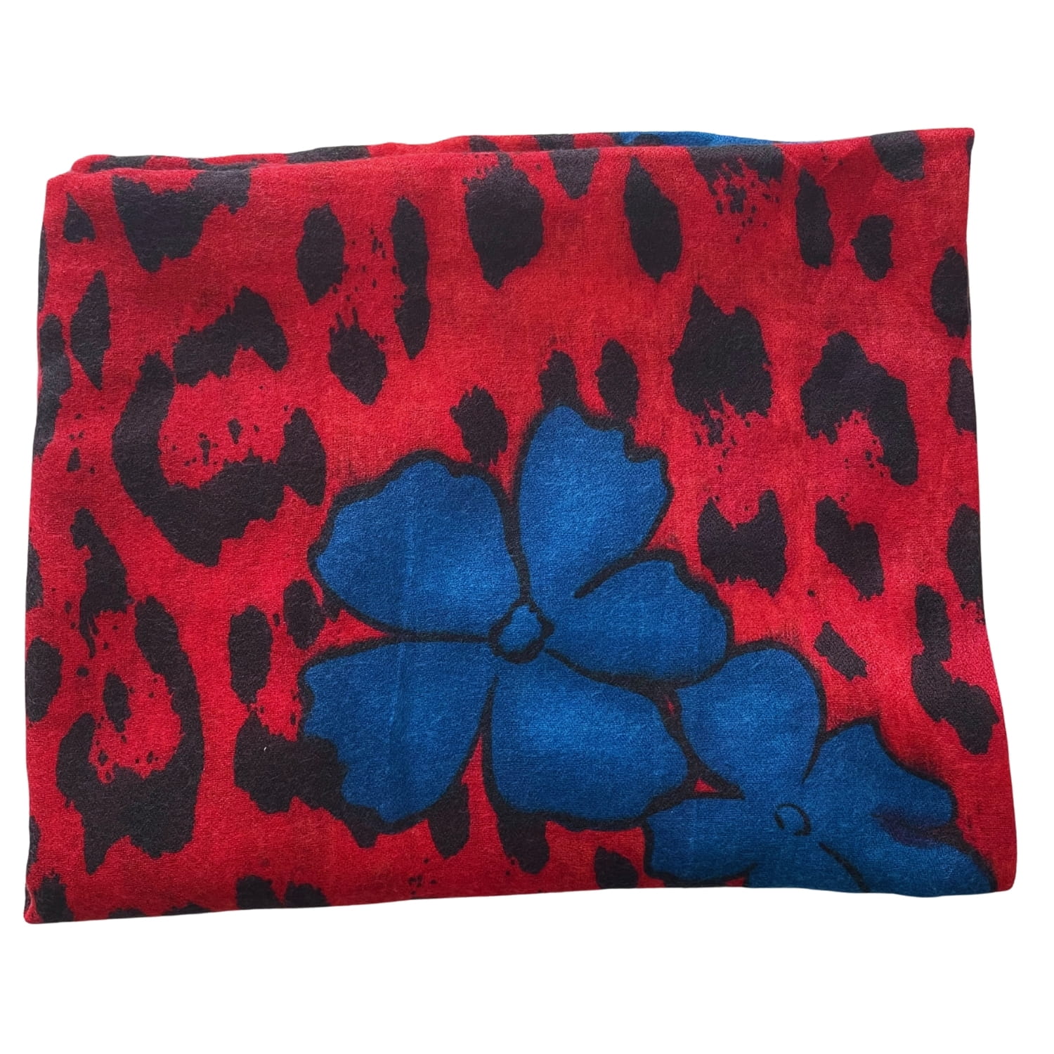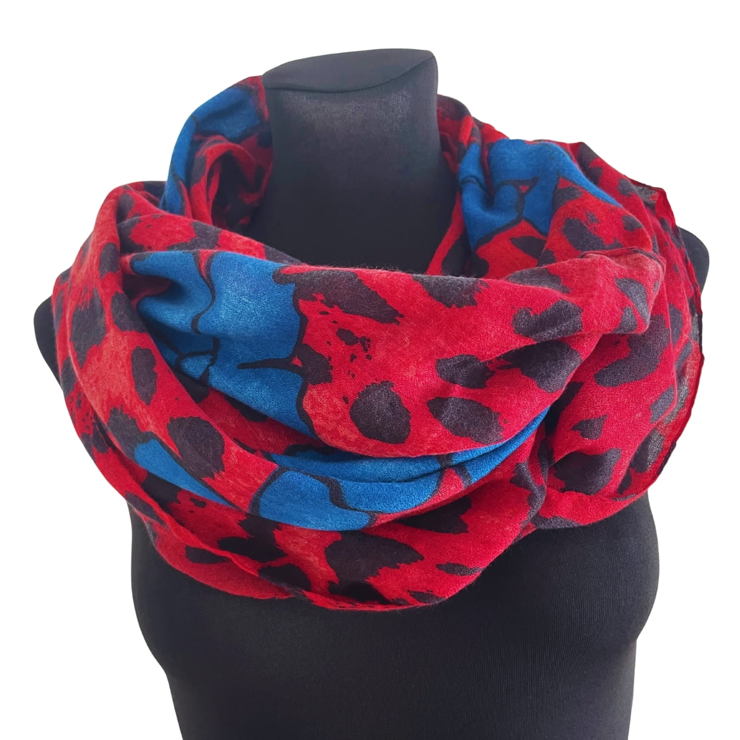 Czerwony damski szal komin w panterkę, z dużymi niebieskimi kwiatami - ok. 95 x 70 cm
