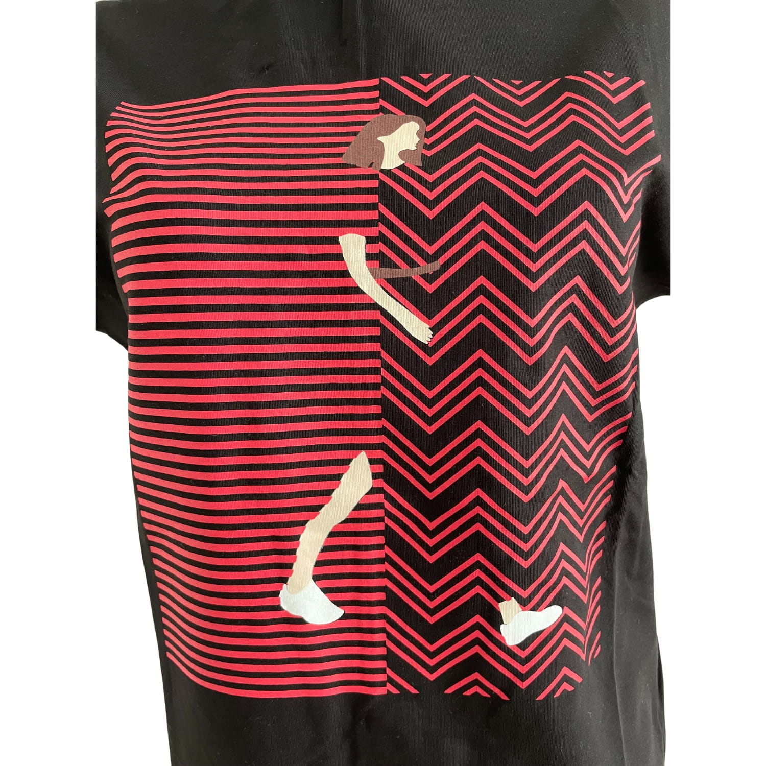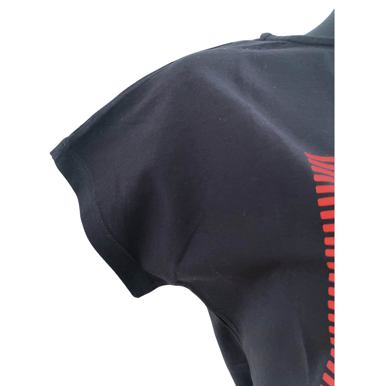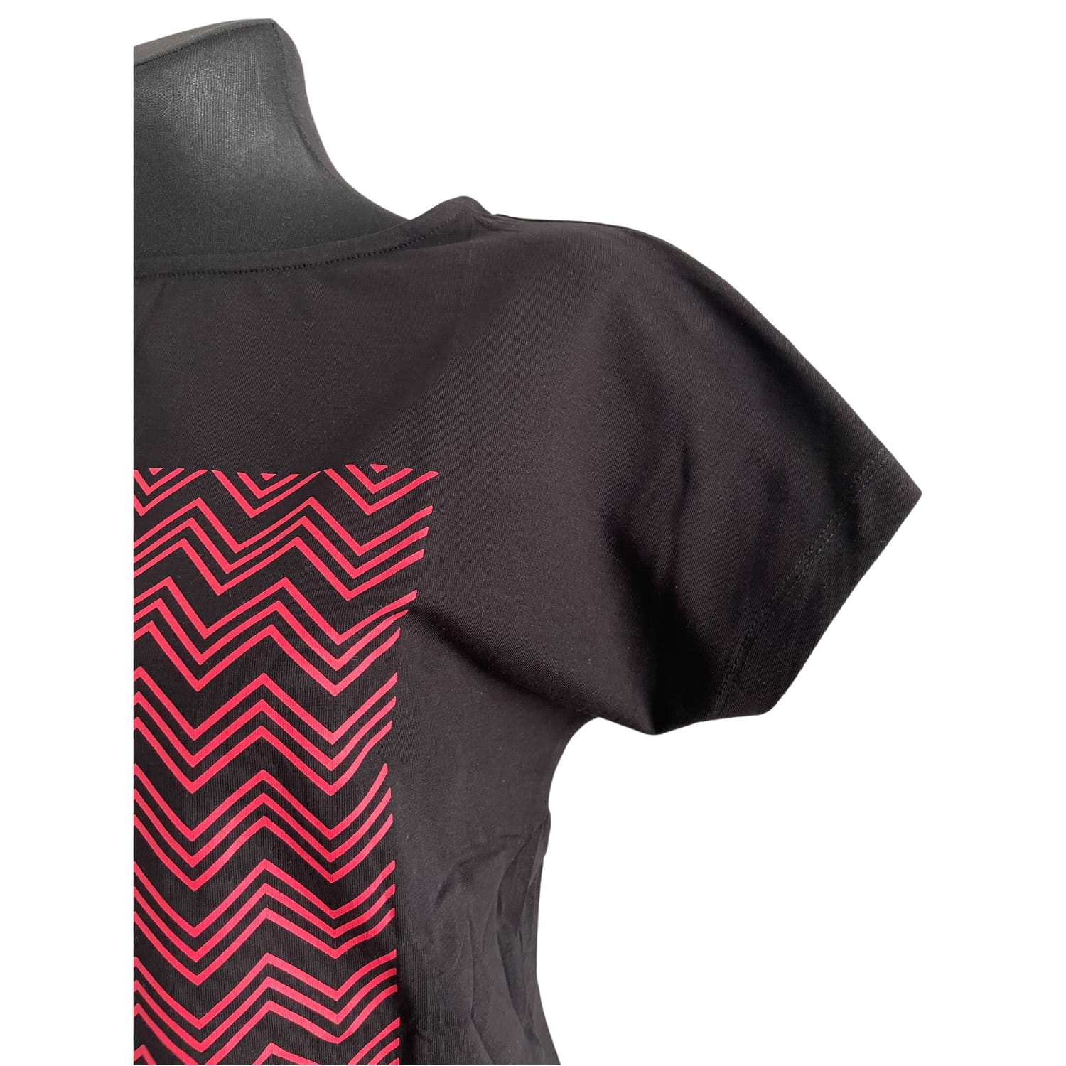 Damska bluzka t-shirt w czarnym kolorze, z czerwonym nadrukiem, z zygzakami i postacią kobiety, z krótkim rękawem - r. uniwersalny