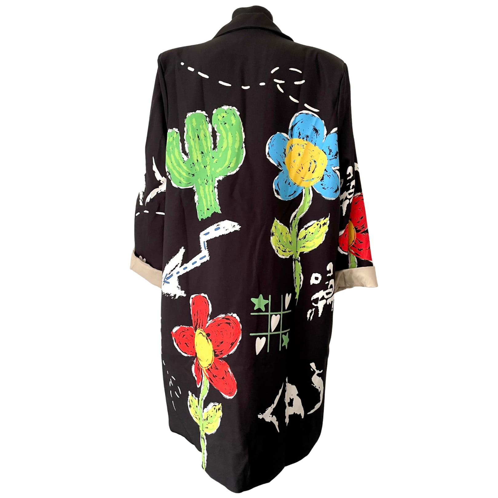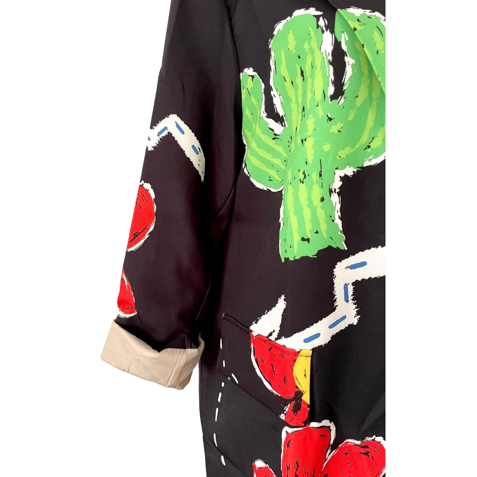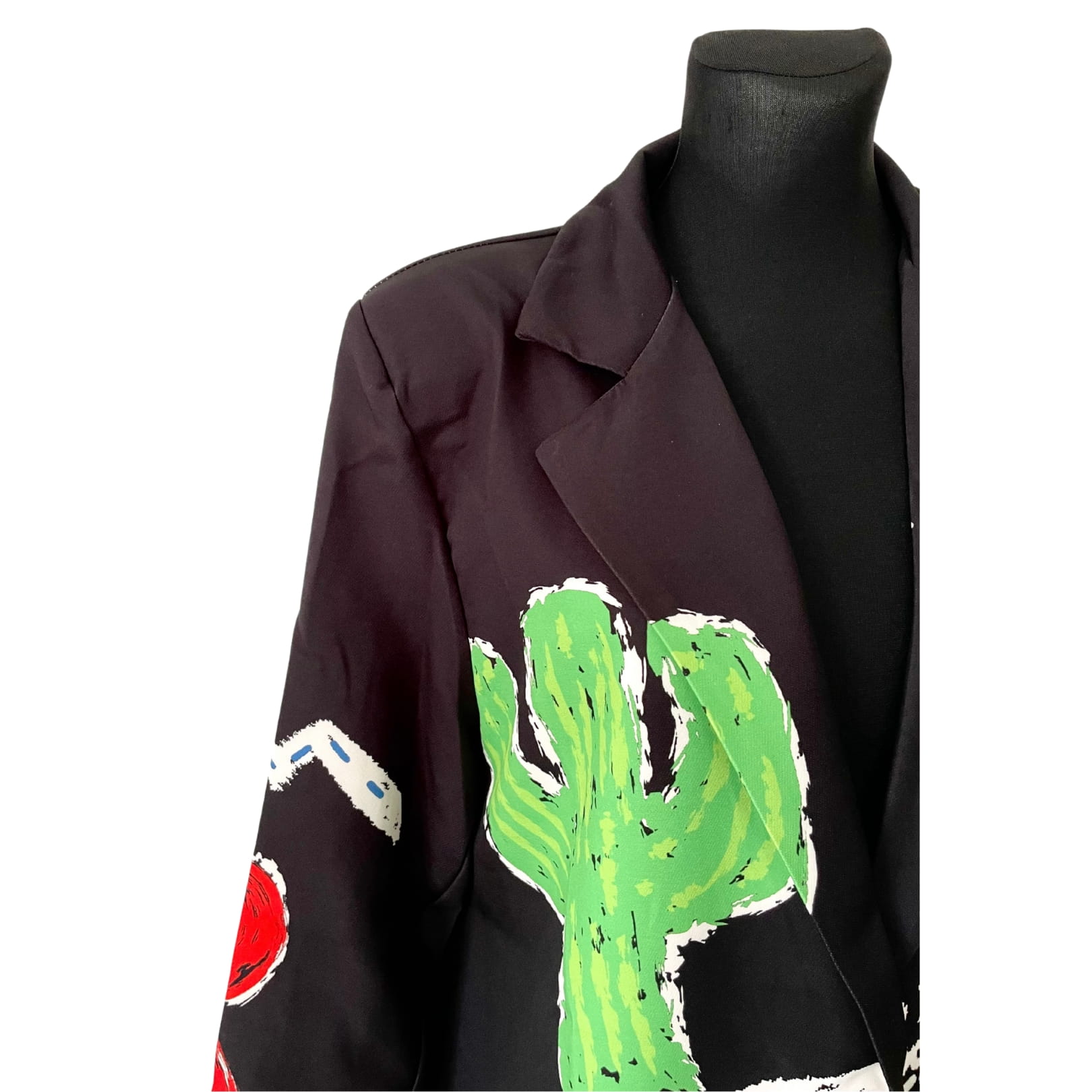 Długa awangardowa damska czarna włoska marynarka w kolorowe wzory kaktusów i kwiatów, z długim rękawem - r. uniwersalny