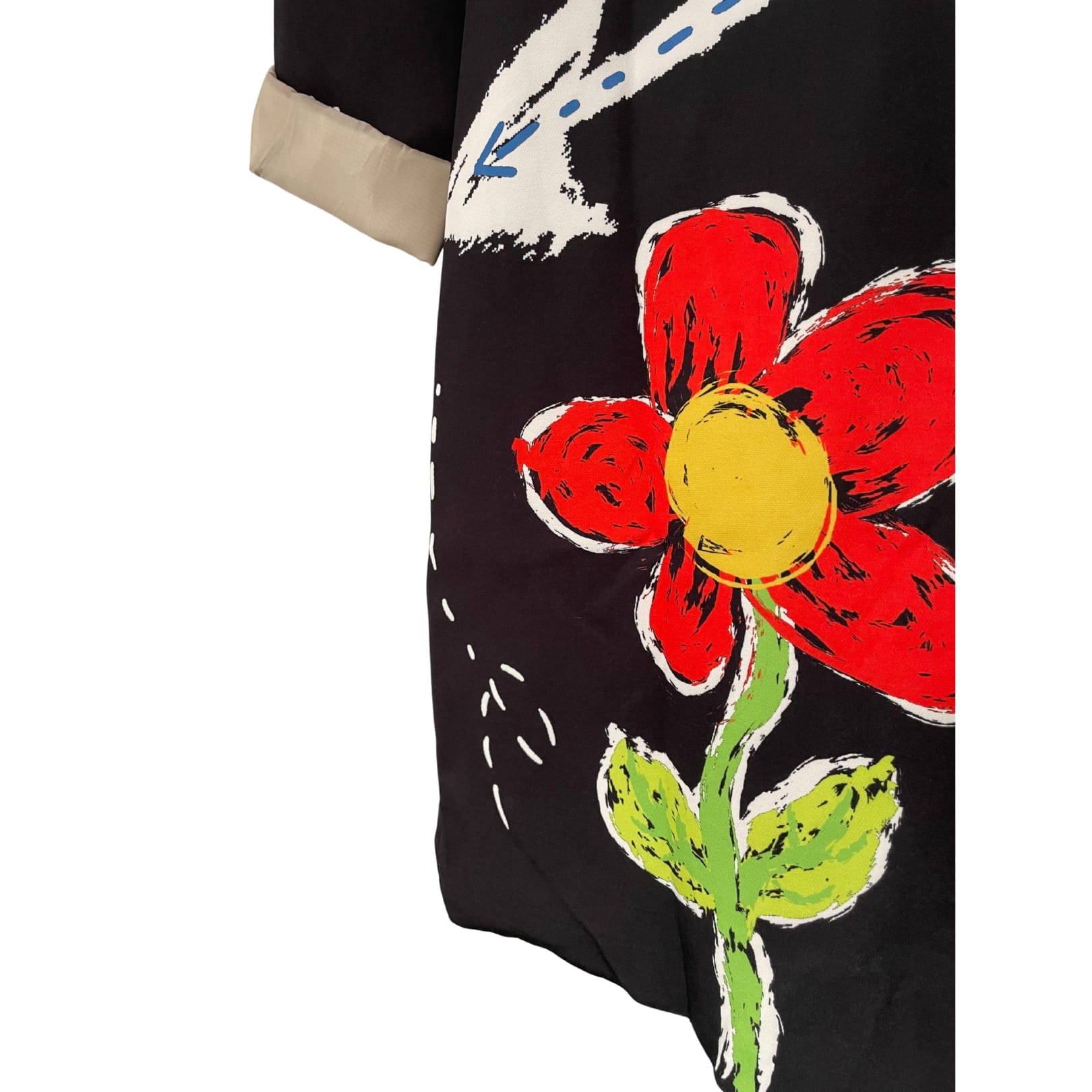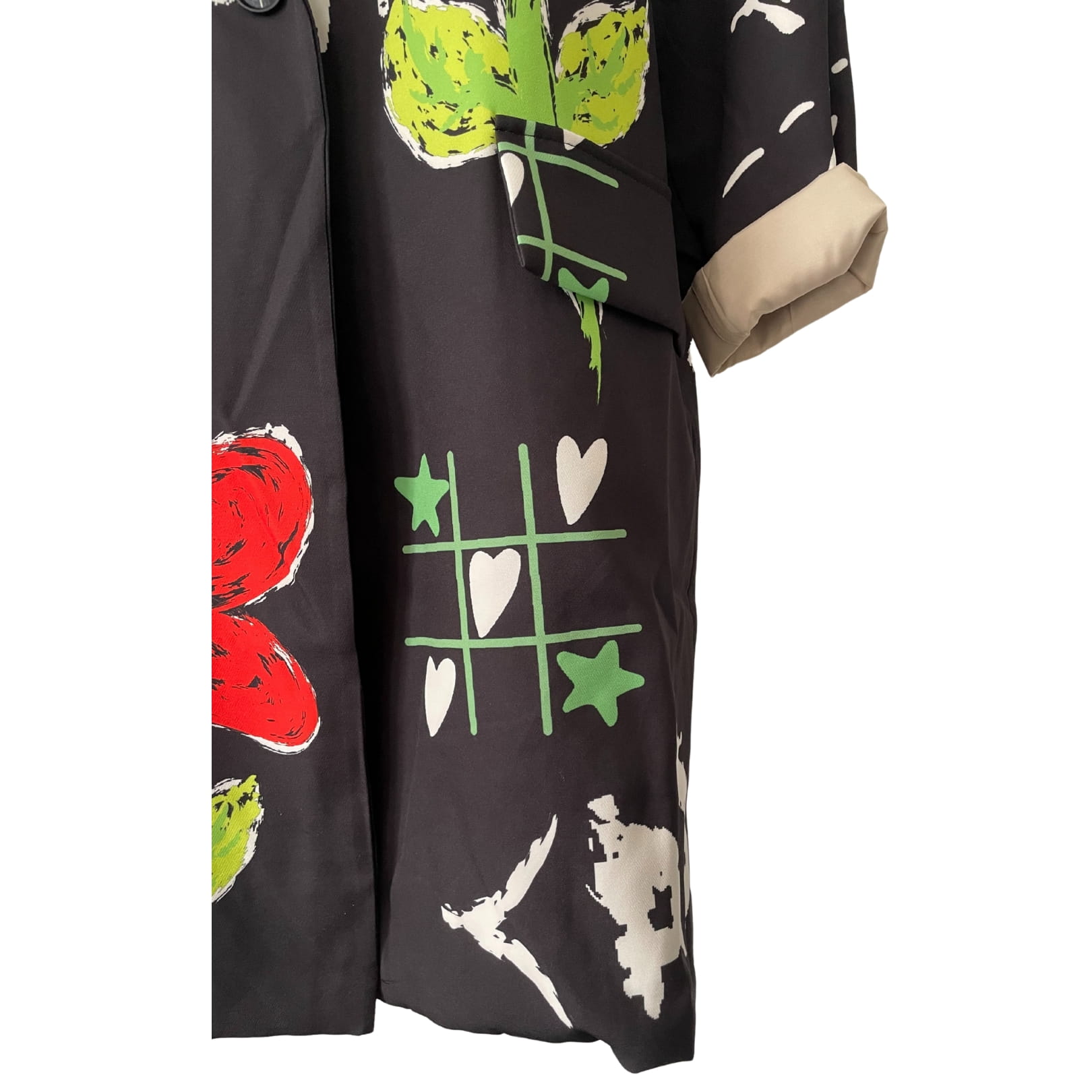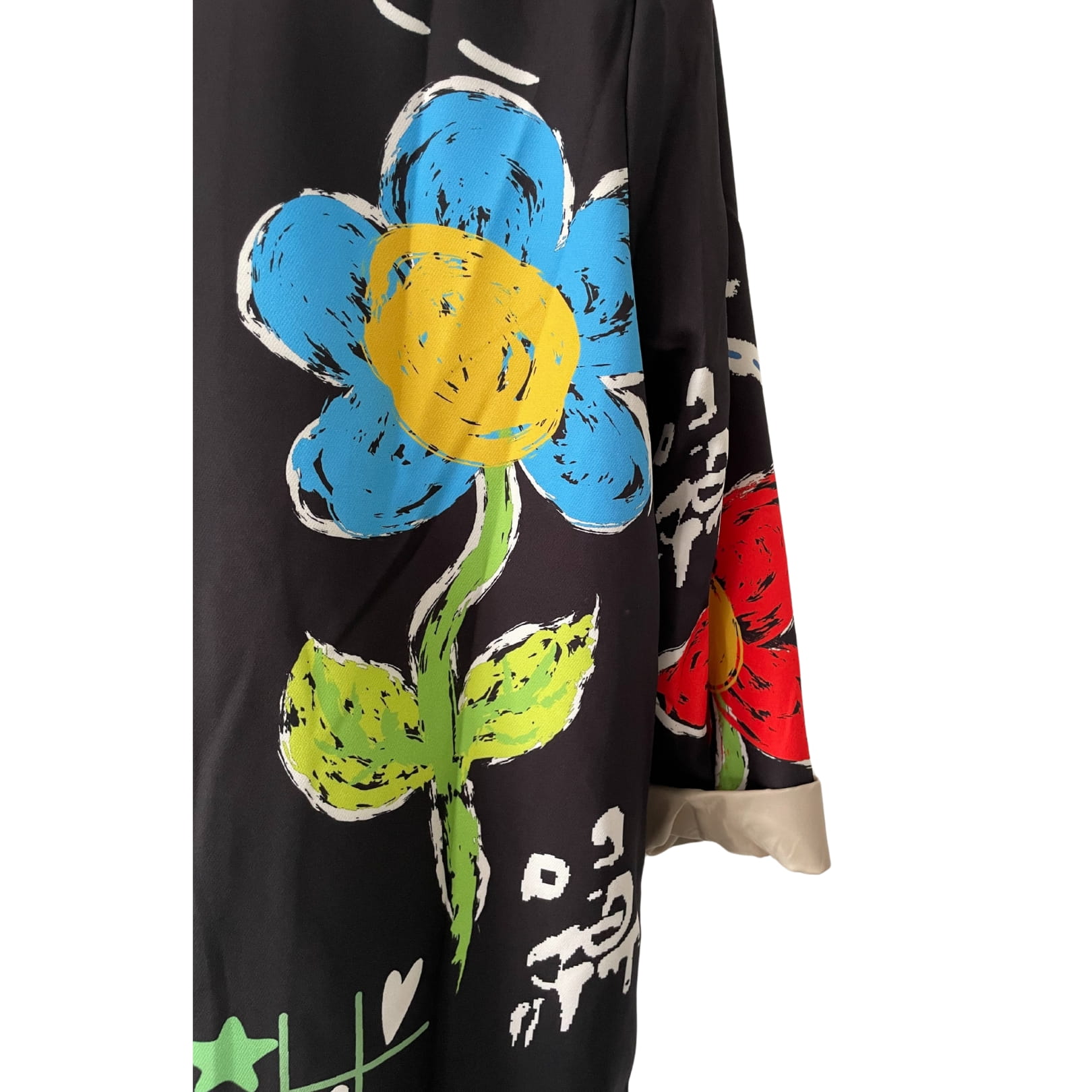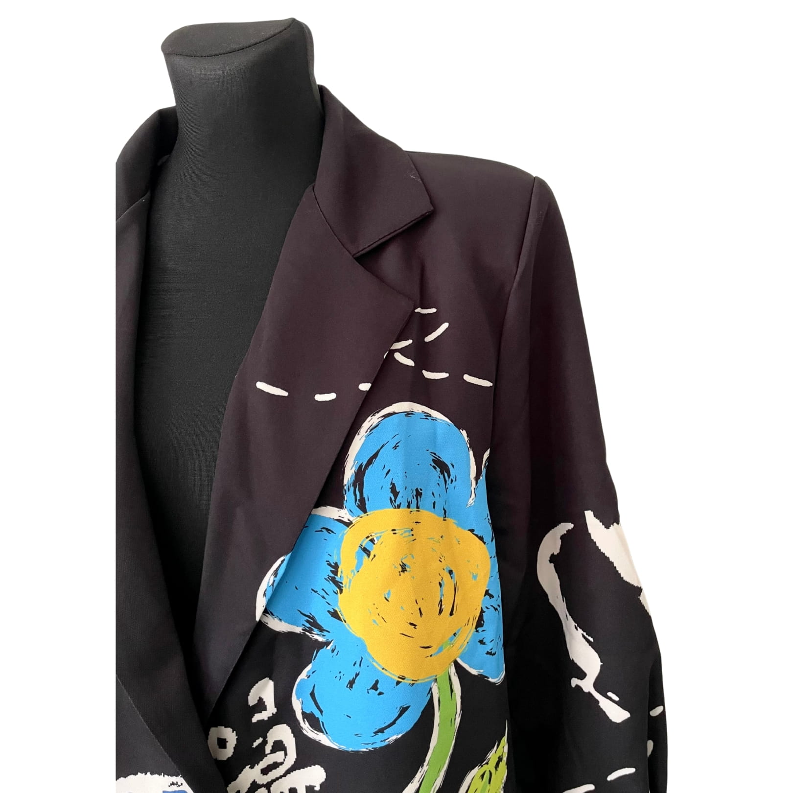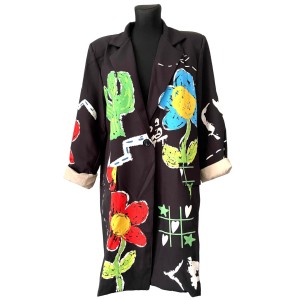 Długa luźna czarna awangardowa włoska marynarka w kolorowe wzory i kwiaty