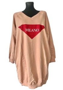 Długa beżowa luźna damska bluza/ sukienka z czerwoną aplikacją z napisem "Milano" z kryształkami, z kieszeniami i długim rękawem - r. uniwersalny